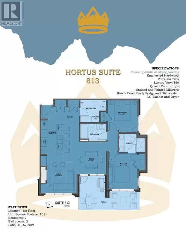 ** BOOK YOUR PRIVATE TOUR OF THE SHOW SUITE TODAY! ** Ground-Floor Unit with Stunning Views!âWelcome to Unit 813 in the newly released Hortus Building by The Canmore Renaissance, located in the heart of Three Sisters Mountain Village. This beautifully designed ground-floor unit offers 953 sq ft of elevated living space, perfectly positioned along the Three Sisters Parkway, just minutes from Stewart Creek Golf Course and surrounded by breathtaking Rocky Mountain views. This 2-bedroom, 2-bathroom residence features a spacious and functional layout, including a primary suite with a 4-piece ensuite, a comfortable guest bedroom, and a second full 4-piece bathroom. The luxury kitchen showcases quartz countertops, stained and painted millwork, and premium appliances including a panel-ready Bosch fridge and dishwasher, complemented by an LG washer and dryer. Interior finishings include "Alpine" palette, engineered hardwood, porcelain tile, and luxury vinyl tile. Enjoy the outdoors on your 167 sq ft private patio, with convenient access from this ground-floor, pet- and kid-friendly unit. Residents also benefit from shared amenities in the nearby Abruzzo Building, including underground parking, a fitness centre, and a recreation lounge. There are a total of 8 luxury residences available in the Hortus Buildingâplease reach out for full availability and details. Whether you're seeking a mountain retreat or full-time living, this is a rare opportunity in one of Canmoreâs premier new developments. book your showing today! (id:27476)
