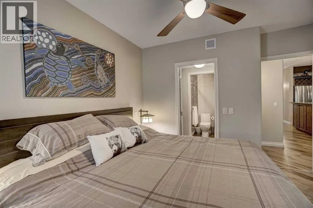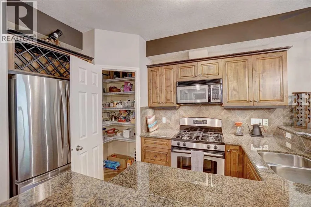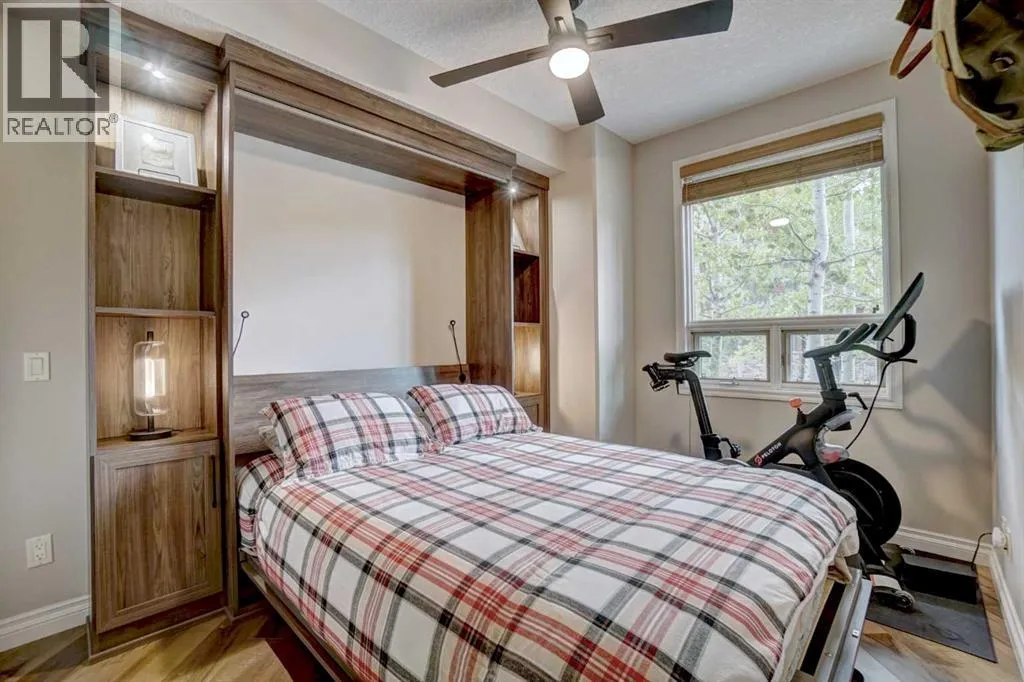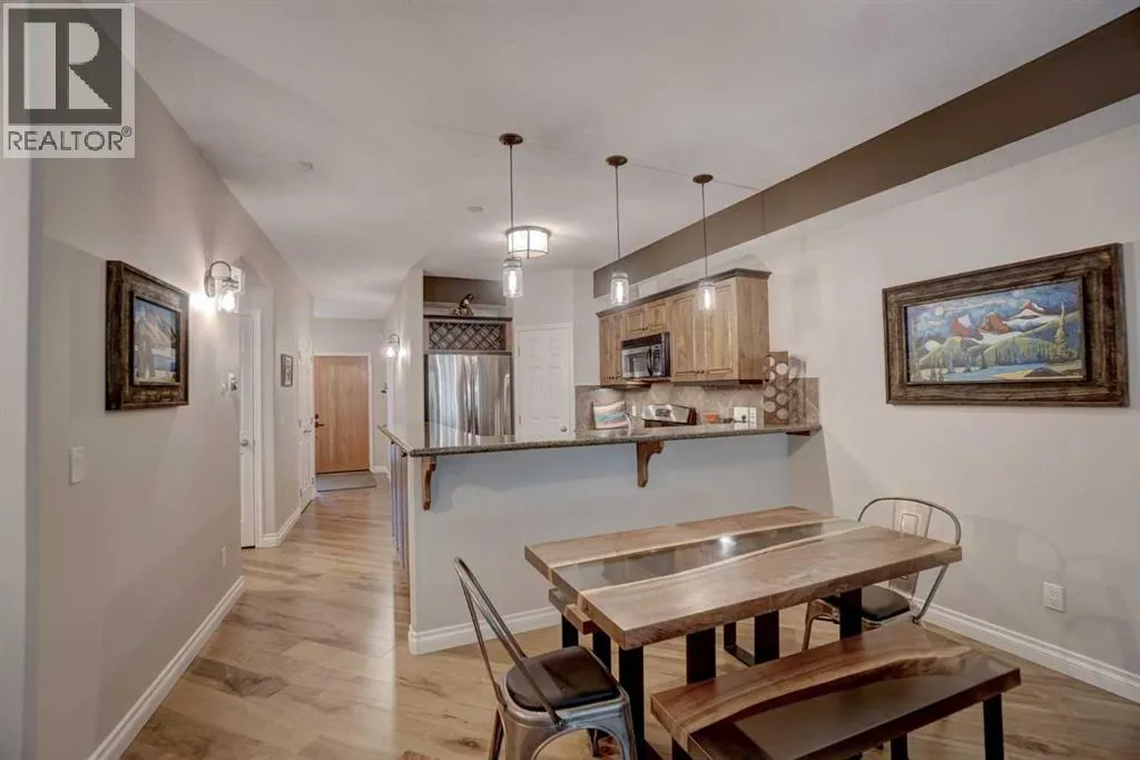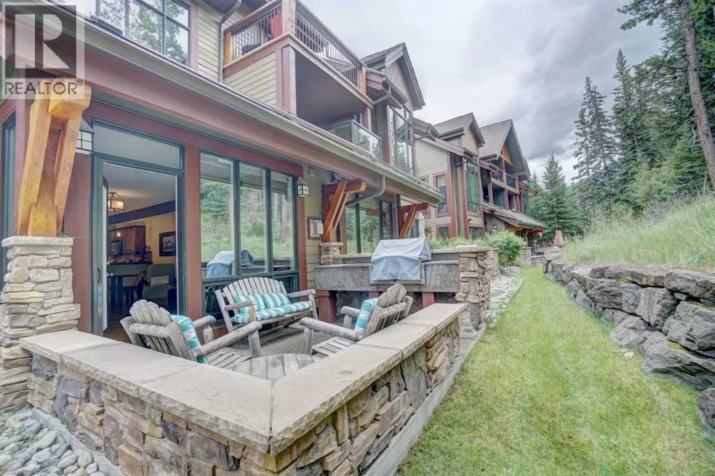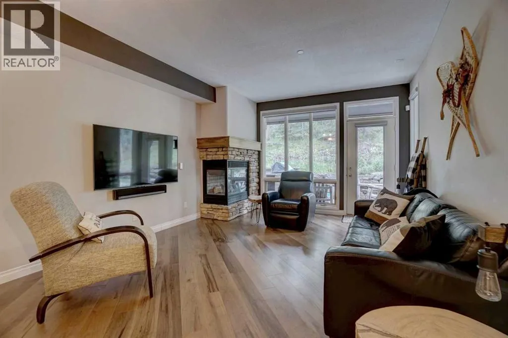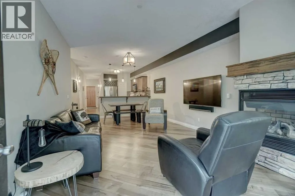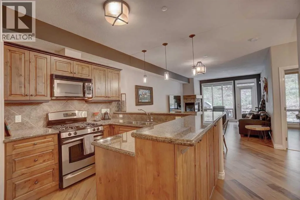 This 2 bedroom, 2 full bathroom Built Green apartment in The Portal at Three Sisters offers modern mountain luxury in a quiet setting. A 2-sided gas fireplace accents the open concept living room and dining room. Enjoy in-floor heating under engineered hardwood flooring, run by tankless on-demand hot water. The well equipped, modern kitchen has stainless appliances and granite counters. The large patio, accessed from the living room, has a built in gas BBQ with granite surround. Backing onto trees and the 2nd fairway of the Stewart Creek golf course, the patio is private and quiet. The primary bedroom features a walk through closet and three piece ensuite bathroom. There is a second bedroom with a murphy bed, offering flexible use. The closets feature California Closet organizers. Adjacent to the second bedroom is an updated 4 piece bathroom, and a large laundry / storage closet. This luxury condo has been well maintained, with only two owners since new! Two assigned parking stalls and a separate large assigned storage unit (set up to store four bikes plus other gear) in the secure underground parkade round out this amazing property! (id:27476)