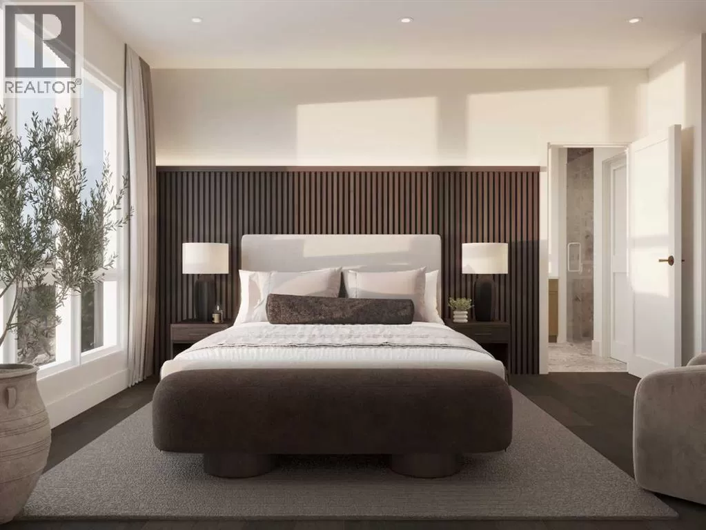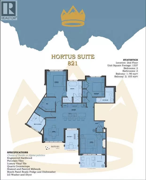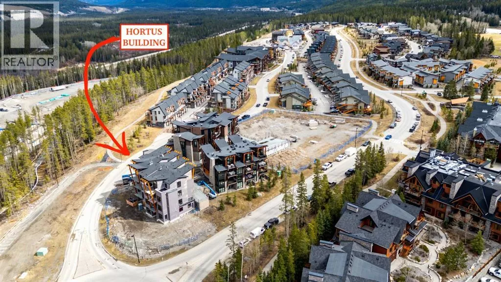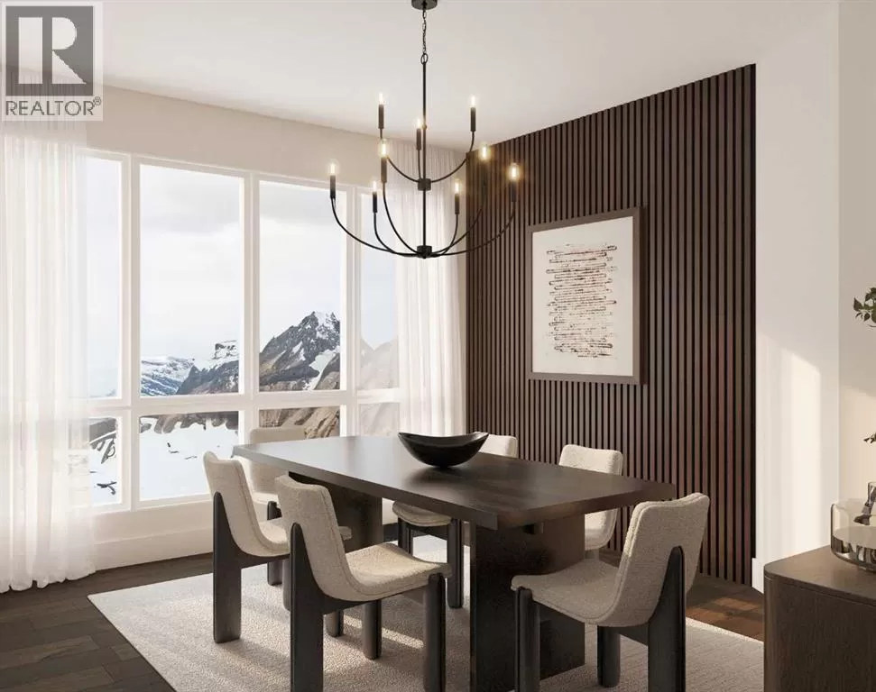 Welcome to Unit 821 in the newly released Hortus Building by The Canmore Renaissance, located in the heart of Three Sisters Mountain Village. This spacious 2-bedroom, 2-bathroom home is situated on the second floor and offers 1,537 sq ft of interior living space paired with two private balconies to capture the surrounding mountain views. The interior features a luxurious primary suite with a spa-inspired 5-piece ensuite, a generous guest bedroom, and a second full 4-piece bathroom. The chefâs kitchen is designed with quartz countertops, panel-ready Bosch appliances, stained and painted millwork, and "Alpine" design palette. Additional highlights include engineered hardwood, porcelain tile, luxury vinyl tile, and an LG washer and dryer. The pet- and kid-friendly building provides access to premium amenities in the nearby Abruzzo Building, including underground parking, a fitness centre, and a shared recreation lounge. As a special incentive, the developer is offering a free 1-year Stewart Creek Golf Club membership to the first buyers who go firm on a unit. Private tours of the show suite are available by appointment. With only 8 luxury residences in the Hortus Building, each offering unique layouts and views, this is a rare opportunity to secure a premier home in one of Canmoreâs most desirable developments. (id:27476)