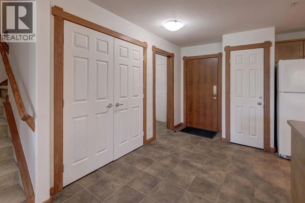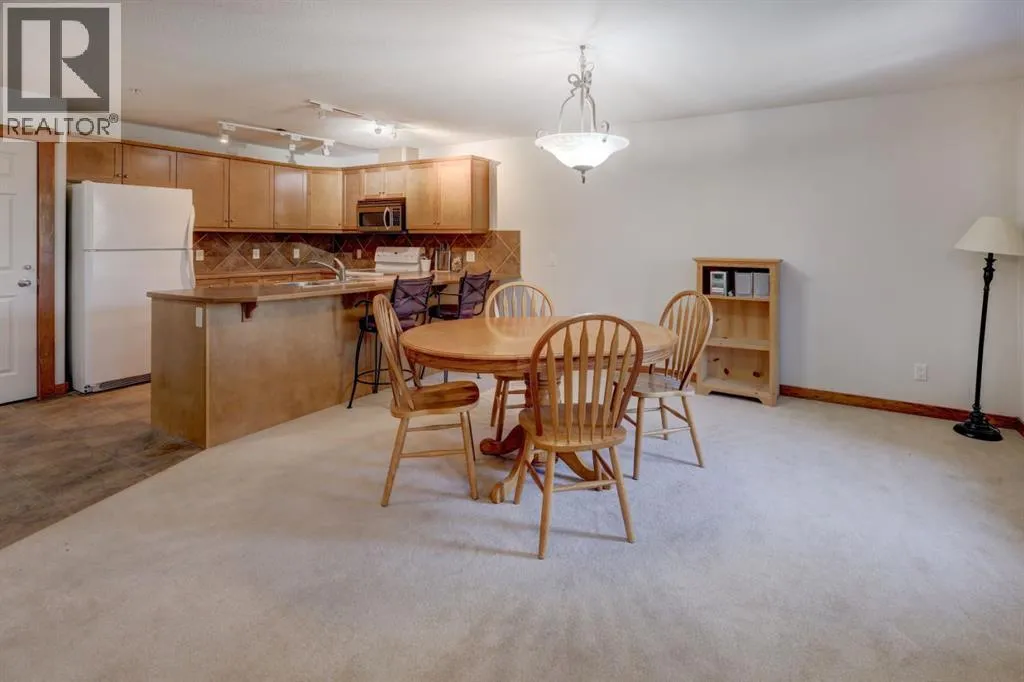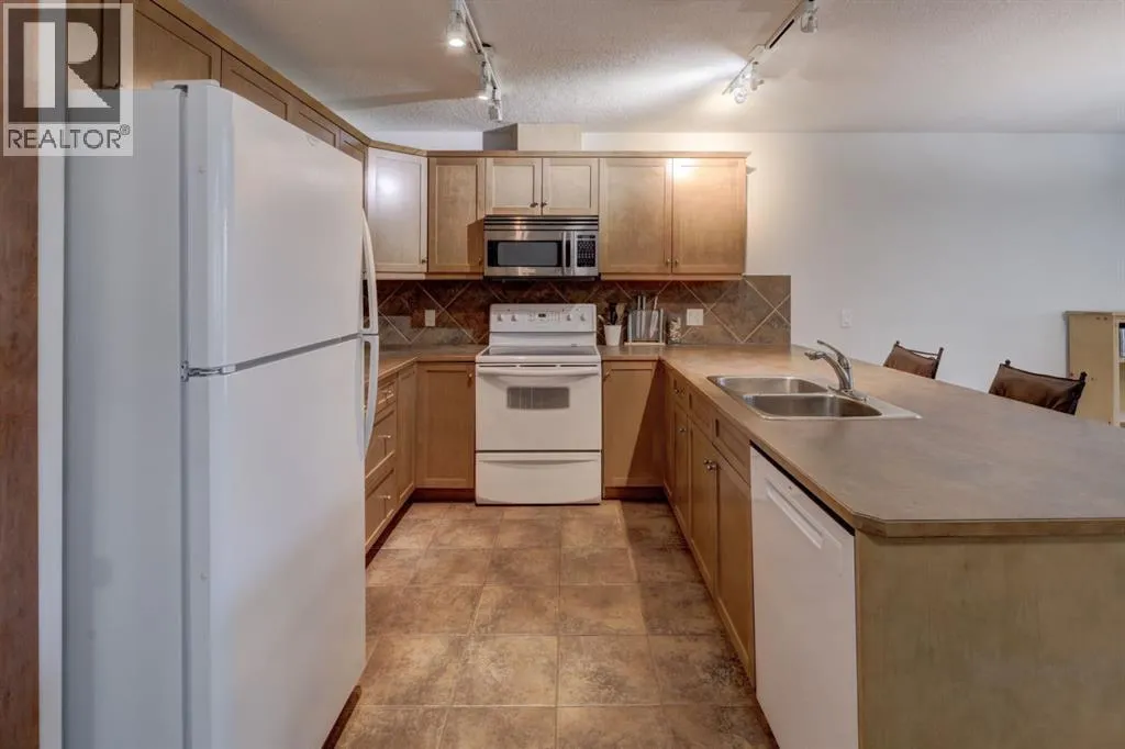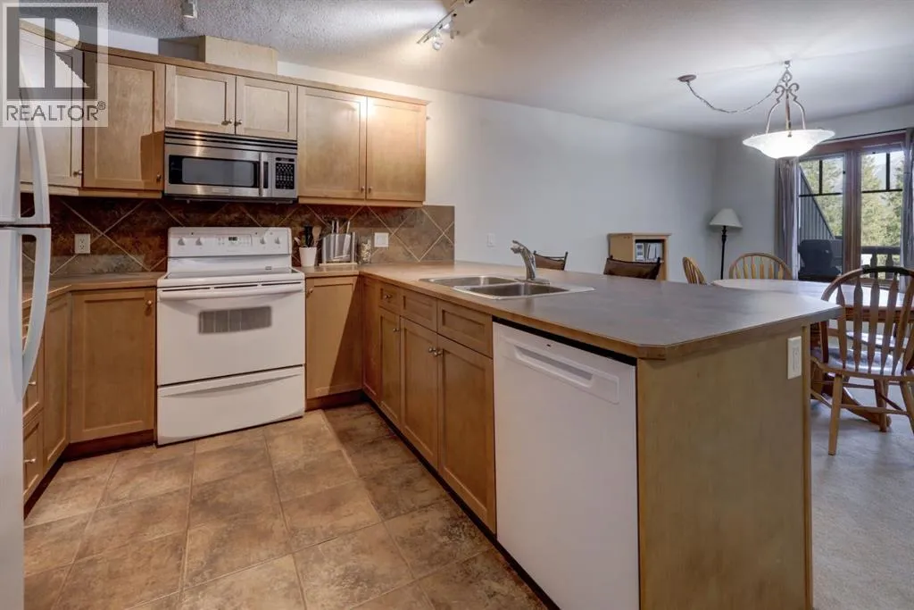 Freshly painted two bedroom apartment In Crossbow Landing! Discover mountain living at its finest in this two bedroom, two bathroom property nestled in the heart of Three Sisters Mountain Village. This bright and airy condo features an open-concept kitchen flowing seamlessly into a generous dining and living area, complete with a cozy rock-surround gas fireplace. Step out onto the private deck and soak in breathtaking mountain views. The expansive primary bedroom includes an ensuite, while another bedroom and second full bathroom offer ample space for family, guests, or a home officeâperfect for both weekend getaways and full-time living. Enjoy the convenience of secured underground parking, additional storage for your mountain gear and access to a beautifully appointed amenities building featuring a games room, fitness centre and hot tub. Ideally located just steps from scenic trails, the Bow River and Stewart Creek Golf Course, this home offers the perfect balance of adventure and relaxation. (id:27476)