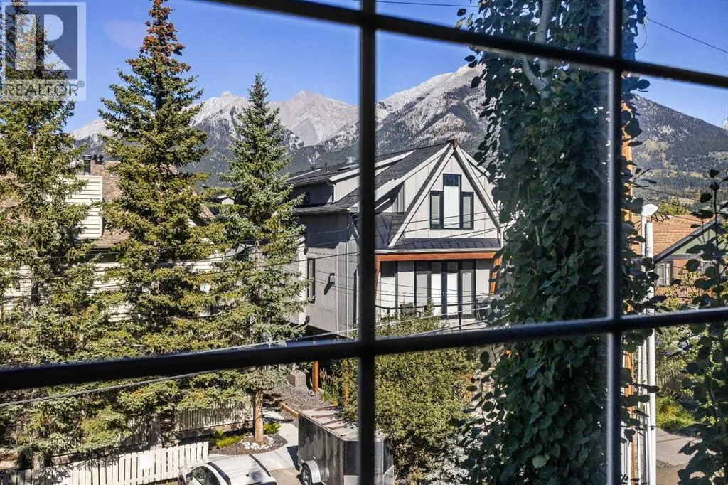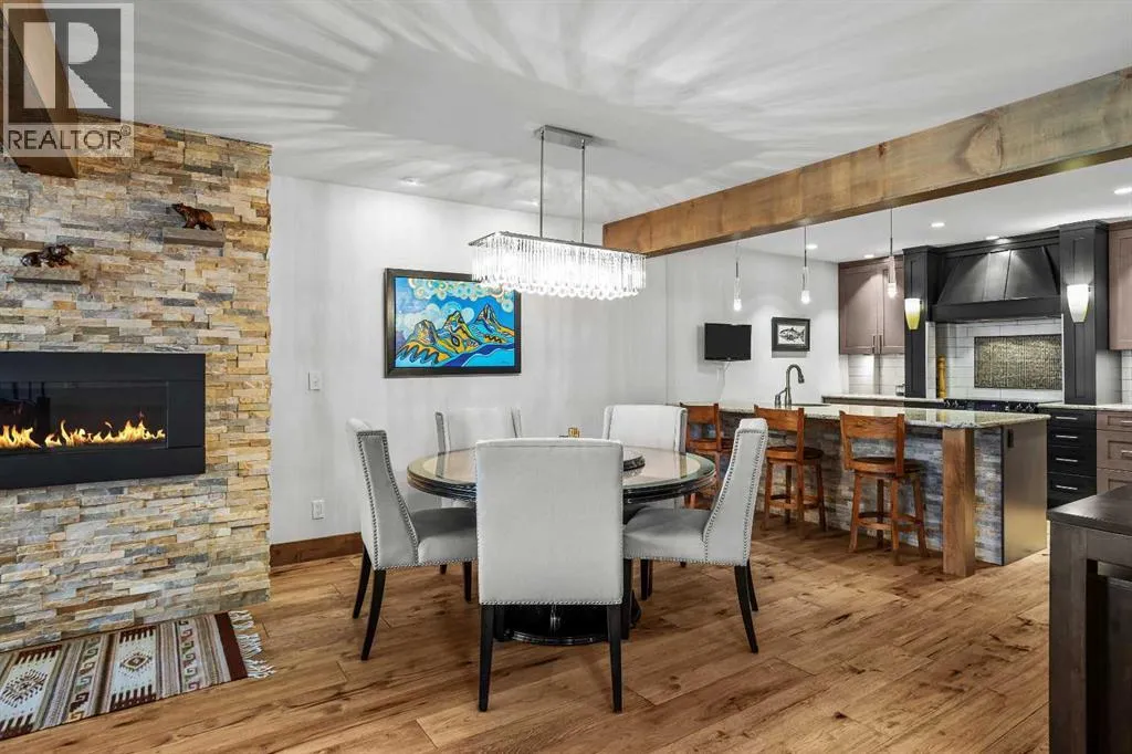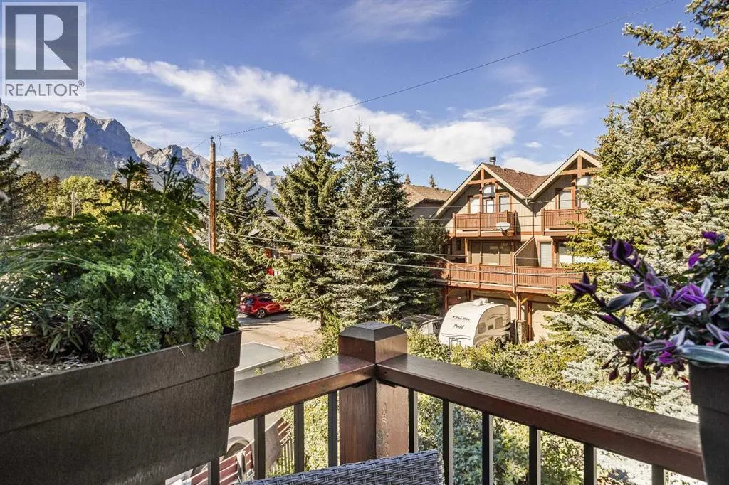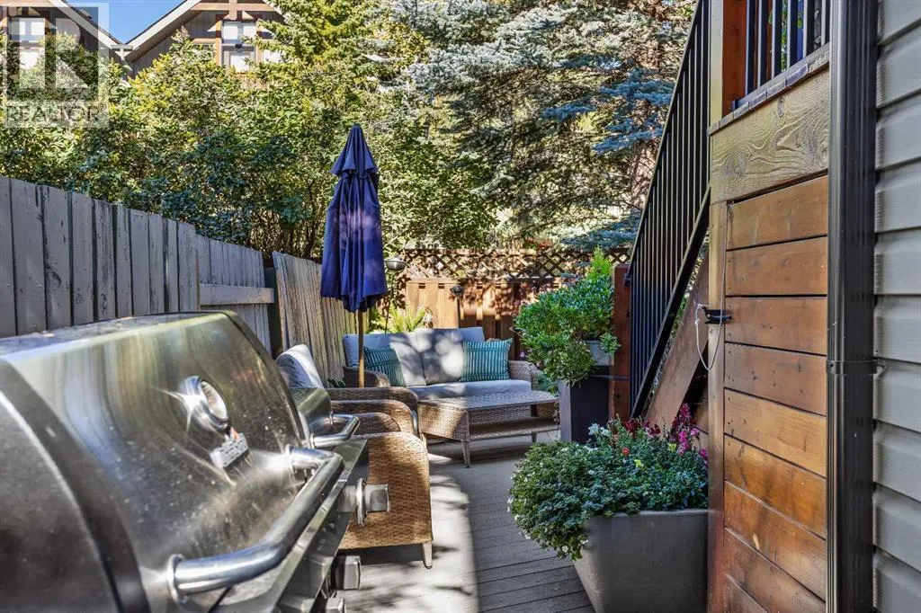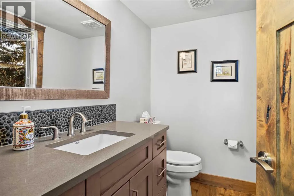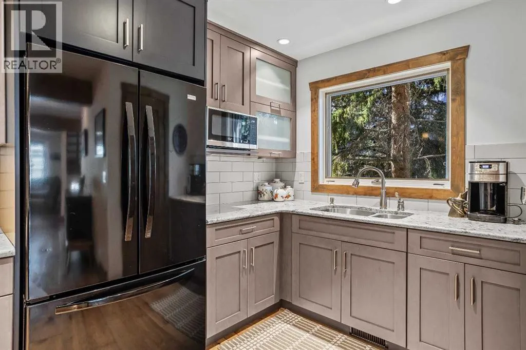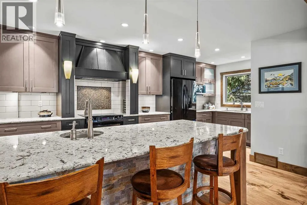 Located in desirable South Canmore. This 3 bedroom, 4 bathroom 1767 sq ft townhouse is well maintained. Welcome to a completely renovated home with meticulous woodwork, from the hickory floors on the main level to the custom knotty Adler doors and trim throughout. Open stairs to maximize the light and spaciousness. Each of the 2 bedrooms on the top floor have full bathrooms with laundry. The lower level is a media room or bedroom with full bathroom and in-floor heating, with a wet bar and a granite counter. The kitchen is professionally designed including 2 sinks, quartz countertops on the island and cabinet areas. The living room has a gas fireplace and open concept through to the dining room and kitchen. Outside there is a ground level sitting area or a cozy balcony facing west off the 2nd floor. Secured outside storage for bicycles and seasonal equipment. There is a single car garage plus a driveway to accommodate 2 cars. (id:27476)