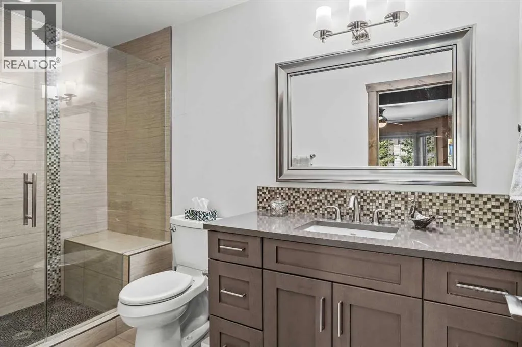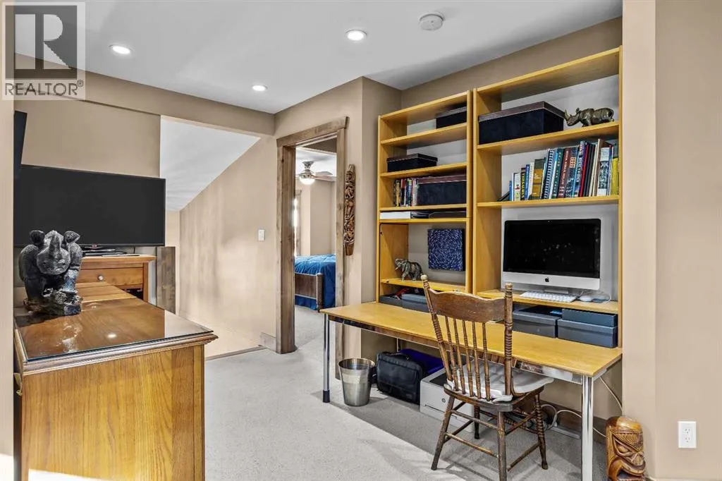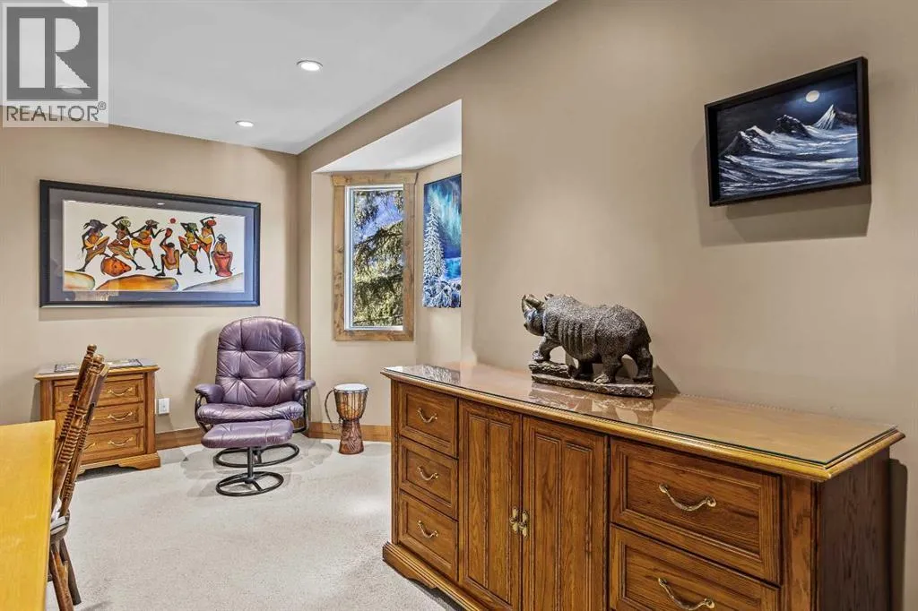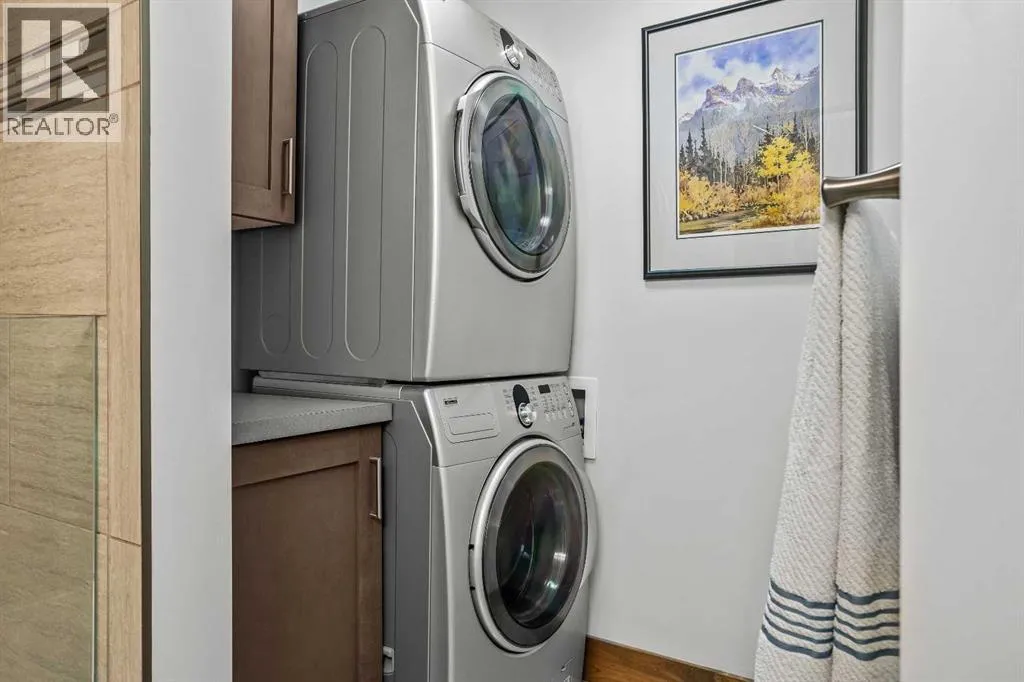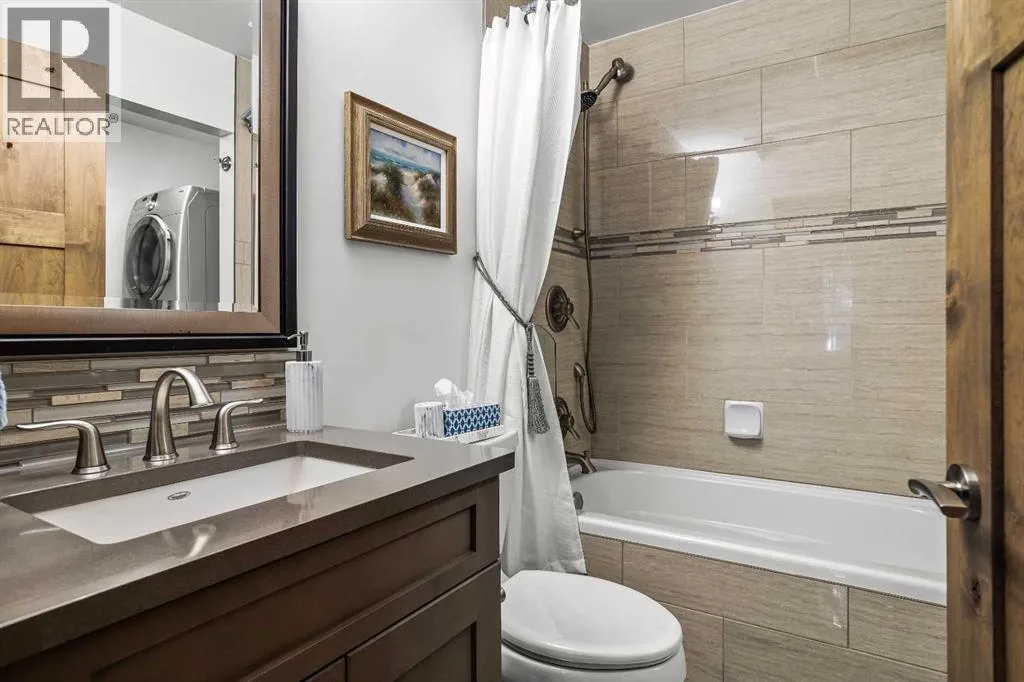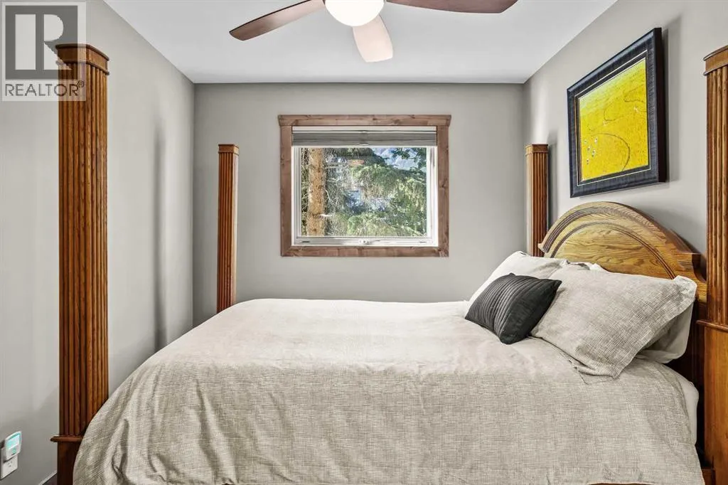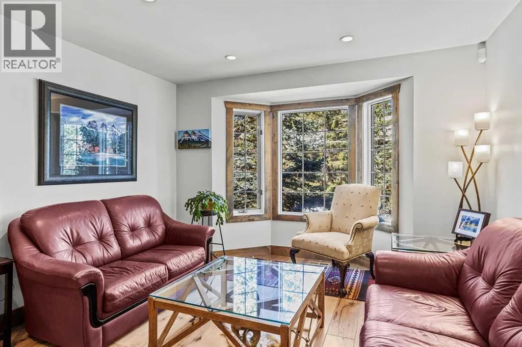 Located in desirable South Canmore. This 3 bedroom, 4 bathroom 1767 sq ft townhouse is well maintained. Welcome to a completely renovated home with meticulous woodwork, from the hickory floors on the main level to the custom knotty Adler doors and trim throughout. Open stairs to maximize the light and spaciousness. Each of the 2 bedrooms on the top floor have full bathrooms with laundry. The lower level is a media room or bedroom with full bathroom and in-floor heating, with a wet bar and a granite counter. The kitchen is professionally designed including 2 sinks, quartz countertops on the island and cabinet areas. The living room has a gas fireplace and open concept through to the dining room and kitchen. Outside there is a ground level sitting area or a cozy balcony facing west off the 2nd floor. Secured outside storage for bicycles and seasonal equipment. There is a single car garage plus a driveway to accommodate 2 cars. (id:27476)