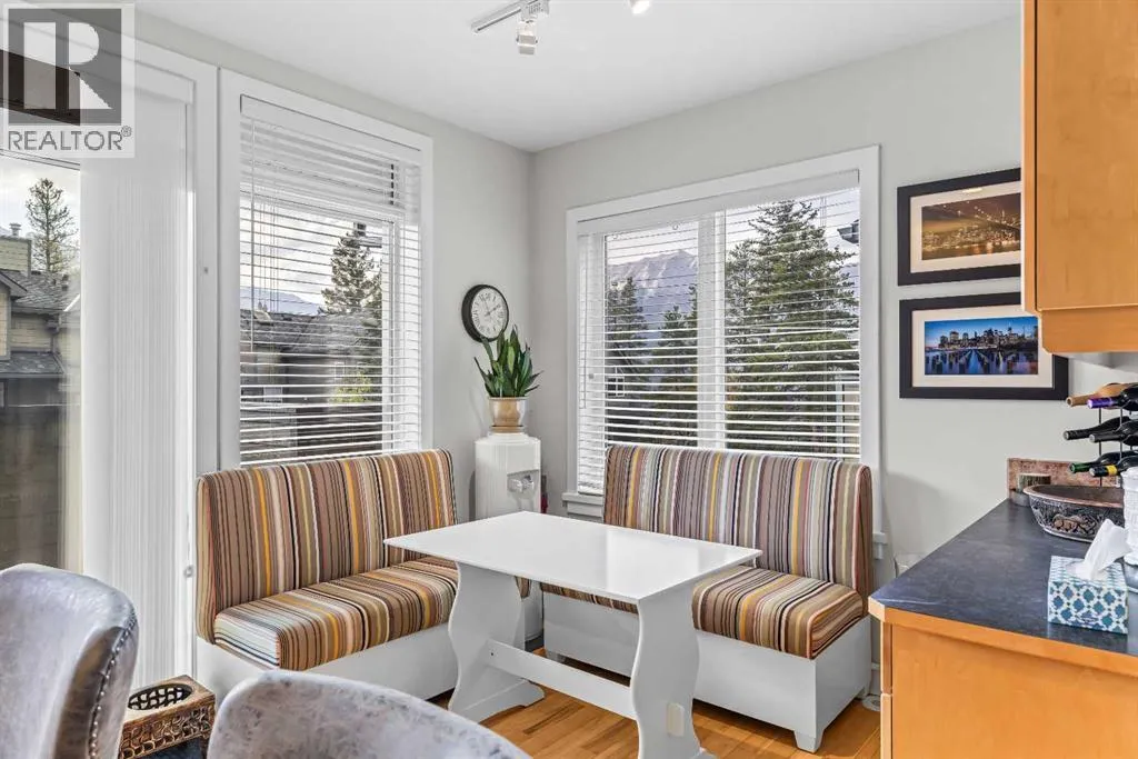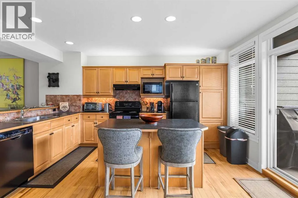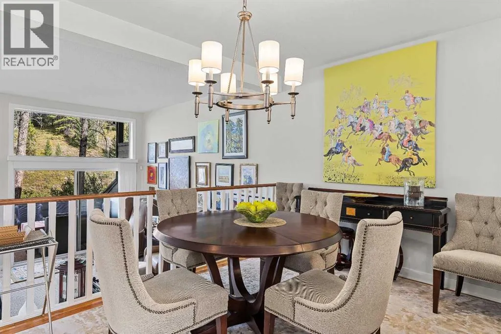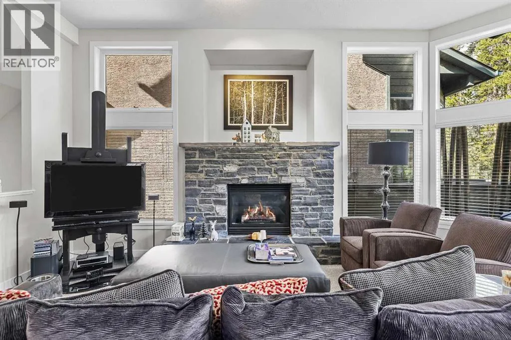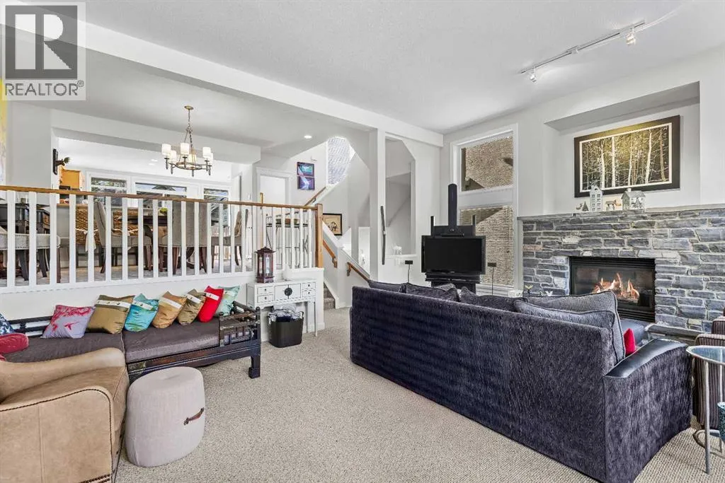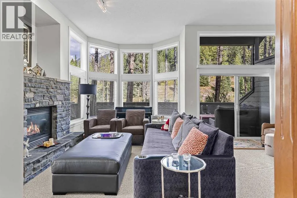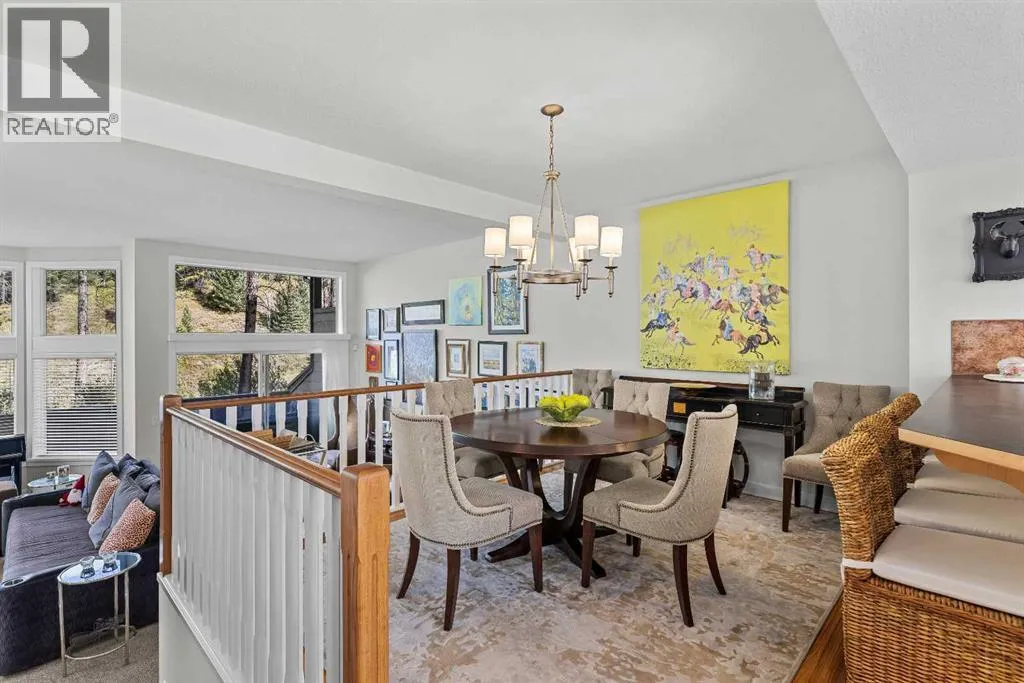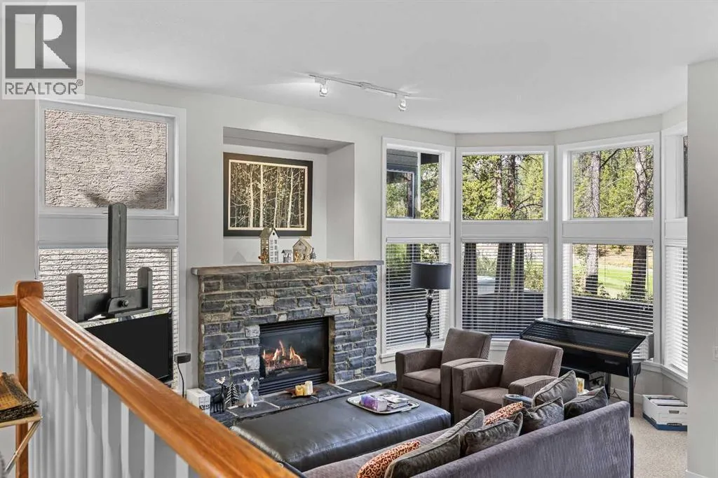 A rare opportunity awaits in Aspen Glen, Grizzly Ridge, a serene end unit townhome community tucked away along the coveted fairways of Silvertip Golf Course. This spacious 3-bedroom, 4-bathroom home combines mountain charm with thoughtful design, offering both privacy and spectacular views. Step inside to a bright and inviting entry, where skylights above the foyer and staircase flood the home with natural light. The sunken living room is the heart of the home, showcasing tall ceilings and a wall of windows that frame the tranquil golf course backdrop of hole number 1. A cozy fireplace adds warmth, while the spacious dining room and breakfast nook capture stunning mountain vistas, including the iconic Three Sisters. This home also has A/C for added comfort. Upstairs, youâll find two generously sized bedrooms, each with its own ensuite, plus the convenience of laundry on the same level. The lower level provides flexibility with an optional third bedroom or family room, complete with a second fireplace and access to a full 4-piece bathroom. Additional highlights include a double-car garage, abundant natural light throughout, and a floor plan designed to accommodate full-time living, weekend escapes, or hosting friends and family in style. Backed by golf course serenity and fronted by mountain views, this townhome delivers a lifestyle thatâs uniquely Canmore, peaceful, private, and perfectly located. (id:27476)