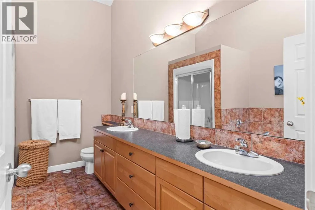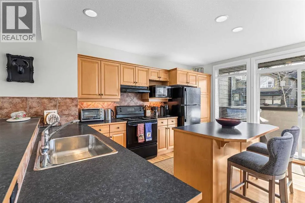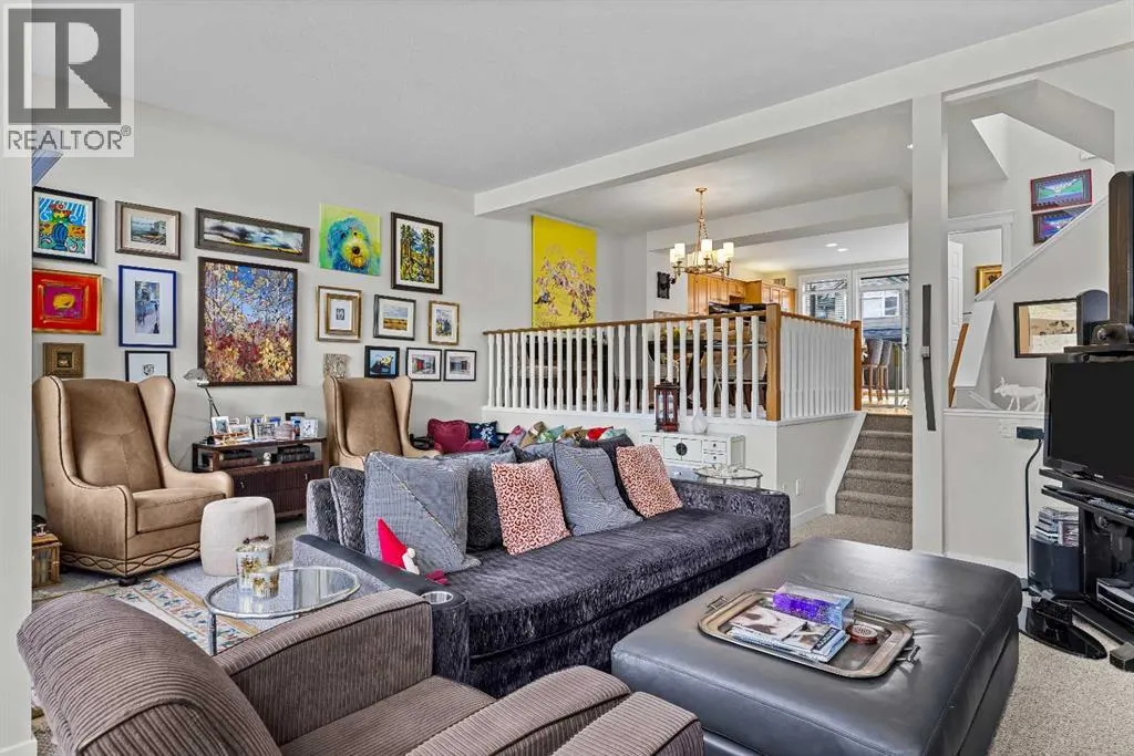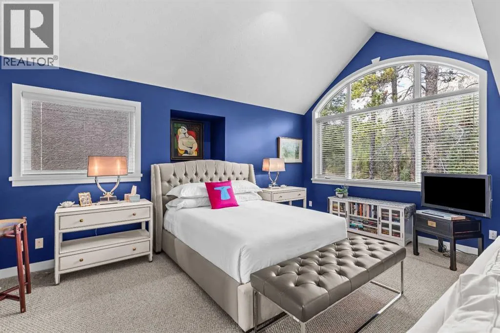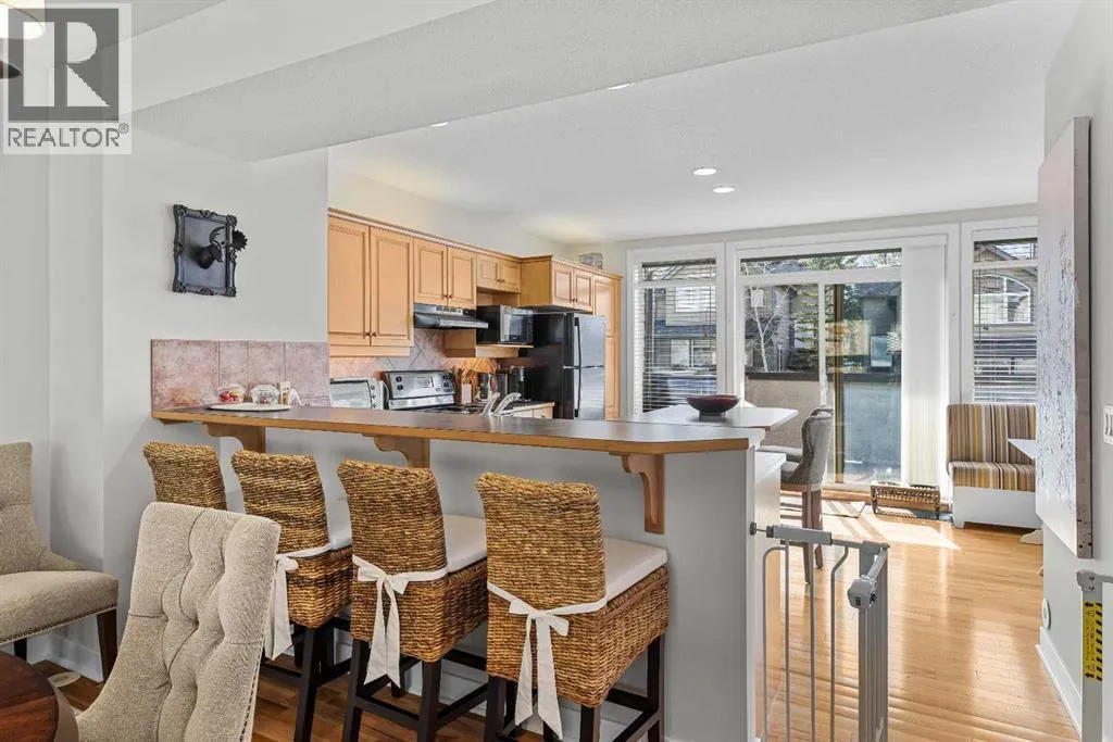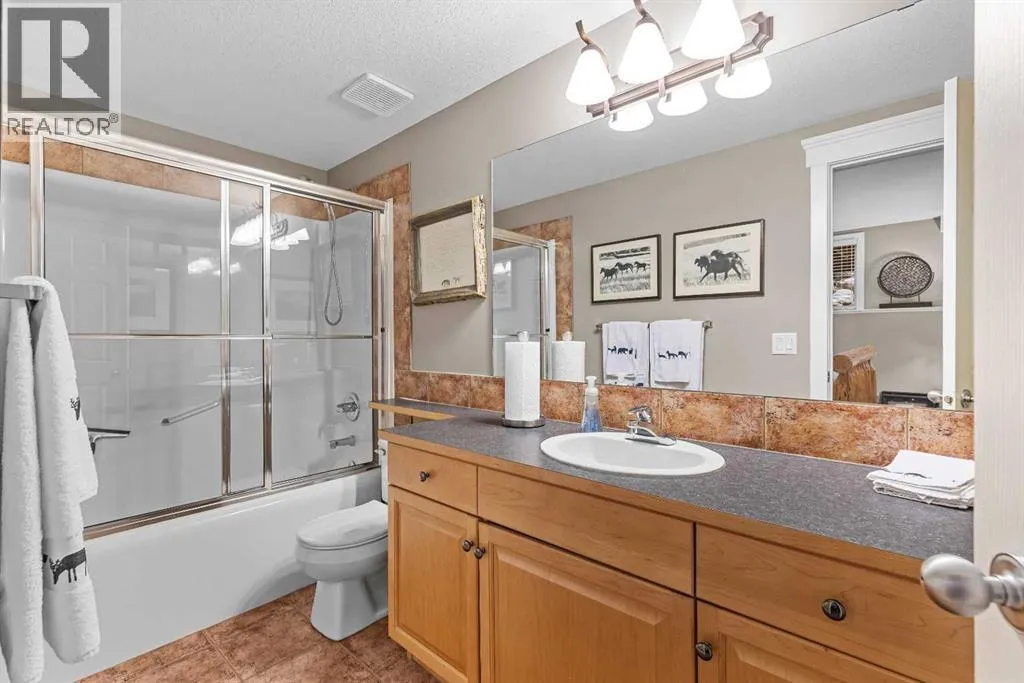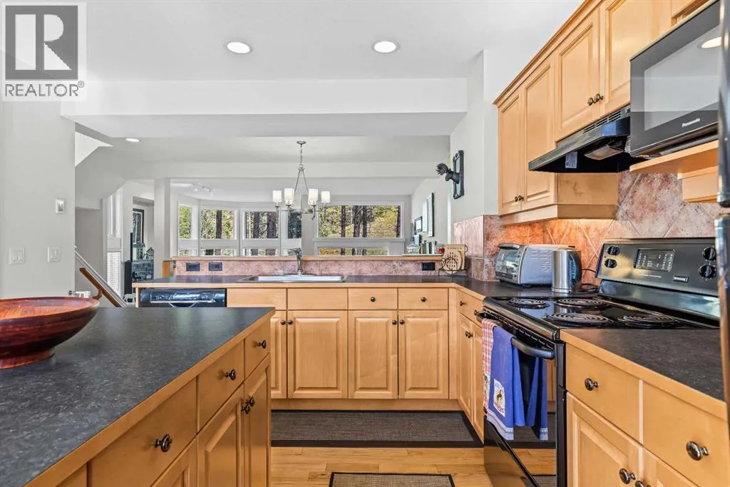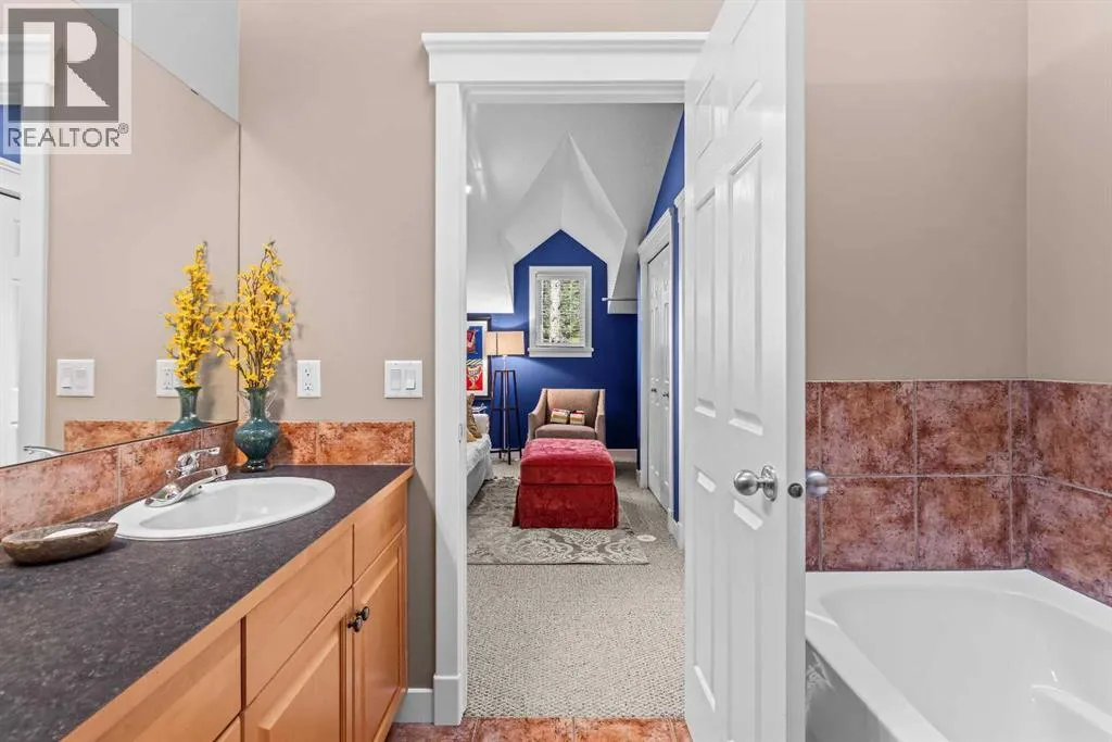 A rare opportunity awaits in Aspen Glen, Grizzly Ridge, a serene end unit townhome community tucked away along the coveted fairways of Silvertip Golf Course. This spacious 3-bedroom, 4-bathroom home combines mountain charm with thoughtful design, offering both privacy and spectacular views. Step inside to a bright and inviting entry, where skylights above the foyer and staircase flood the home with natural light. The sunken living room is the heart of the home, showcasing tall ceilings and a wall of windows that frame the tranquil golf course backdrop of hole number 1. A cozy fireplace adds warmth, while the spacious dining room and breakfast nook capture stunning mountain vistas, including the iconic Three Sisters. This home also has A/C for added comfort. Upstairs, youâll find two generously sized bedrooms, each with its own ensuite, plus the convenience of laundry on the same level. The lower level provides flexibility with an optional third bedroom or family room, complete with a second fireplace and access to a full 4-piece bathroom. Additional highlights include a double-car garage, abundant natural light throughout, and a floor plan designed to accommodate full-time living, weekend escapes, or hosting friends and family in style. Backed by golf course serenity and fronted by mountain views, this townhome delivers a lifestyle thatâs uniquely Canmore, peaceful, private, and perfectly located. (id:27476)
