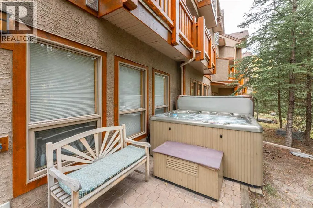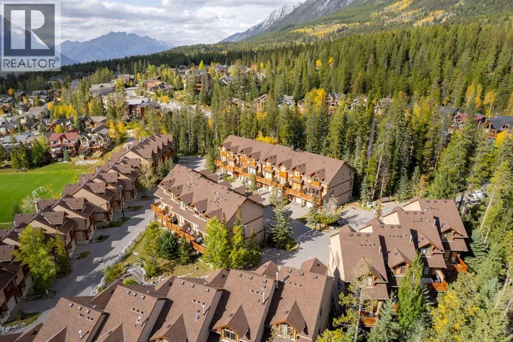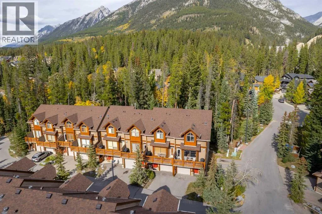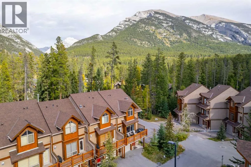 Perched above the desirable Eagle Terrace neighbourhood, this three-level walk-out townhouse offers the perfect balance of mountain living & modern comfort. A coveted corner suite with a single-car garage, it has been thoughtfully designed by the original owners who modified the floorplan to maximize space & natural light with additional windows framing the stunning alpine surroundings. The main living area features an open-concept design anchored by a striking river rock gas fireplace. Step onto the front balcony to take in sweeping views of the iconic Three Sisters peaks. A smartly laid out kitchen with island and a cozy breakfast nook extend seamlessly to a second balcony overlooking a peaceful treed reserve, the ideal backdrop for your morning coffee. A dining area & powder room complete this inviting level. Upstairs, two spacious bedrooms with vaulted ceilings each enjoy their own private ensuite; separated by a dedicated laundry area. One bedroom captures inspiring mountain views, while the other gazes into the quiet treetops, offering the best of both worlds. The walk-out level provides a versatile flex room with direct access to a private patio & hot tub, perfect for unwinding after a day of adventure. A full bathroom, storage & single-car garage complete this thoughtfully appointed home. Whether you are looking for a full-time residence or a mountain retreat, this property offers more than just a homeâitâs your gateway to the coveted Eagle Terrace lifestyle, where trails, community & breathtaking views are just outside your door. (id:27476)