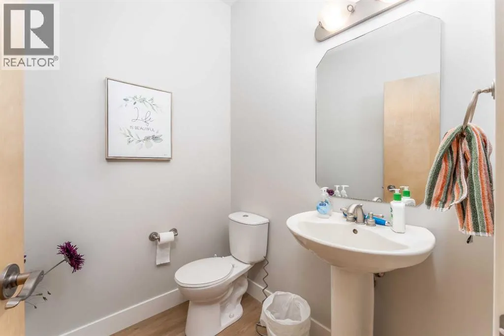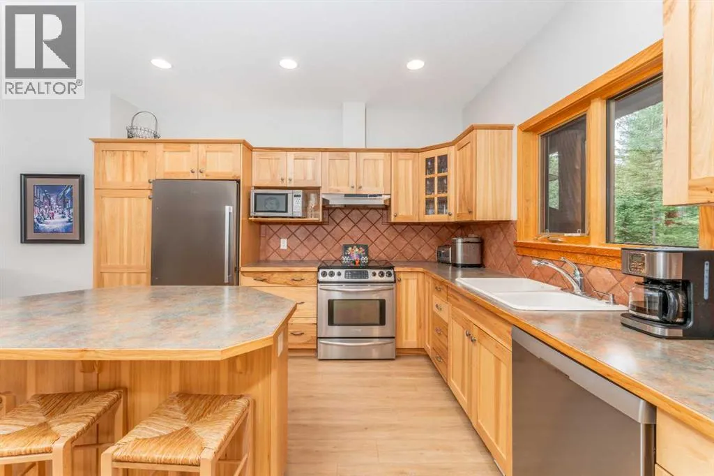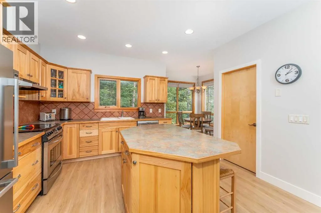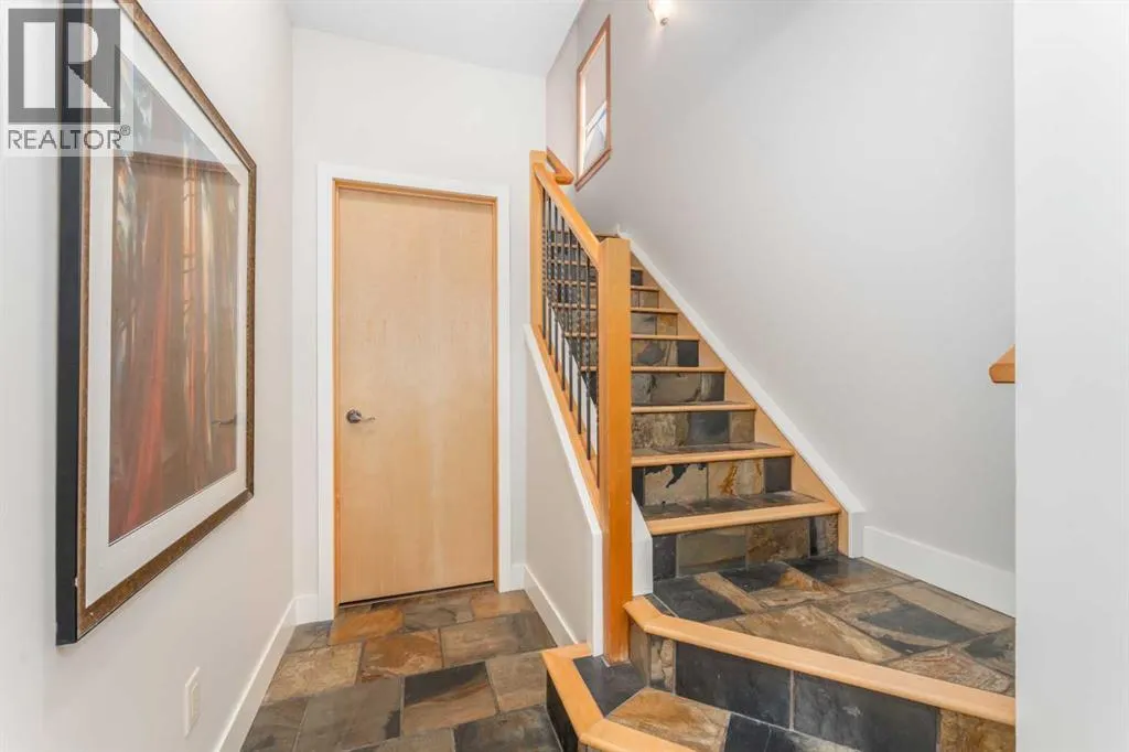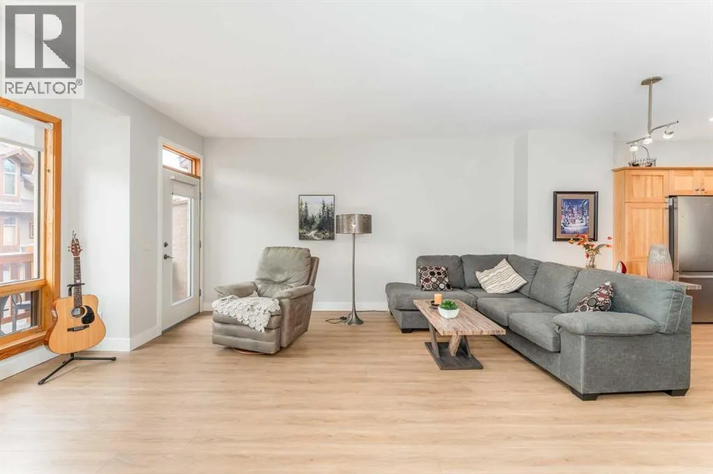Perched above the desirable Eagle Terrace neighbourhood, this three-level walk-out townhouse offers the perfect balance of mountain living & modern comfort. A coveted corner suite with a single-car garage, it has been thoughtfully designed by the original owners who modified the floorplan to maximize space & natural light with additional windows framing the stunning alpine surroundings. The main living area features an open-concept design anchored by a striking river rock gas fireplace. Step onto the front balcony to take in sweeping views of the iconic Three Sisters peaks. A smartly laid out kitchen with island and a cozy breakfast nook extend seamlessly to a second balcony overlooking a peaceful treed reserve, the ideal backdrop for your morning coffee. A dining area & powder room complete this inviting level. Upstairs, two spacious bedrooms with vaulted ceilings each enjoy their own private ensuite; separated by a dedicated laundry area. One bedroom captures inspiring mountain views, while the other gazes into the quiet treetops, offering the best of both worlds. The walk-out level provides a versatile flex room with direct access to a private patio & hot tub, perfect for unwinding after a day of adventure. A full bathroom, storage & single-car garage complete this thoughtfully appointed home. Whether you are looking for a full-time residence or a mountain retreat, this property offers more than just a homeâitâs your gateway to the coveted Eagle Terrace lifestyle, where trails, community & breathtaking views are just outside your door. (id:27476)