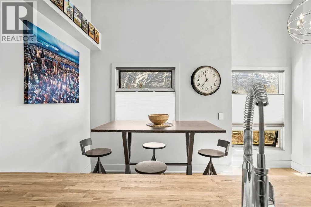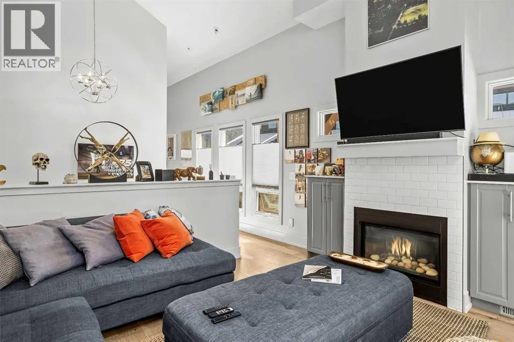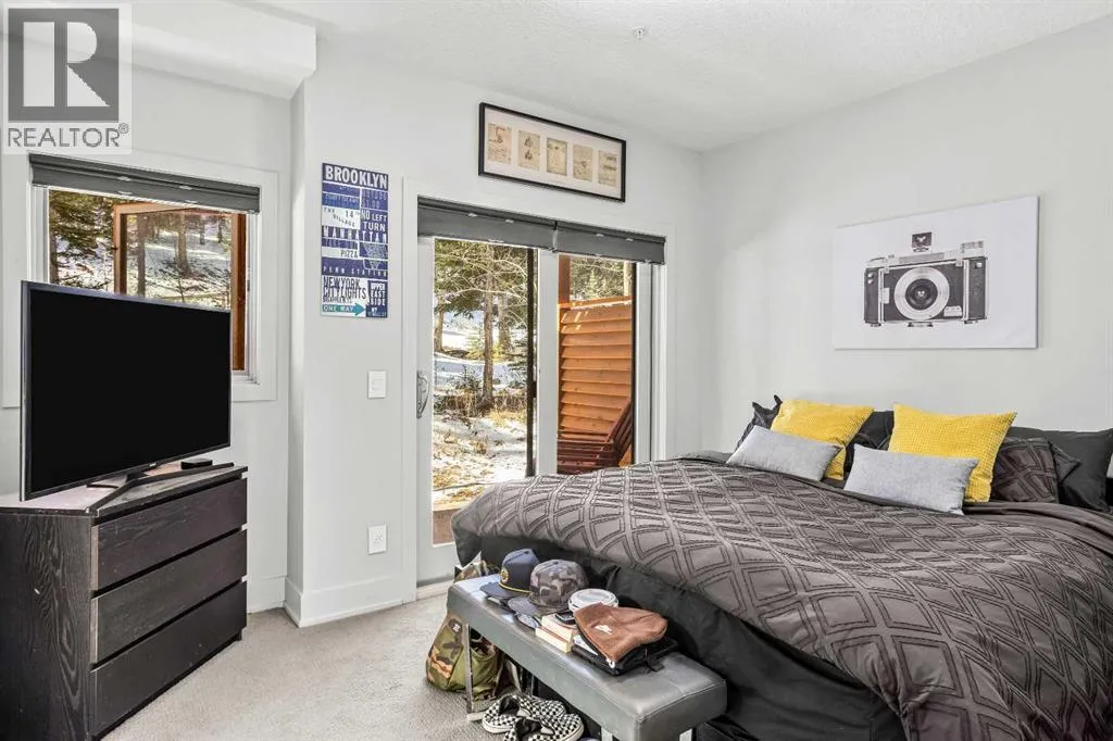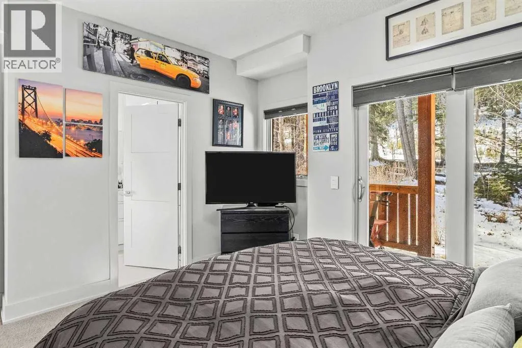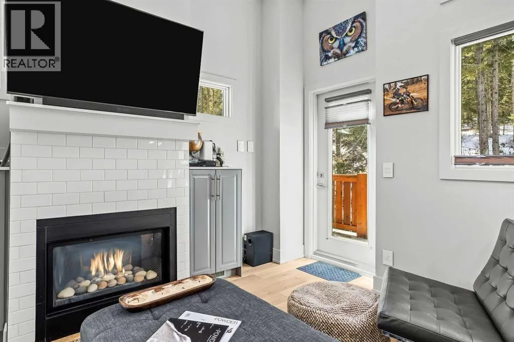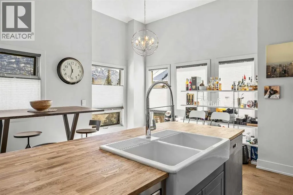 In a back row location, alongside a lovely treed hillside you'll find this well appointed, bright & spacious modern townhome. Over 3 storeys, with no one above or below you, this end unit provides serenity & pride of place in the Three Sisters of Canmore. On entry, vaulted ceilings & a glass bordered stairway leads up to the main level, or down to a handy flex space, laundry & single garage, perfect for active lifestyles. The middle floor offers 2 bedrooms, where the primary suite is an ideal respite with its own bath & generous closet space. A private balcony leads to the woods alongside. Upstairs, views are panoramic, where 3 walls of glass bring the outside in. A thoughtfully laid out kitchen sits together with the dining area & will be the heart of entertaining. Opposite, the living room inspires relaxation & calm under soaring ceilings. Finding inspired design which brings comfort & utility while also offering an environment that's "of" Canmore is a rare offering. We hope you agree! (id:27476)