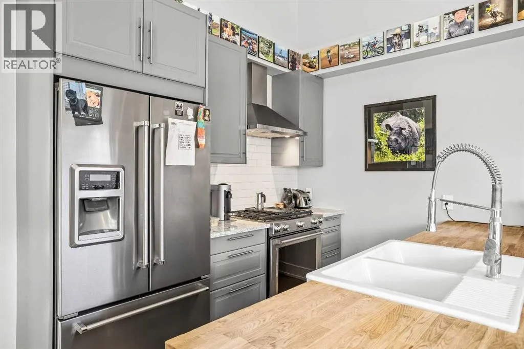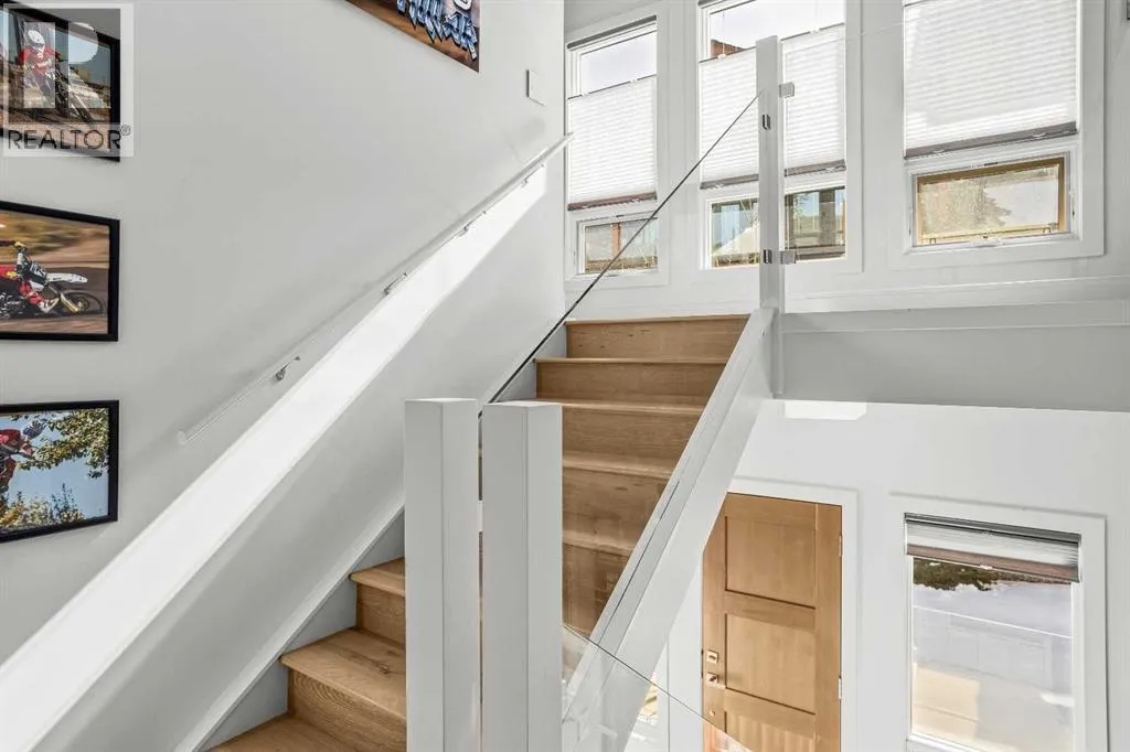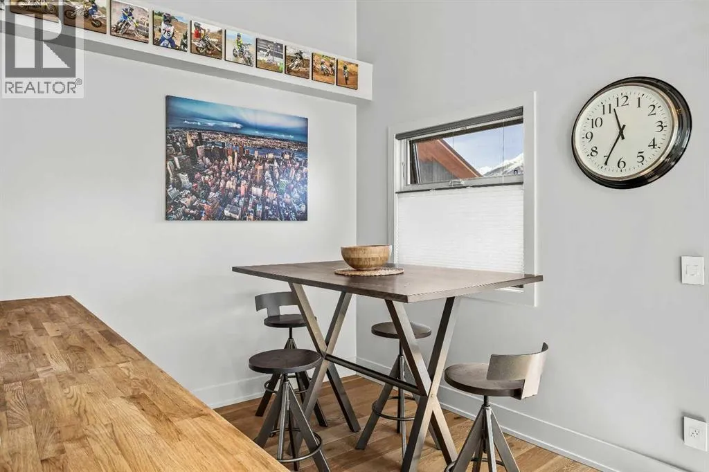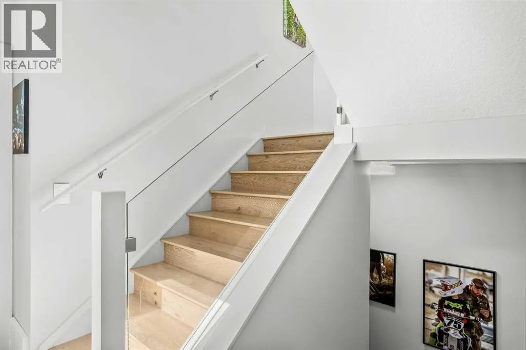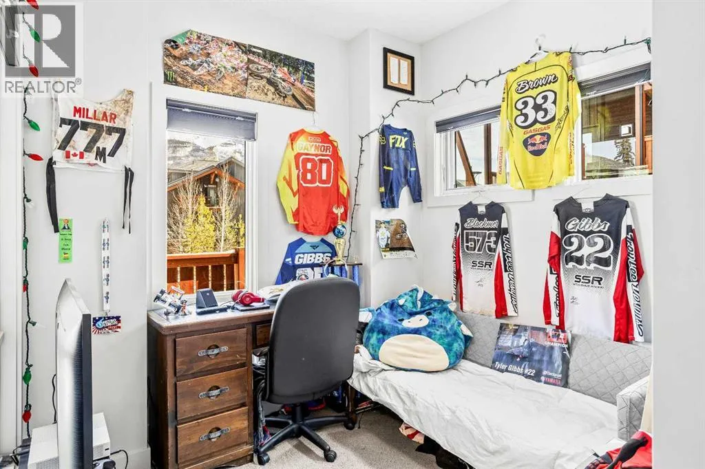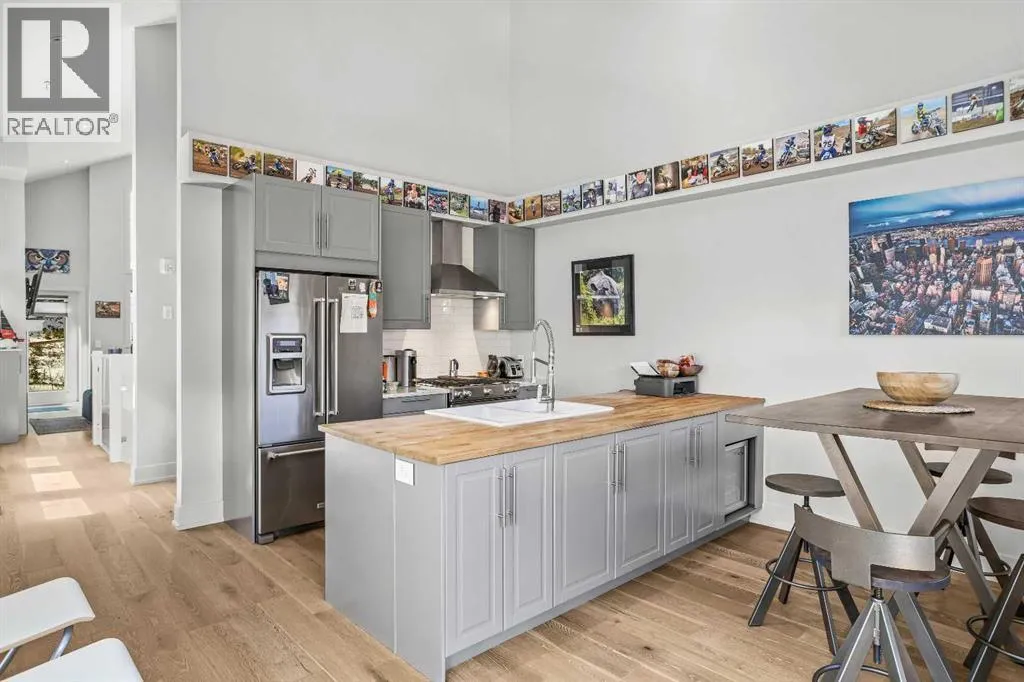 In a back row location, alongside a lovely treed hillside you'll find this well appointed, bright & spacious modern townhome. Over 3 storeys, with no one above or below you, this end unit provides serenity & pride of place in the Three Sisters of Canmore. On entry, vaulted ceilings & a glass bordered stairway leads up to the main level, or down to a handy flex space, laundry & single garage, perfect for active lifestyles. The middle floor offers 2 bedrooms, where the primary suite is an ideal respite with its own bath & generous closet space. A private balcony leads to the woods alongside. Upstairs, views are panoramic, where 3 walls of glass bring the outside in. A thoughtfully laid out kitchen sits together with the dining area & will be the heart of entertaining. Opposite, the living room inspires relaxation & calm under soaring ceilings. Finding inspired design which brings comfort & utility while also offering an environment that's "of" Canmore is a rare offering. We hope you agree! (id:27476)