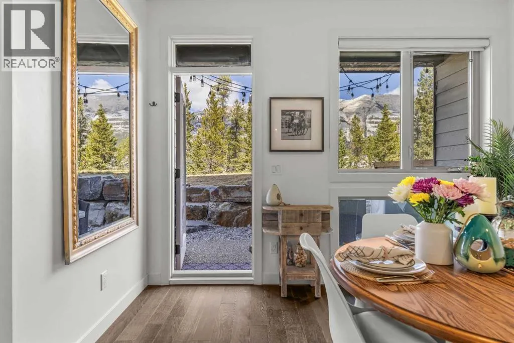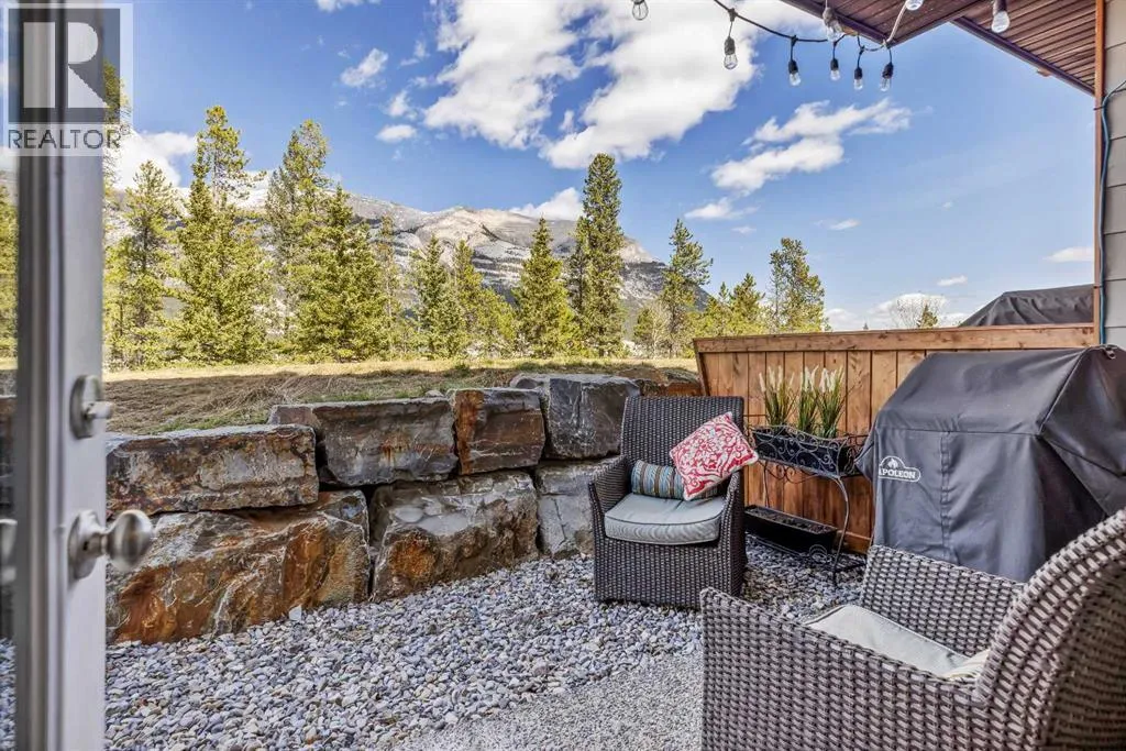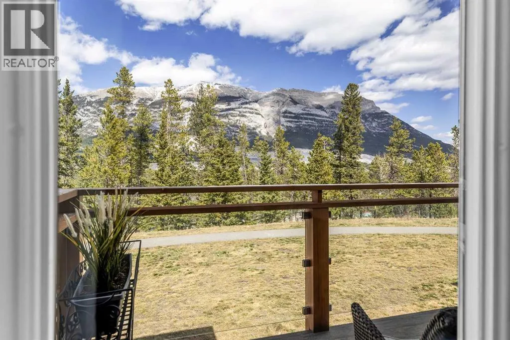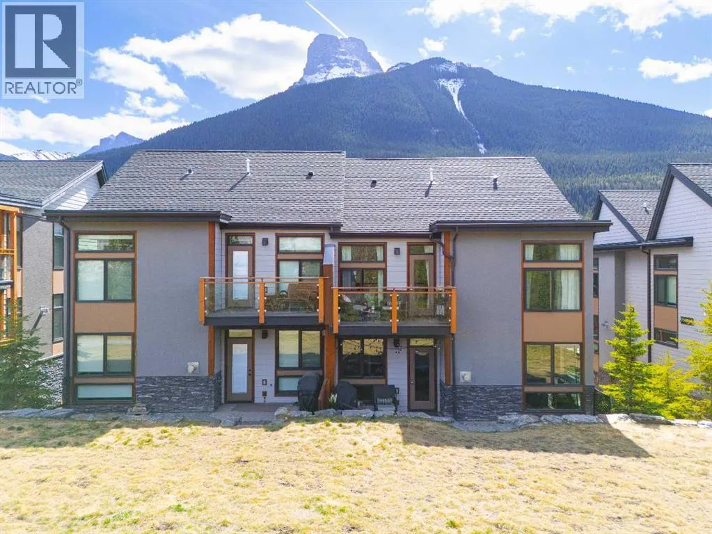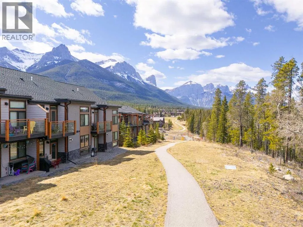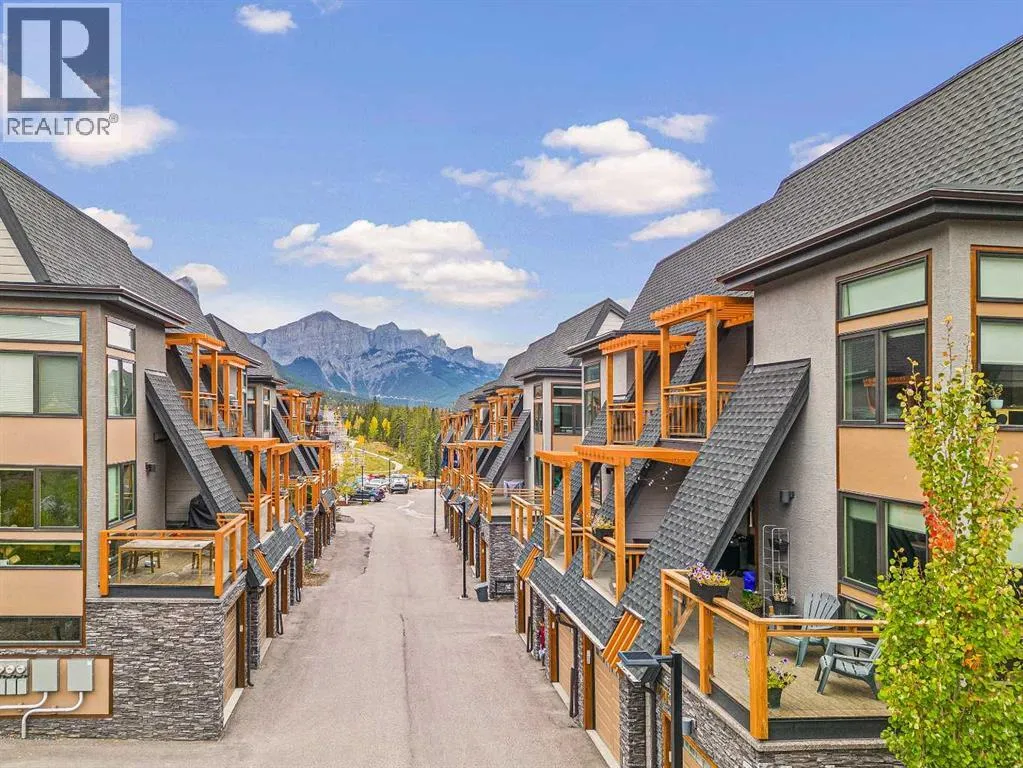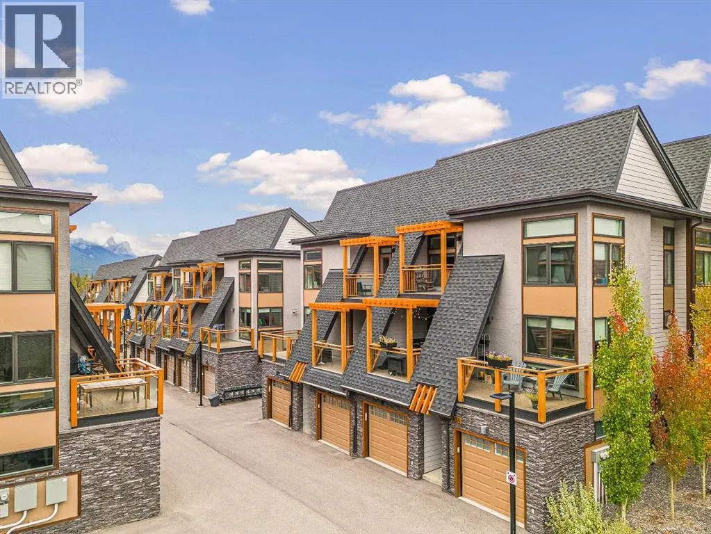 Welcome to this exclusive end-unit townhome nestled within the prestigious Three Sisters Mountain Village â a serene retreat that balances upscale design with a warm, inviting comfort. Boasting over 1,100 square feet of thoughtfully designed living space, this home delivers an effortless blend of natural beauty and modern luxury. Step inside to discover two private bedrooms, each enhanced with its own spa-like ensuite.The primary corner suite is a true sanctuary: expansive, floor-to-ceiling windows frame breathtaking mountain vistas, while a sophisticated 3-piece ensuite and a generous walk-in closet elevate the experience. The second bedroom offers its own private patio overlooking a lush, forested setting and sweeping mountain viewsâa peaceful escape enhanced by a stylish 4-piece ensuite and ample storage in its walk-in closet. The heart of thishome is the open-concept kitchen and living area, where upgraded stainless steel appliances and elegant quartz countertops set the stage for culinary adventures and memorable gatherings. The kitchen seamlessly integrates with the living space, enhanced by hardwood flooring throughout the main floor and the warmth of a tile-surrounded fireplace that invites cozy evenings by the glow of dancing flames. A unique feature of this townhome is its dual outdoor retreats. The sunken patio off the dining area overlooks a quiet green space, presenting a perfect setting for alfresco dining or unwinding with incredible mountain views. A second private patio off the second bedroom provides an inviting space to savour the fresh mountain air and watch natureâs colours shift throughout the day. Additional amenities include a convenient laundry space with stacked washer and dryer, a single- car garage, and access to a community rich in pathways, hiking trails, and parks. Positioned close to world-class golf courses, ski hills, local schools, and the soon-to-be-open Gateway shopping district, this home offers not only luxurious living but a lso an enviable location that caters to an active, yet relaxed lifestyle. Discover a home that embodies both upscale elegance and serene comfortâa perfect haven for those who value quality, style, and a connection to nature. (id:27476)