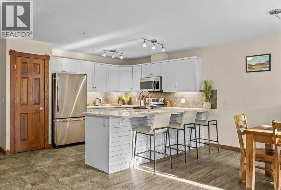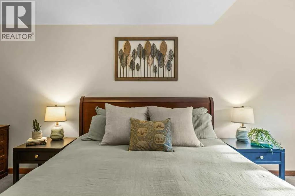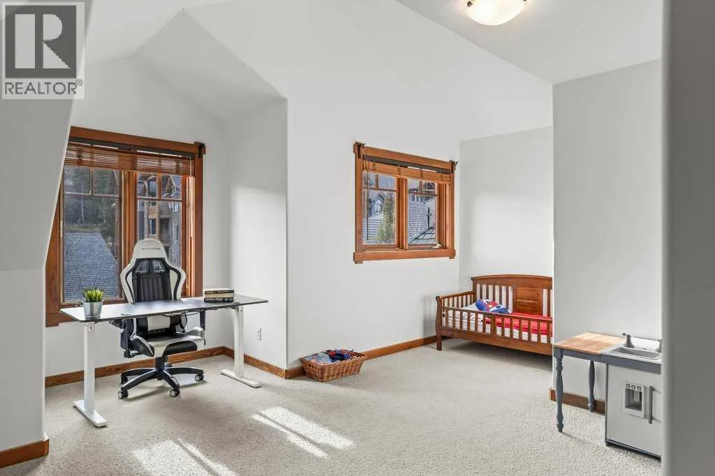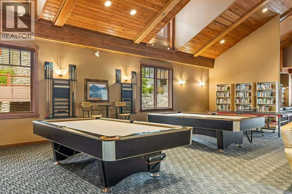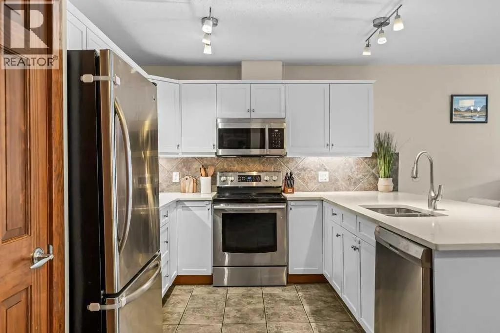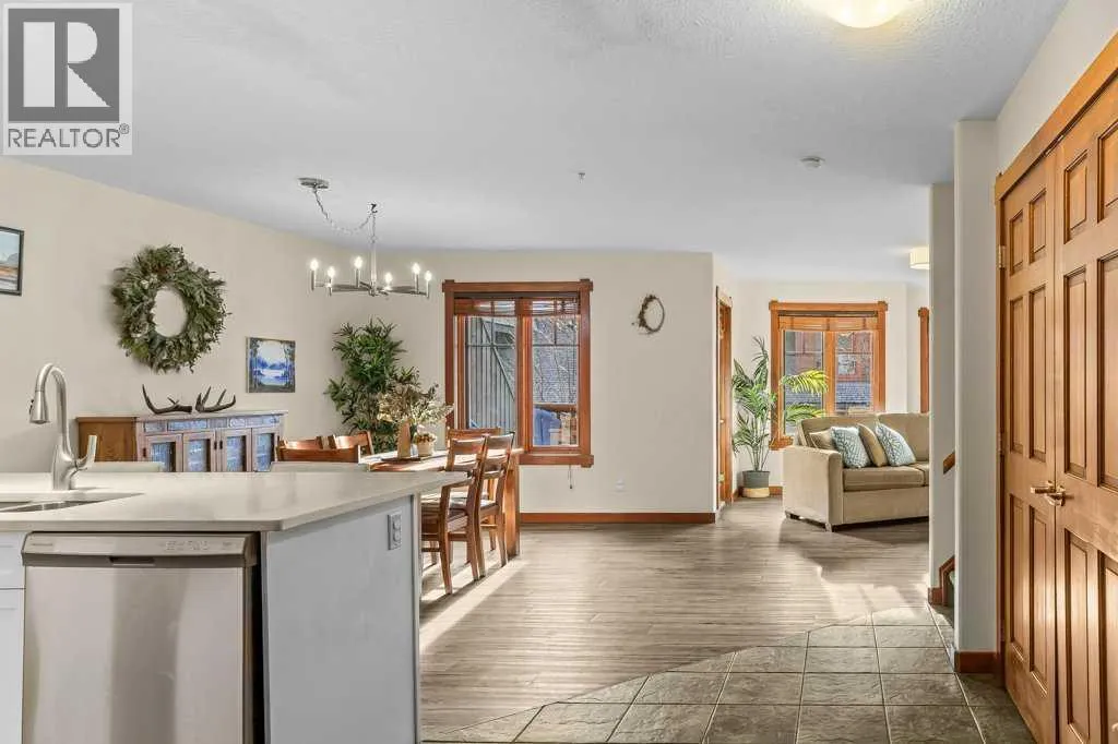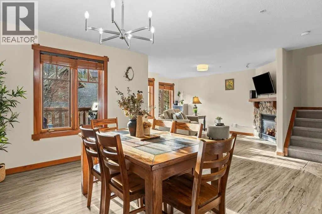Direct views of the iconic Three Sisters mountains from every SW facing window from this top floor penthouse! Enjoy the expansive 1,348 sq.ft. living space spread across multiple levels, providing privacy and comfort for families or entertaining guests. The large kitchen / dining / living area is larger than most apartment or townhouse style properties in Canmore at the affordable end of the market creating a great place to relax and enjoy your time with others. There have been thoughtful and bright upgrades to the flooring, quartz kitchen counter top, and cabinets throughout giving it a warm mountain feel with a modern touch. The 2 large bedrooms upstairs have attractive ceiling lines, solid wood doors throughout and versatile layouts that allow for extra furniture like a sofa, work station, kids play area etc⦠A popular feature are the 2 titled parking stalls that come with the unit and a storage locker located at the end of the indoor parking stall. Crossbow has one of the best clubhouses in any building in Canmore with features you will not find elsewhere including: 2 hot tubs (one indoor and one outdoor), dry sauna, a sizable and well equipped gym, 2 pool tables, a ping pong table and lounge area / library. The Three Sisters area is a gateway to endless activities, including direct access to an extensive network of forest trails, from leisurely strolls along the Bow River Pathway to challenging scrambles up Ha Ling Peak. Explore the Three Sisters Pathway, enjoy kayaking or paddle boarding on Quarry Lake, disc golf, or cross-country skiing at the Canmore Nordic Centre. Crossbow is ideally located just a few steps away from the Bow River where you can catch the evening sun setting over Rundle Mountain or try your hand at fishing just out your door. The Three Sisters community is growing, with future plans for retail, office, and restaurant spaces at "The Gateway," including an IGA grocery store. Canmore's charming downtown is just a short drive or bike ride away . (id:27476)
