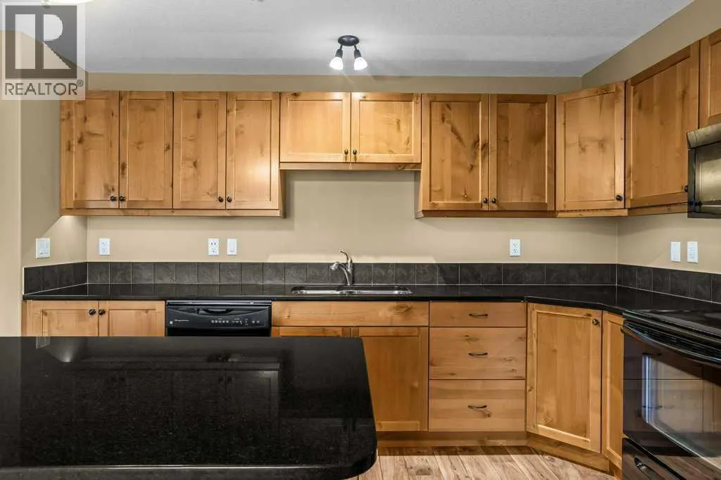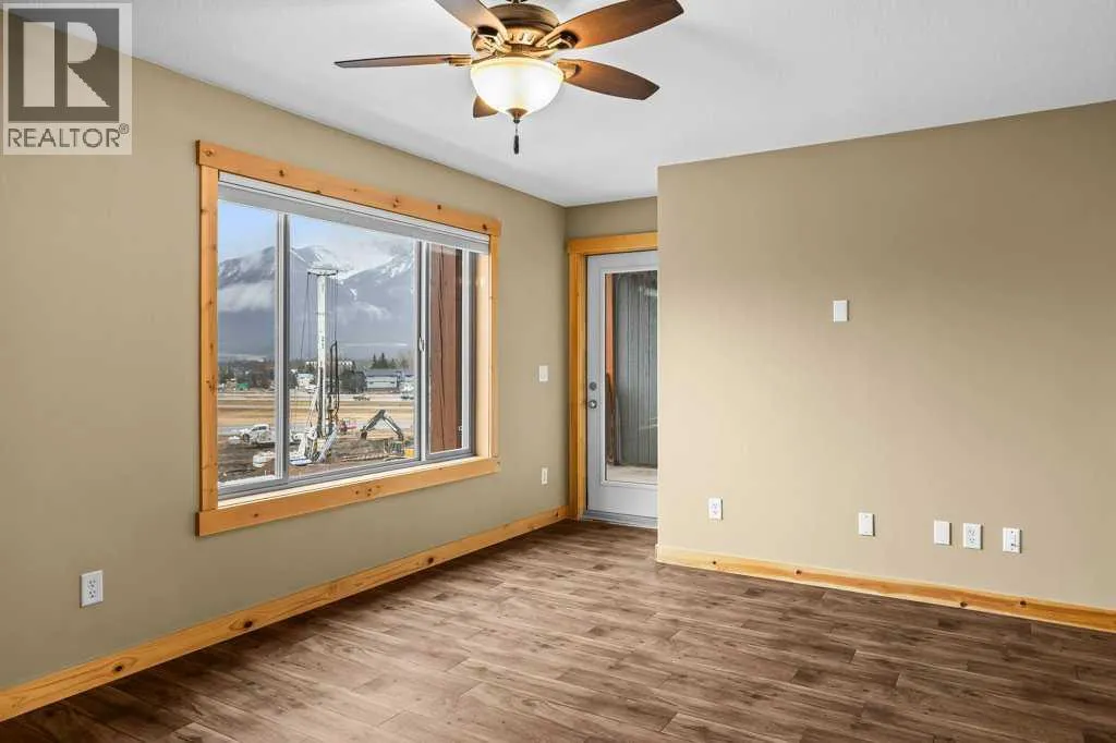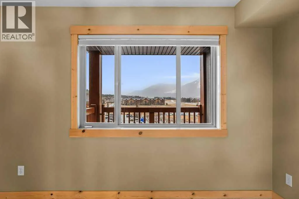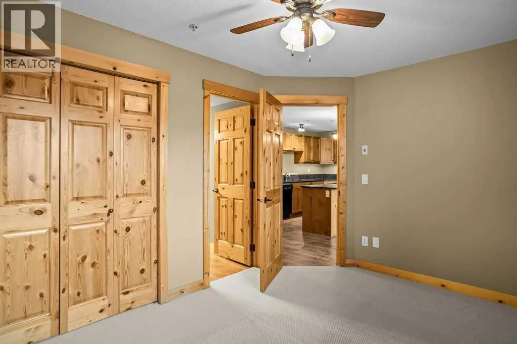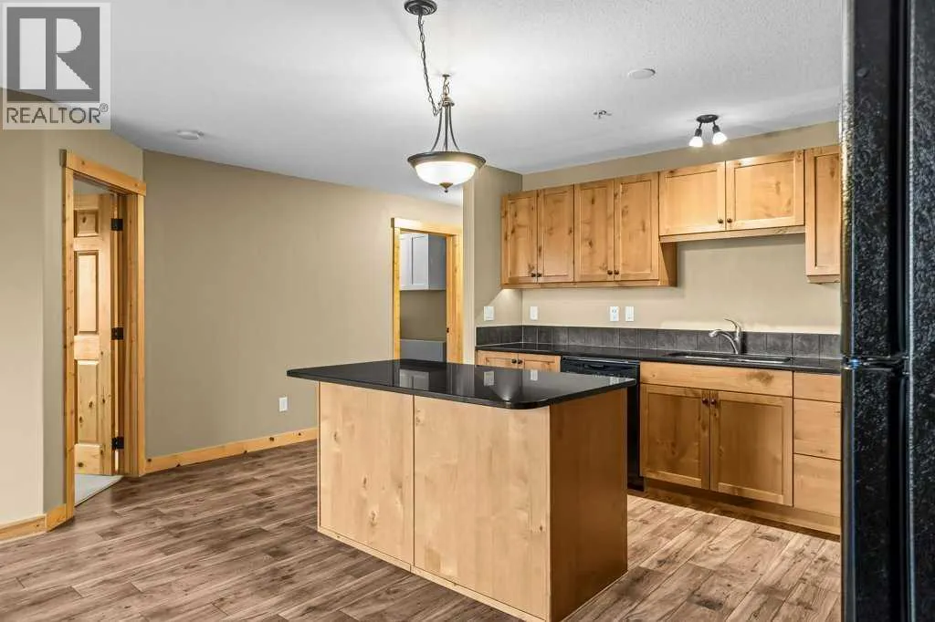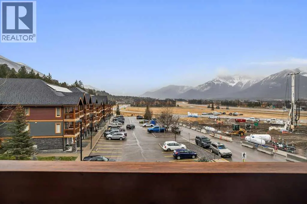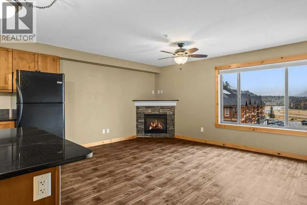 Bright 1-Bed + Den with Mountain Views & Modern Comforts in Canmore - This south-facing 1-bedroom plus den, 2-bath apartment offers unbeatable value and a lifestyle surrounded by Canmoreâs natural beauty. Located on the 3rd floor, youâll enjoy beautiful mountain views that remain even after nearby construction â with the new build helping block noise, making your balcony time peaceful and private. Inside, the open-concept layout features a kitchen with black granite countertops, island, and knotty alder wood trims for that warm mountain charm. Vinyl plank flooring flows through the main areas, while carpets in the bedroom and den add cozy comfort, highlighted by in floor heat. An electric fireplace creates a welcoming ambiance, and ceiling fans in every room keep the air fresh year-round. Youâll love the 2024 laundry appliances, two parking stalls (one titled underground, one assigned outside), and a secure storage cage. The building is well maintained and includes an elevator, common workroom, a gym and a dog parkâperfect for a convenient, active lifestyle. With low condo fees and taxes, this home is ideal for first-time buyers, singles, or young families who want to own in Canmore without compromise. (id:27476)