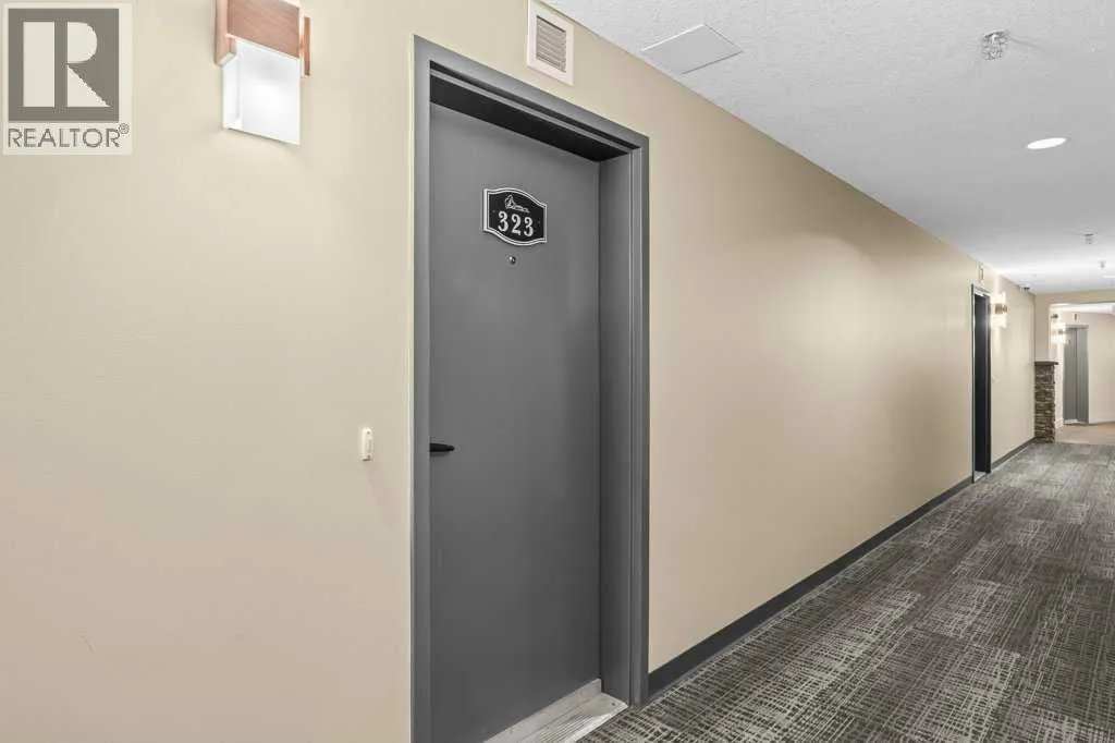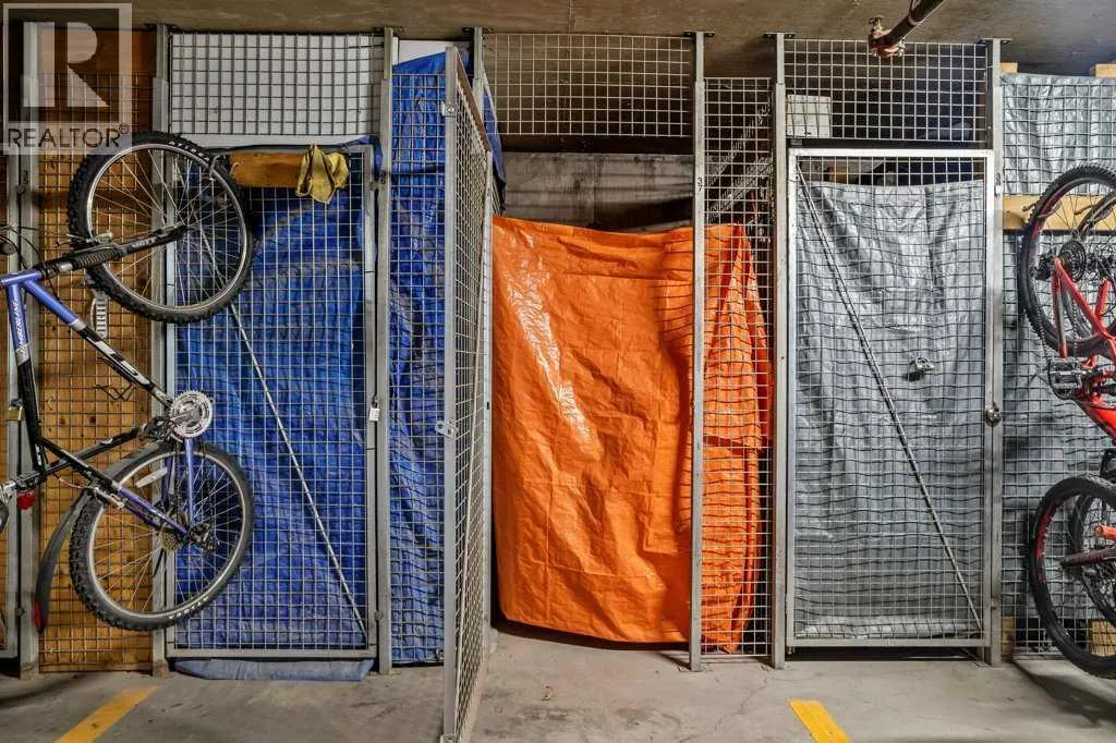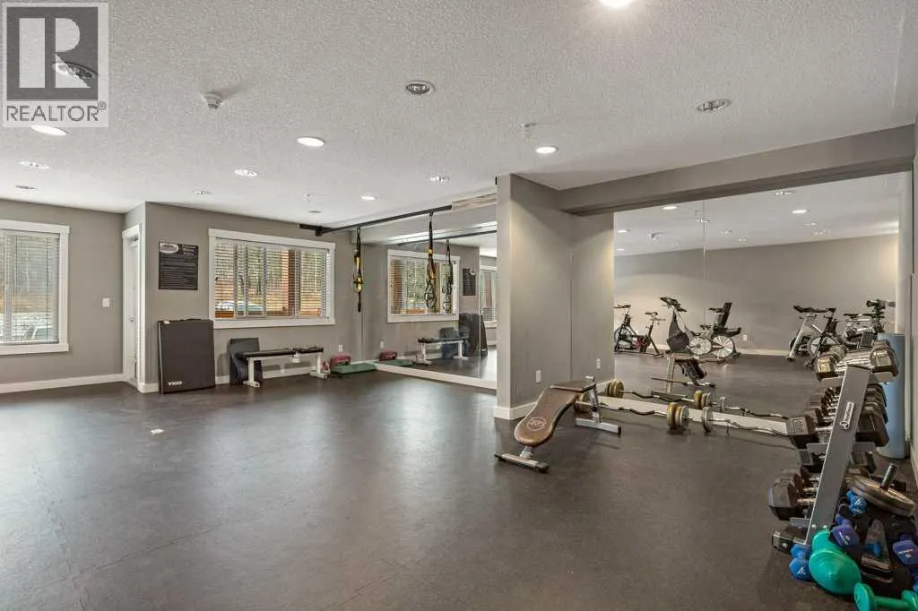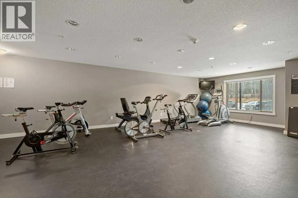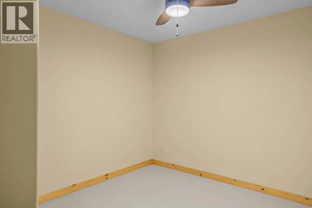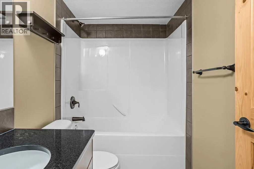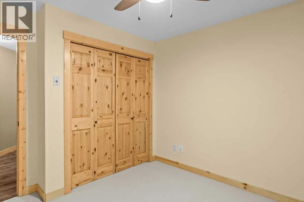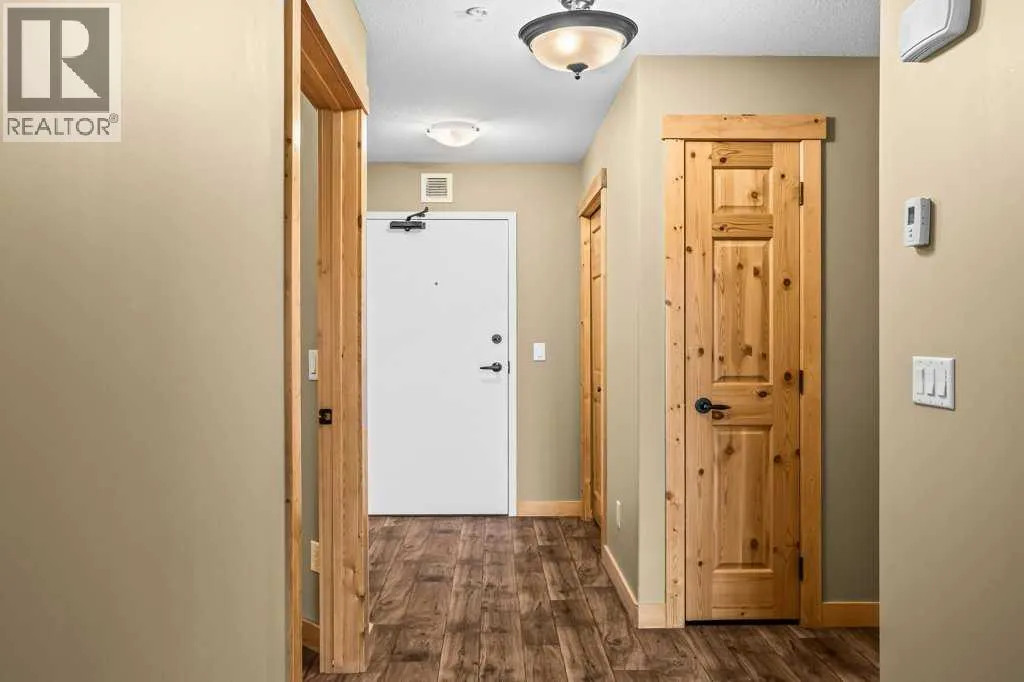 Bright 1-Bed + Den with Mountain Views & Modern Comforts in Canmore - This south-facing 1-bedroom plus den, 2-bath apartment offers unbeatable value and a lifestyle surrounded by Canmoreâs natural beauty. Located on the 3rd floor, youâll enjoy beautiful mountain views that remain even after nearby construction â with the new build helping block noise, making your balcony time peaceful and private. Inside, the open-concept layout features a kitchen with black granite countertops, island, and knotty alder wood trims for that warm mountain charm. Vinyl plank flooring flows through the main areas, while carpets in the bedroom and den add cozy comfort, highlighted by in floor heat. An electric fireplace creates a welcoming ambiance, and ceiling fans in every room keep the air fresh year-round. Youâll love the 2024 laundry appliances, two parking stalls (one titled underground, one assigned outside), and a secure storage cage. The building is well maintained and includes an elevator, common workroom, a gym and a dog parkâperfect for a convenient, active lifestyle. With low condo fees and taxes, this home is ideal for first-time buyers, singles, or young families who want to own in Canmore without compromise. (id:27476)