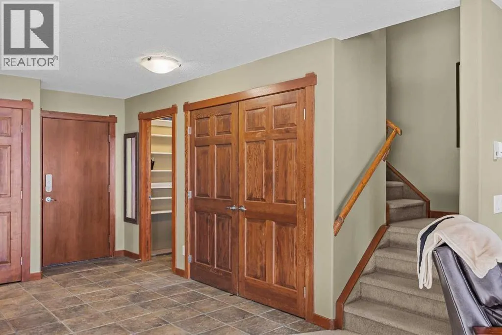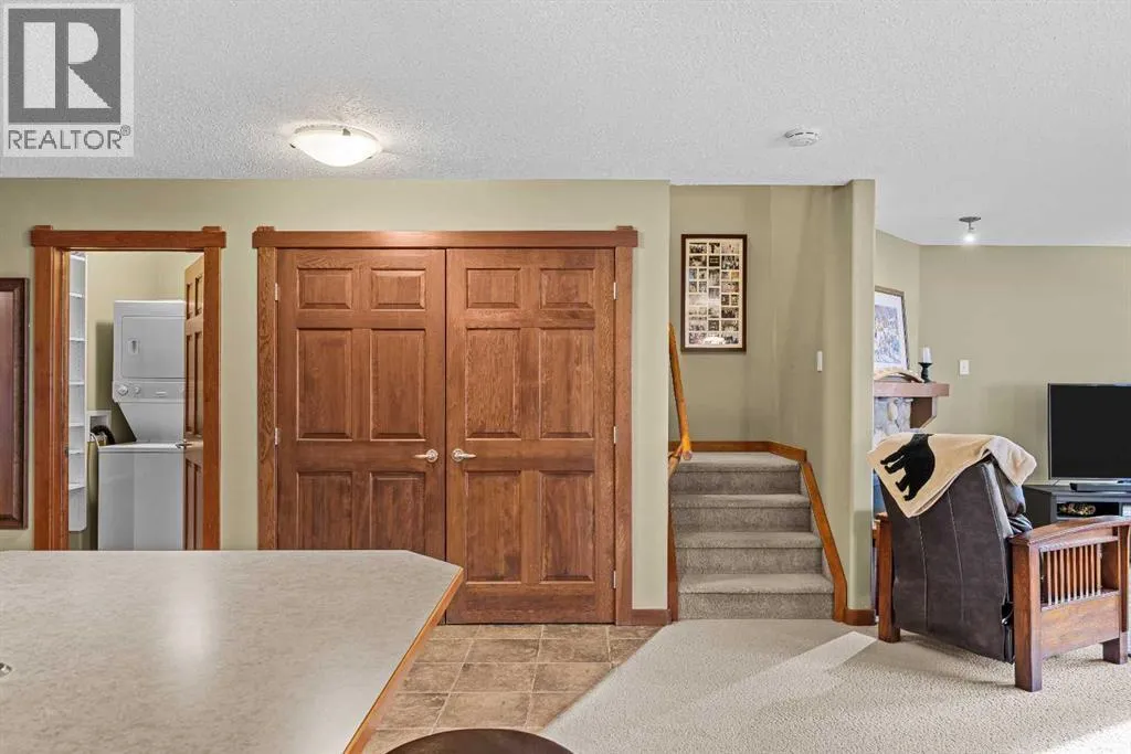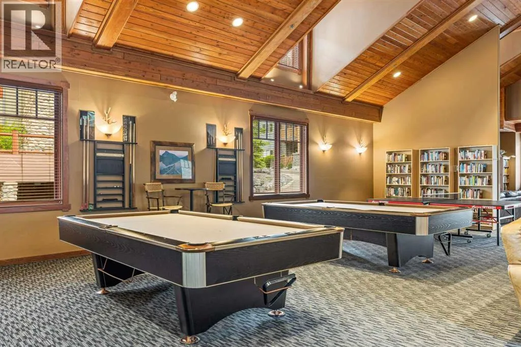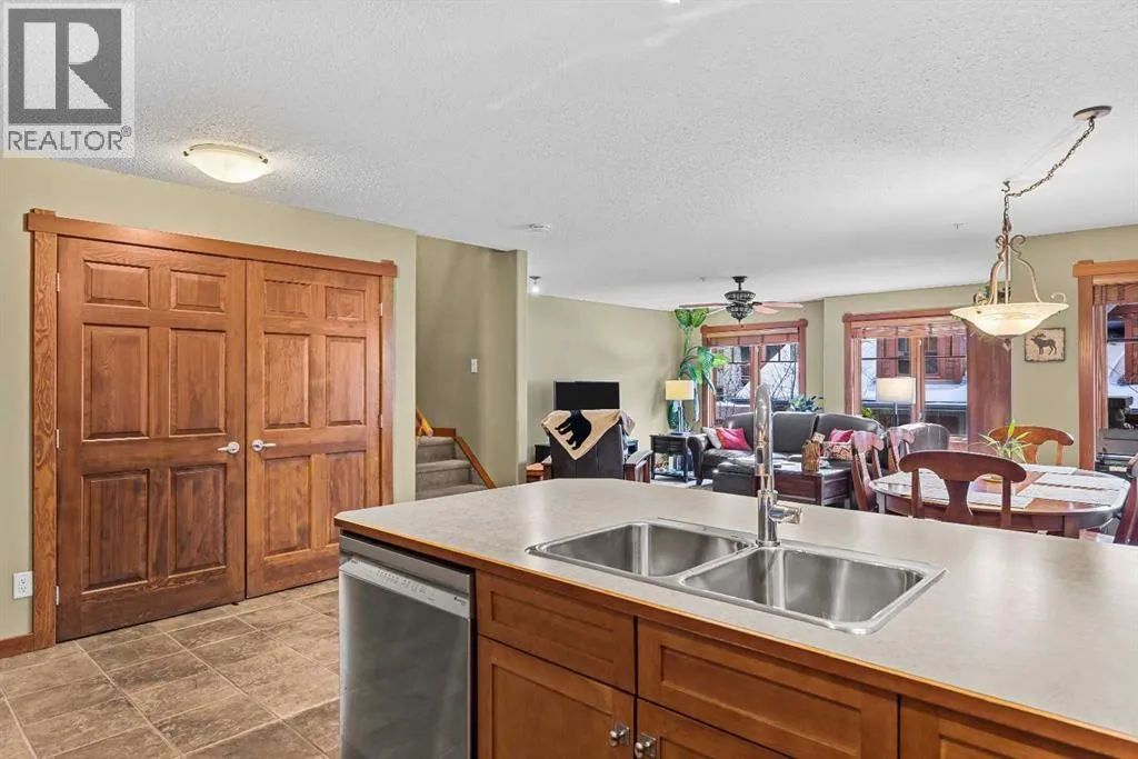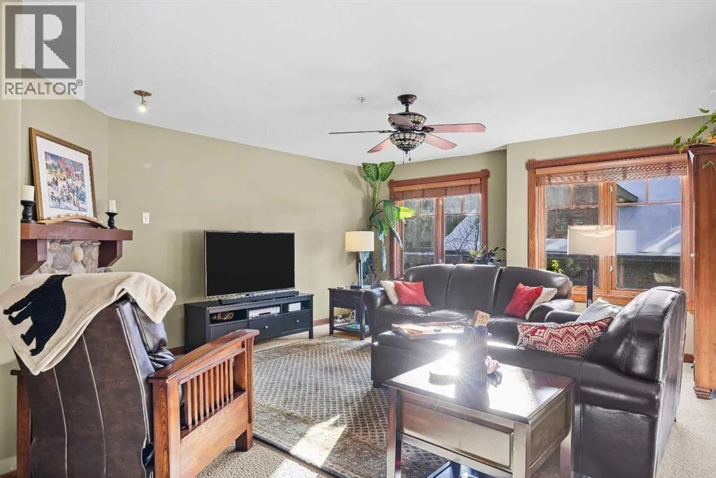 This is the sunny home with mountain views youâve been waiting for! Located on the quiet south side of the building and spanning the top two floors, this fabulous 2 bedroom, 2 bathroom condo enjoys plentiful sunshine year-round with enviable Three Sisters Mountain views. The spacious open-plan living level is flooded with light from all the south facing windows, yet offers privacy from mature trees, and comprises a very spacious kitchen with eating bar, huge living room with gas fireplace, and a generous dining area that will encourage you to invite guests! Step out onto the sunny deck to enjoy your morning coffee with Three Sisters Mountain views, or take a walk by the Bow River along nearby trails. After a fun day in the mountains, the adjacent amenities building offers abundant relaxation opportunities and entertainment for your family and guests, including indoor and outdoor hot tubs, well equipped gym, a sauna, pool tables, lounge area with large screen TV, and ping-pong table. Easy access to endless trails, and the convenience of the newly developed Gateway retail park just down the road. The free Roam bus stops right outside the complex for added convenience. This beautifully presented home offers the rare combination of a quiet location, abundant sunshine, mountain views, convenient amenities and easy access to local facilities. Donât hesitate â book your viewing today! One heated underground parking space (plus visitor parking) with adjacent spacious (9âx5â) storage. Please note that short-term rentals are not permitted at this property. There are no age restrictions in this building. (id:27476)