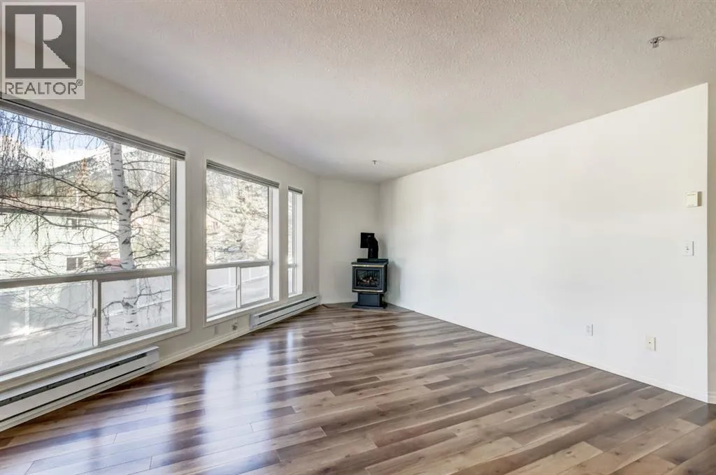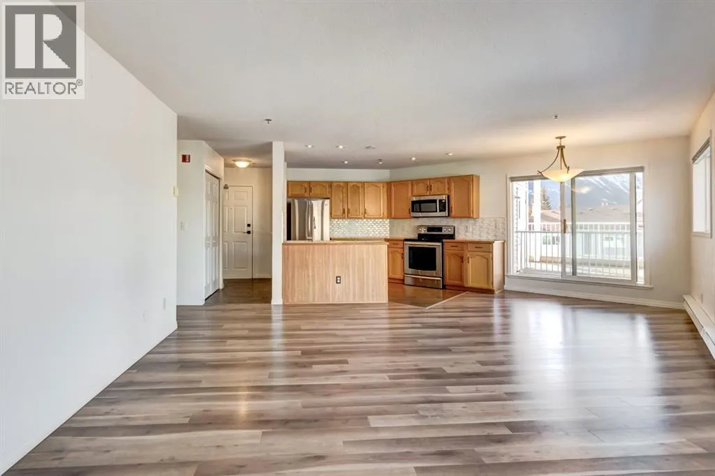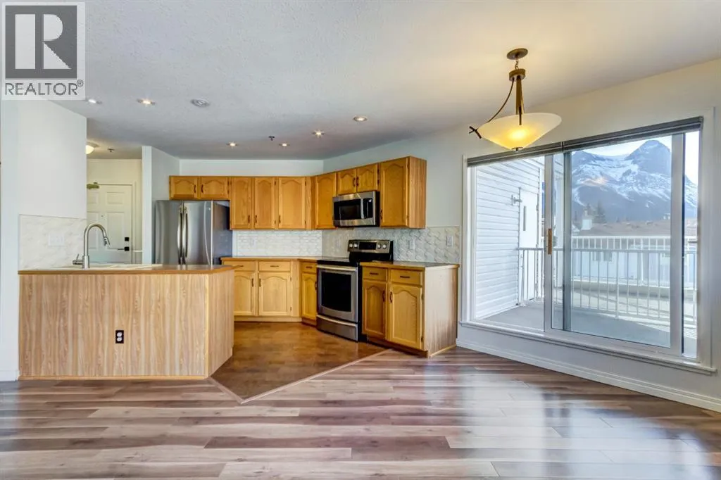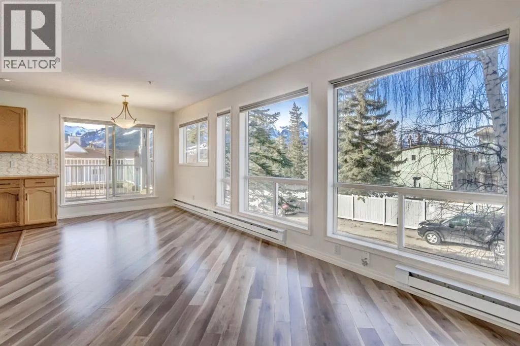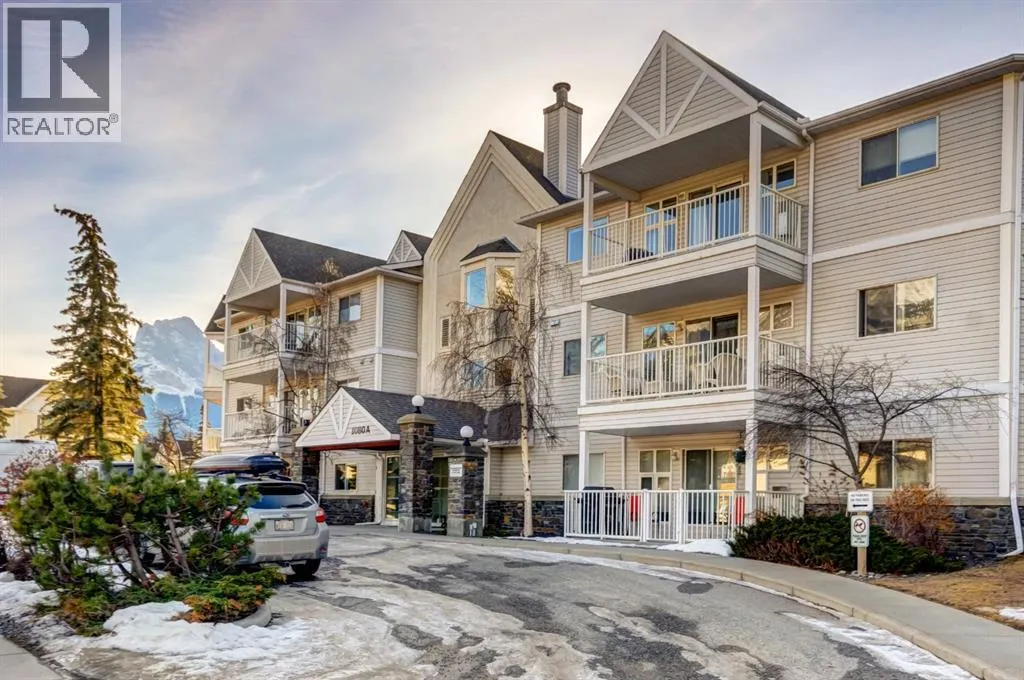 Two bedroom apartment with amazing views. This bright two bedroom, two bathroom corner suite offers over 980 sqft of single level living, perfectly positioned to capture breathtaking mountain views. Oversized windows and the coveted corner location flood the home with natural light, while its sunny valley side setting enhances the warm, inviting atmosphere. The open concept kitchen, dining and living area is ideal for both everyday living and entertaining, anchored by a cozy fireplace. Step outside to the spacious private patio, an extension of the living space and the perfect spot to relax and take in the surrounding alpine scenery. The primary bedroom features a walk in closet and private ensuite, while a second bedroom, full bathroom, walk-in laundry room and ample storage complete the layout. Residents enjoy excellent on site amenities, including an outdoor hot tub, a common gathering space, underground parking and storage. Located just steps from hiking and biking trails plus numerous Bow Valley attractions. (id:27476)