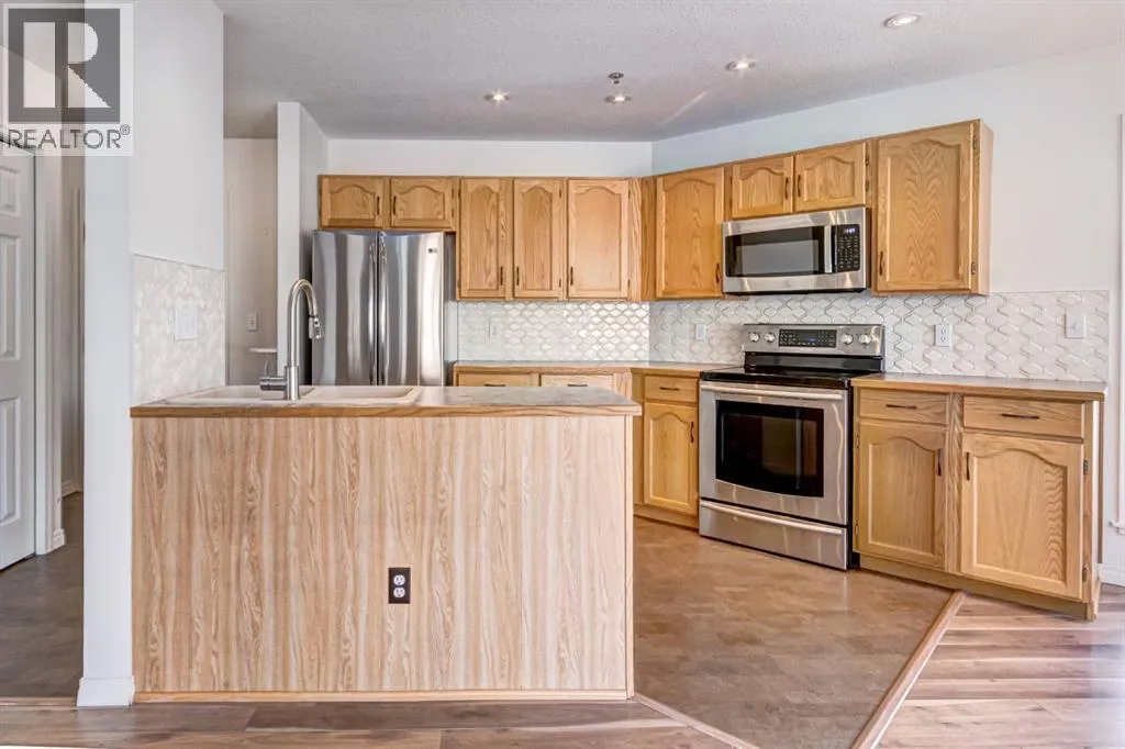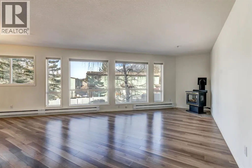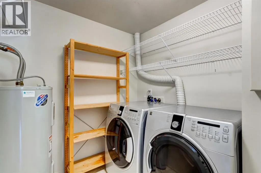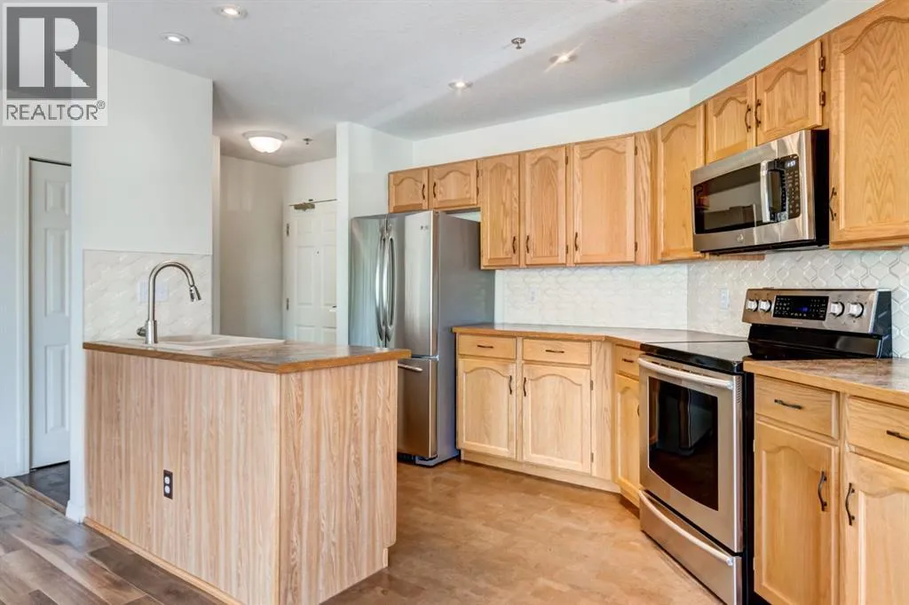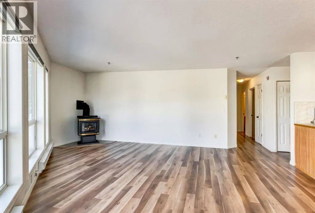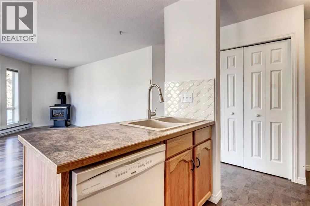 Two bedroom apartment with amazing views. This bright two bedroom, two bathroom corner suite offers over 980 sqft of single level living, perfectly positioned to capture breathtaking mountain views. Oversized windows and the coveted corner location flood the home with natural light, while its sunny valley side setting enhances the warm, inviting atmosphere. The open concept kitchen, dining and living area is ideal for both everyday living and entertaining, anchored by a cozy fireplace. Step outside to the spacious private patio, an extension of the living space and the perfect spot to relax and take in the surrounding alpine scenery. The primary bedroom features a walk in closet and private ensuite, while a second bedroom, full bathroom, walk-in laundry room and ample storage complete the layout. Residents enjoy excellent on site amenities, including an outdoor hot tub, a common gathering space, underground parking and storage. Located just steps from hiking and biking trails plus numerous Bow Valley attractions. (id:27476)
