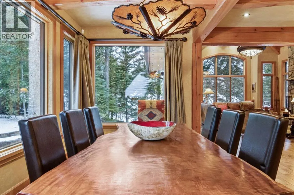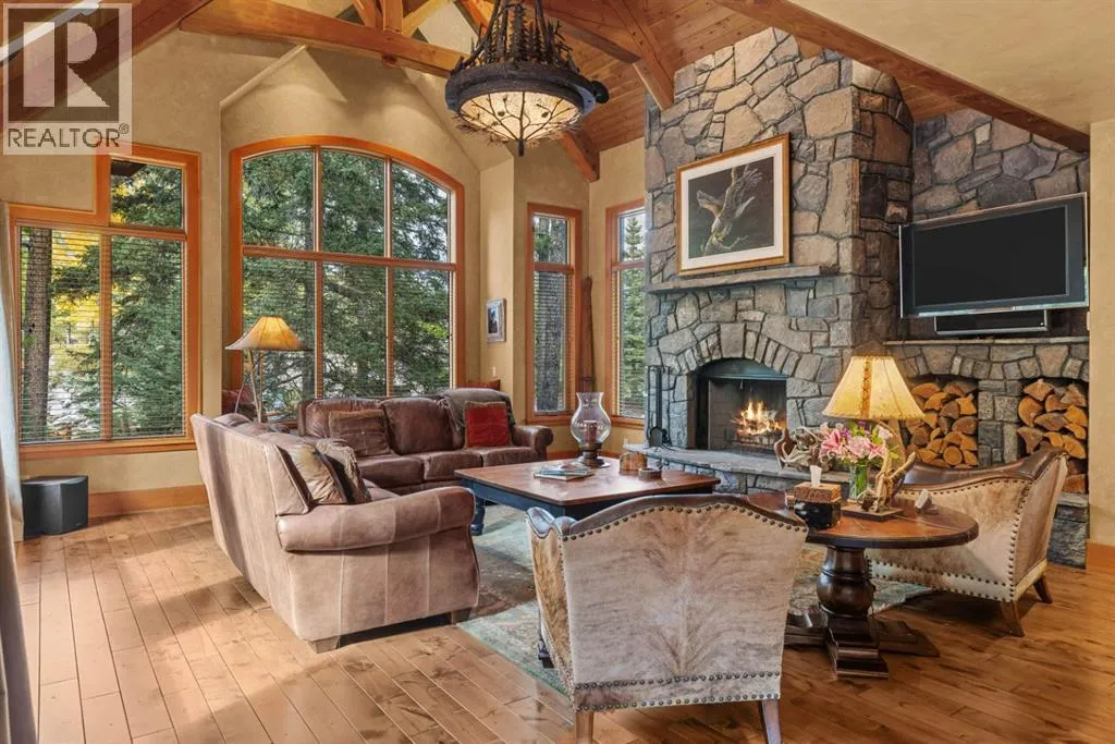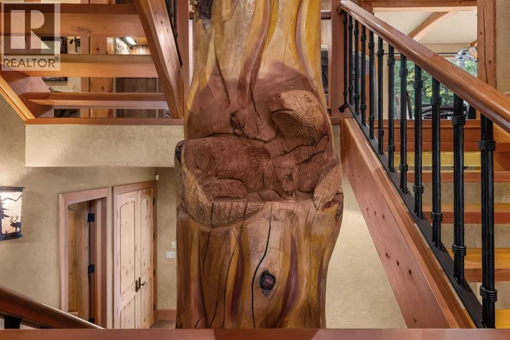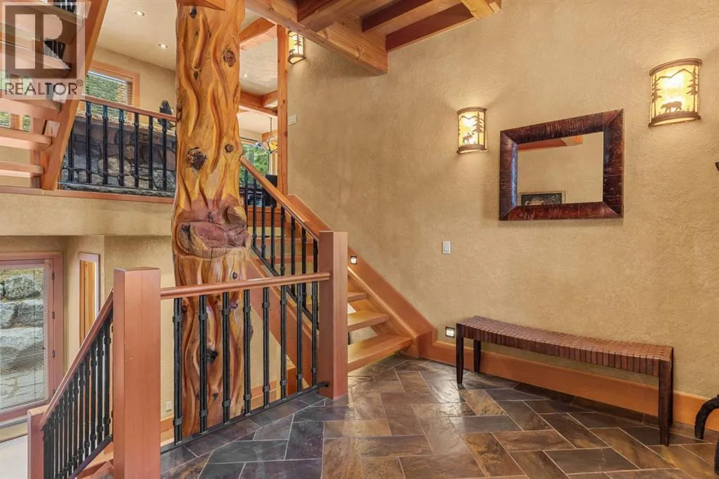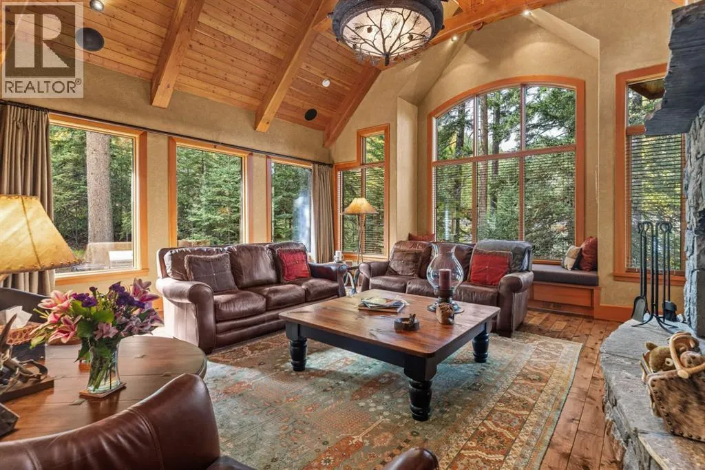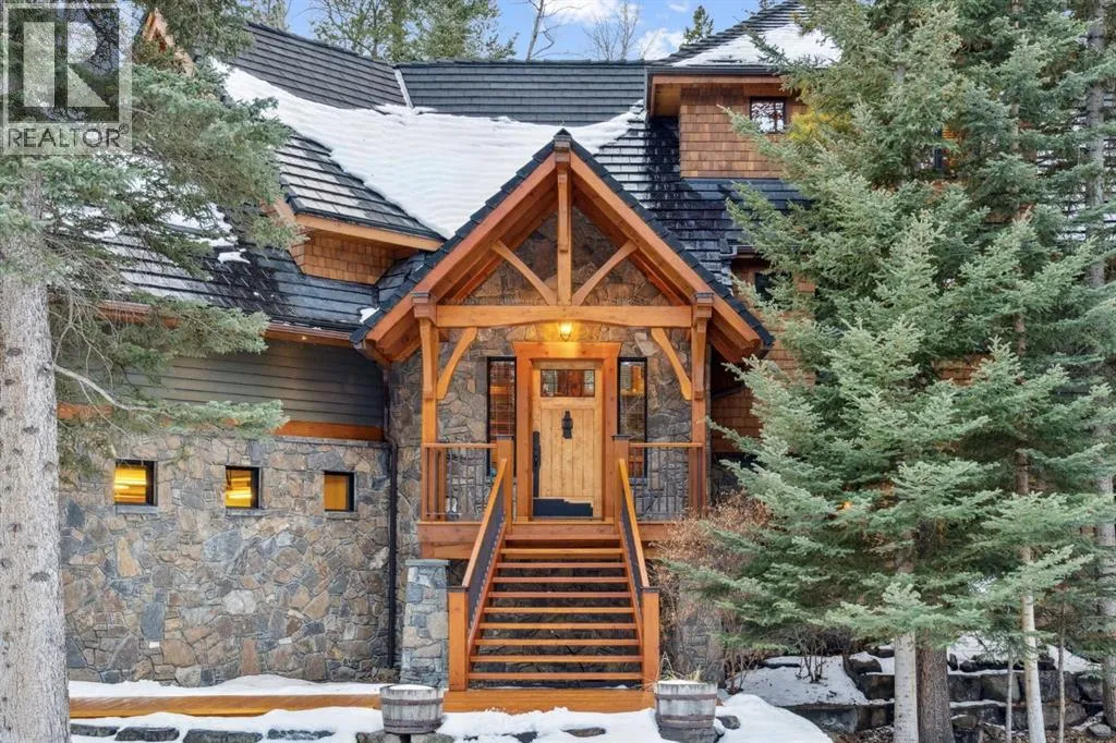 Located in Cairns on the Bow, just minutes from the gates of Banff National Park, this custom 4,000+ sq ft timber-frame residence offers a rare blend of privacy, warmth, and mountain character. Set on a beautifully treed 17,642 sq ft lot within Canmoreâs only gated community, the home combines natural seclusion with exceptional craftsmanship.Inside, soaring fir-paneled ceilings and the timeless elegance of Italian plaster set a warm and sophisticated tone throughout. The open-concept layout seamlessly connects the principal living spaces, ideal for both intimate family moments and grand entertaining. The great room is anchored by a striking Rundle stone wood-burning fireplace, creating a natural gathering space that radiates warmth and character. The kitchen pairs custom cabinetry with Sub-Zero and Viking appliances, thoughtfully designed for everyday living and effortless entertaining. The primary suite offers a peaceful retreat with treetop views and a spa-inspired ensuite finished in Marinace granite and travertine, complete with a jetted tub.Additional highlights include two spacious guest bedrooms, a home theatre, a versatile recreation room, a dedicated home office, and a custom bar â offering flexibility for family and guests alike. Outdoors, professionally landscaped grounds feature natural stonework, a built-in BBQ, and a cozy fire pit, creating the perfect setting for year-round mountain living.A rare opportunity to own a timeless timber-frame home in Cairns on the Bow, where privacy, nature, and thoughtful design come together in perfect harmony. https://163cairns.info/ (id:27476)