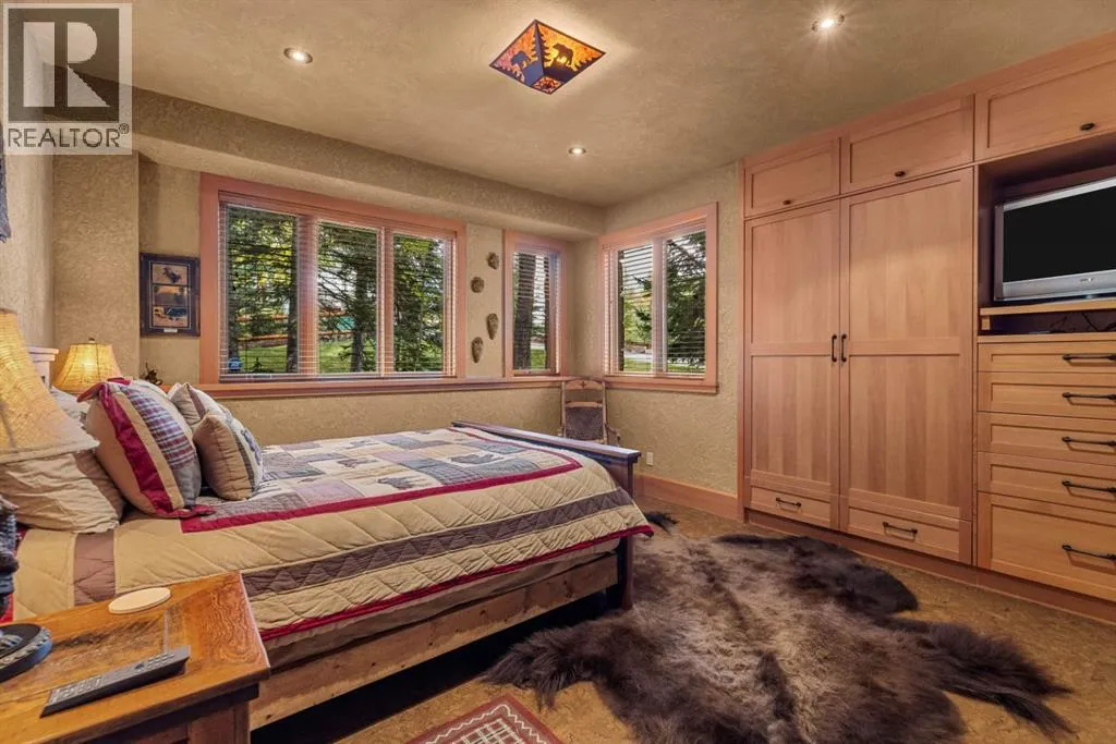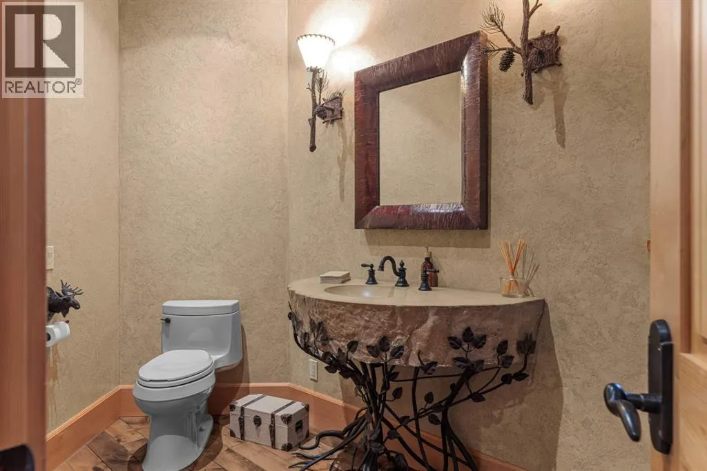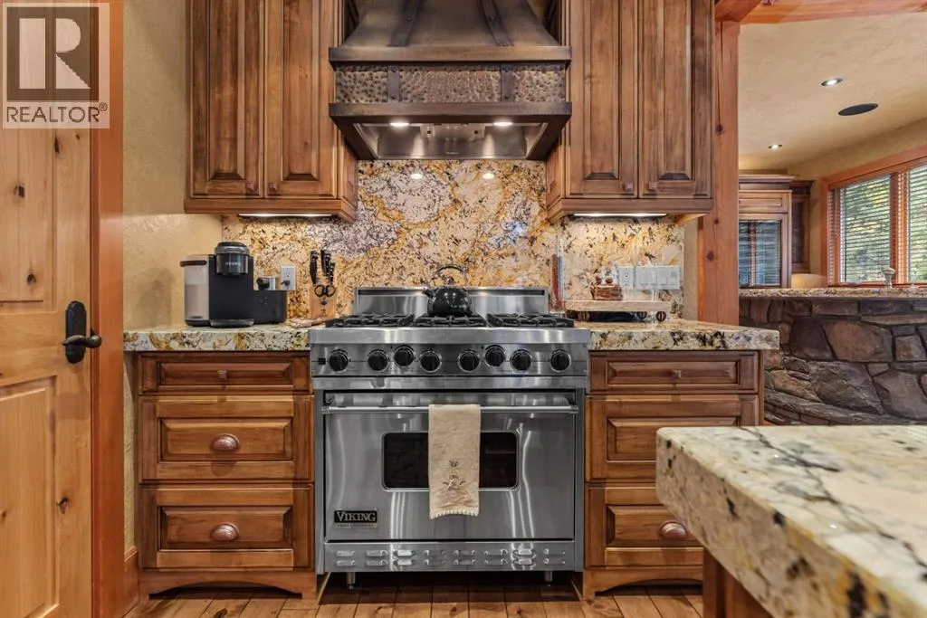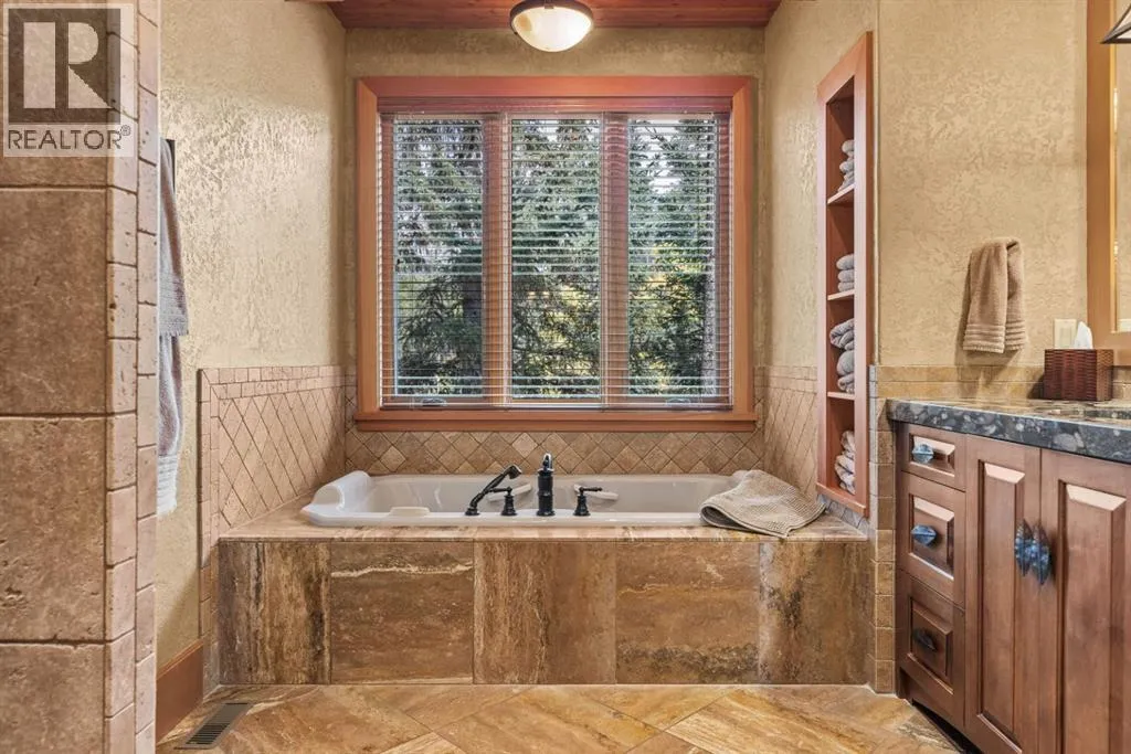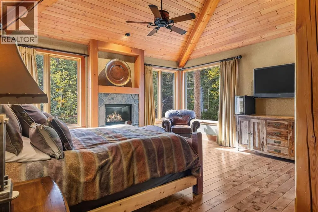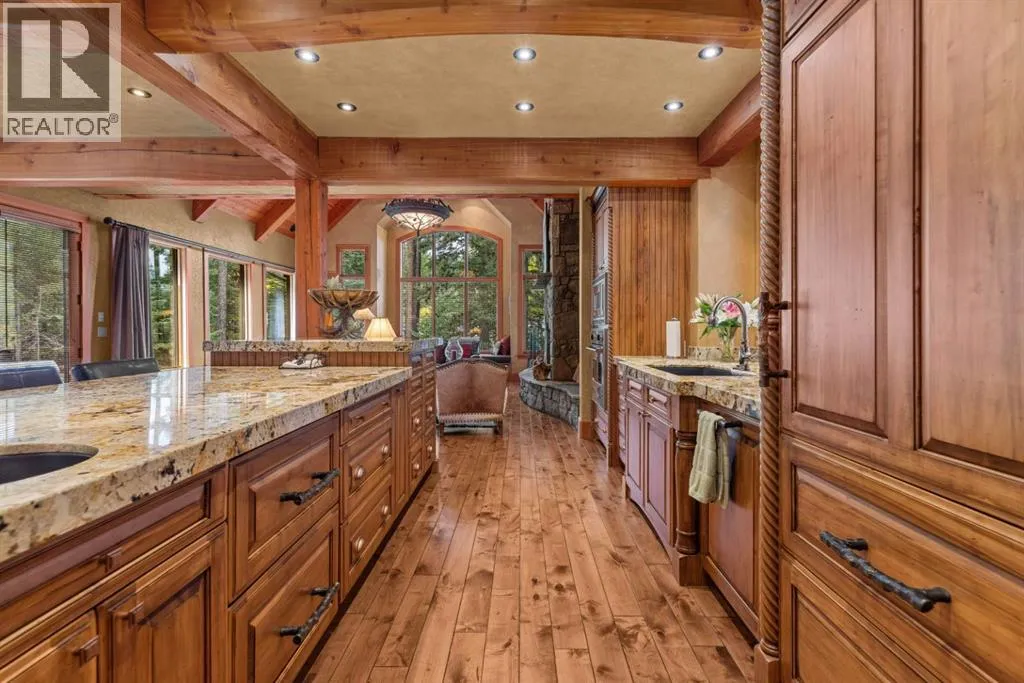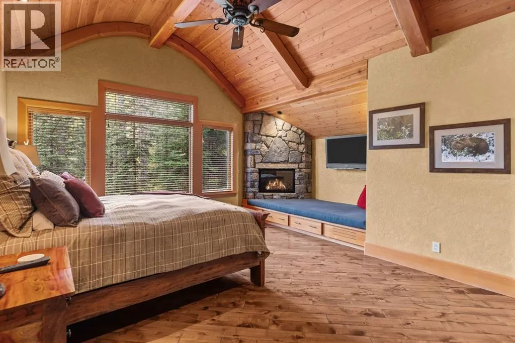 Located in Cairns on the Bow, just minutes from the gates of Banff National Park, this custom 4,000+ sq ft timber-frame residence offers a rare blend of privacy, warmth, and mountain character. Set on a beautifully treed 17,642 sq ft lot within Canmoreâs only gated community, the home combines natural seclusion with exceptional craftsmanship.Inside, soaring fir-paneled ceilings and the timeless elegance of Italian plaster set a warm and sophisticated tone throughout. The open-concept layout seamlessly connects the principal living spaces, ideal for both intimate family moments and grand entertaining. The great room is anchored by a striking Rundle stone wood-burning fireplace, creating a natural gathering space that radiates warmth and character. The kitchen pairs custom cabinetry with Sub-Zero and Viking appliances, thoughtfully designed for everyday living and effortless entertaining. The primary suite offers a peaceful retreat with treetop views and a spa-inspired ensuite finished in Marinace granite and travertine, complete with a jetted tub.Additional highlights include two spacious guest bedrooms, a home theatre, a versatile recreation room, a dedicated home office, and a custom bar â offering flexibility for family and guests alike. Outdoors, professionally landscaped grounds feature natural stonework, a built-in BBQ, and a cozy fire pit, creating the perfect setting for year-round mountain living.A rare opportunity to own a timeless timber-frame home in Cairns on the Bow, where privacy, nature, and thoughtful design come together in perfect harmony. https://163cairns.info/ (id:27476)