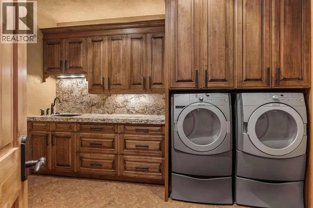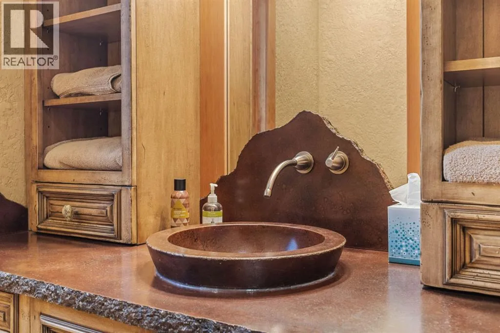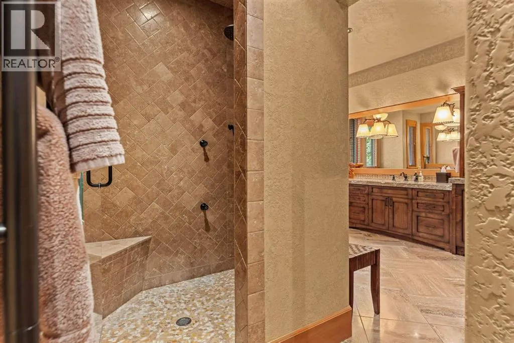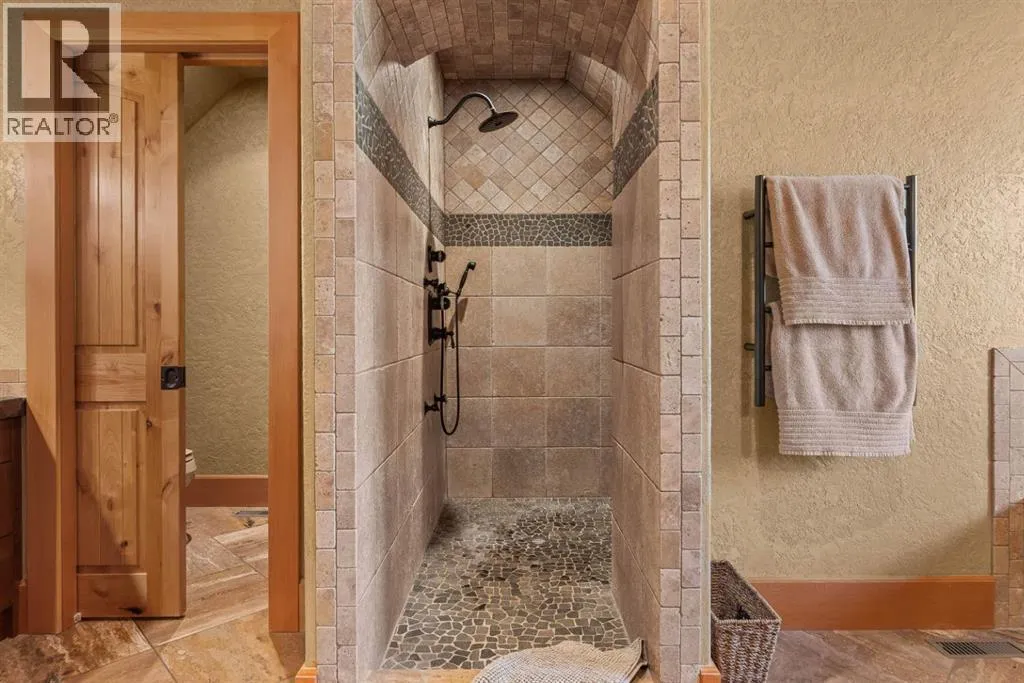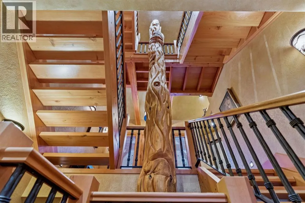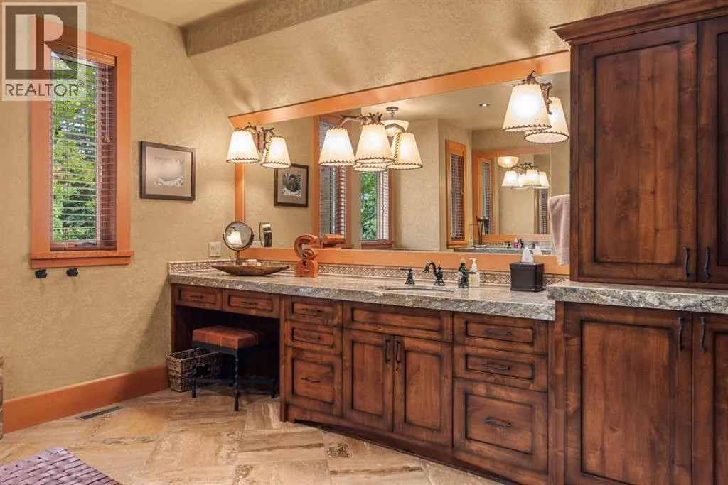 Located in Cairns on the Bow, just minutes from the gates of Banff National Park, this custom 4,000+ sq ft timber-frame residence offers a rare blend of privacy, warmth, and mountain character. Set on a beautifully treed 17,642 sq ft lot within Canmoreâs only gated community, the home combines natural seclusion with exceptional craftsmanship.Inside, soaring fir-paneled ceilings and the timeless elegance of Italian plaster set a warm and sophisticated tone throughout. The open-concept layout seamlessly connects the principal living spaces, ideal for both intimate family moments and grand entertaining. The great room is anchored by a striking Rundle stone wood-burning fireplace, creating a natural gathering space that radiates warmth and character. The kitchen pairs custom cabinetry with Sub-Zero and Viking appliances, thoughtfully designed for everyday living and effortless entertaining. The primary suite offers a peaceful retreat with treetop views and a spa-inspired ensuite finished in Marinace granite and travertine, complete with a jetted tub.Additional highlights include two spacious guest bedrooms, a home theatre, a versatile recreation room, a dedicated home office, and a custom bar â offering flexibility for family and guests alike. Outdoors, professionally landscaped grounds feature natural stonework, a built-in BBQ, and a cozy fire pit, creating the perfect setting for year-round mountain living.A rare opportunity to own a timeless timber-frame home in Cairns on the Bow, where privacy, nature, and thoughtful design come together in perfect harmony. https://163cairns.info/ (id:27476)