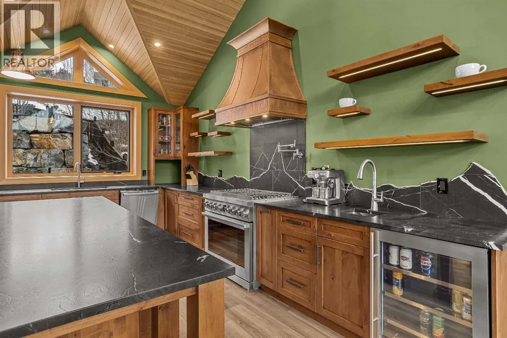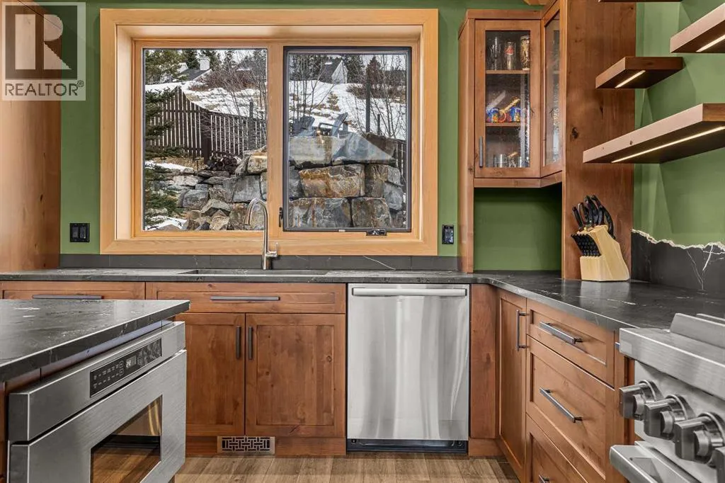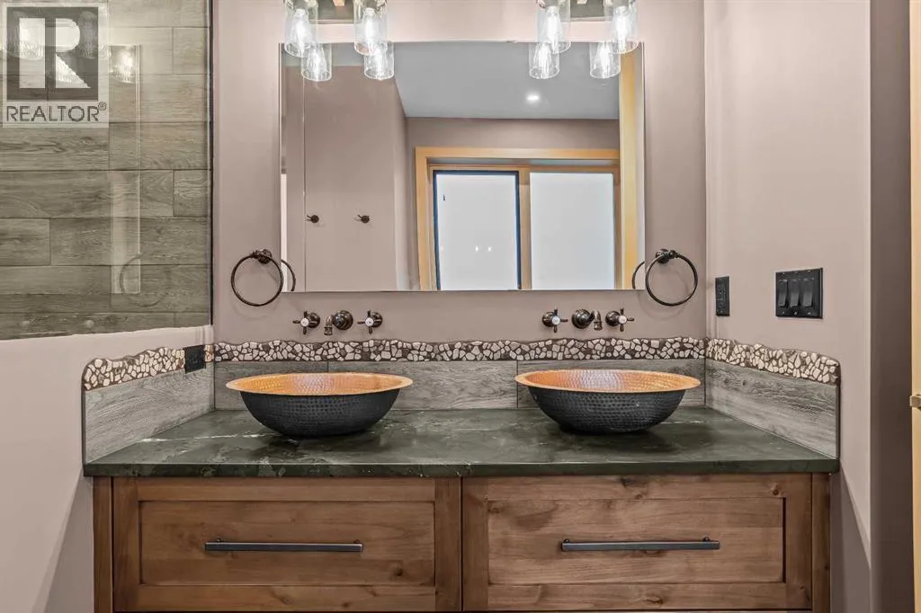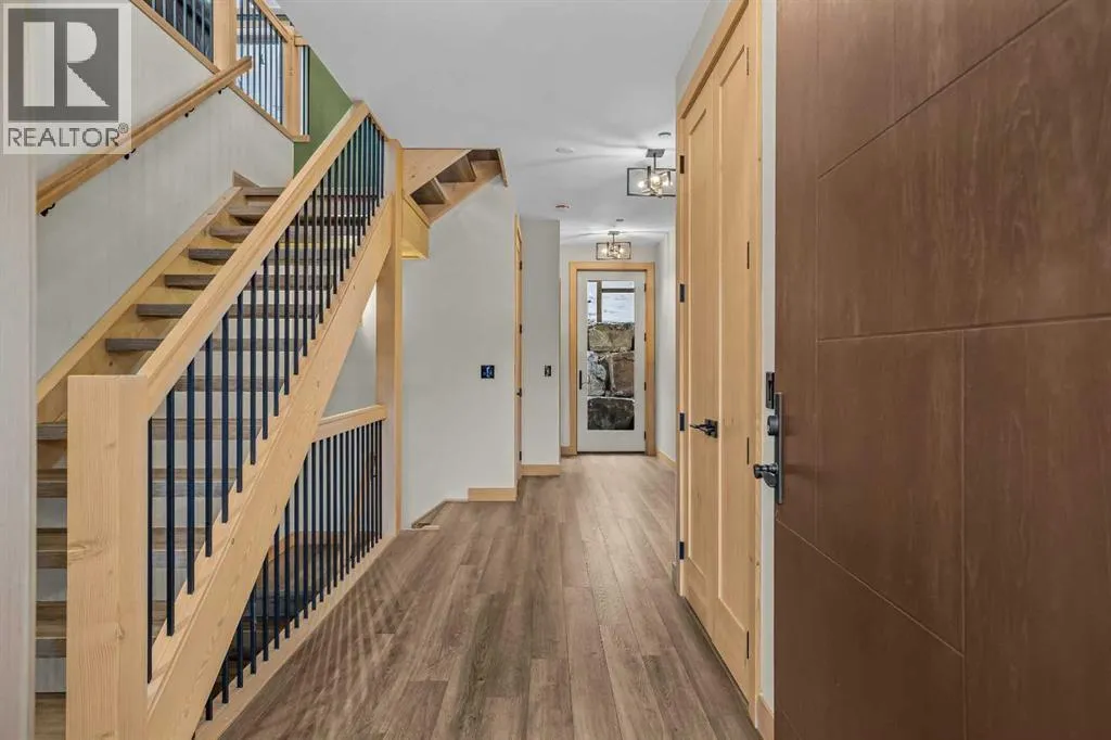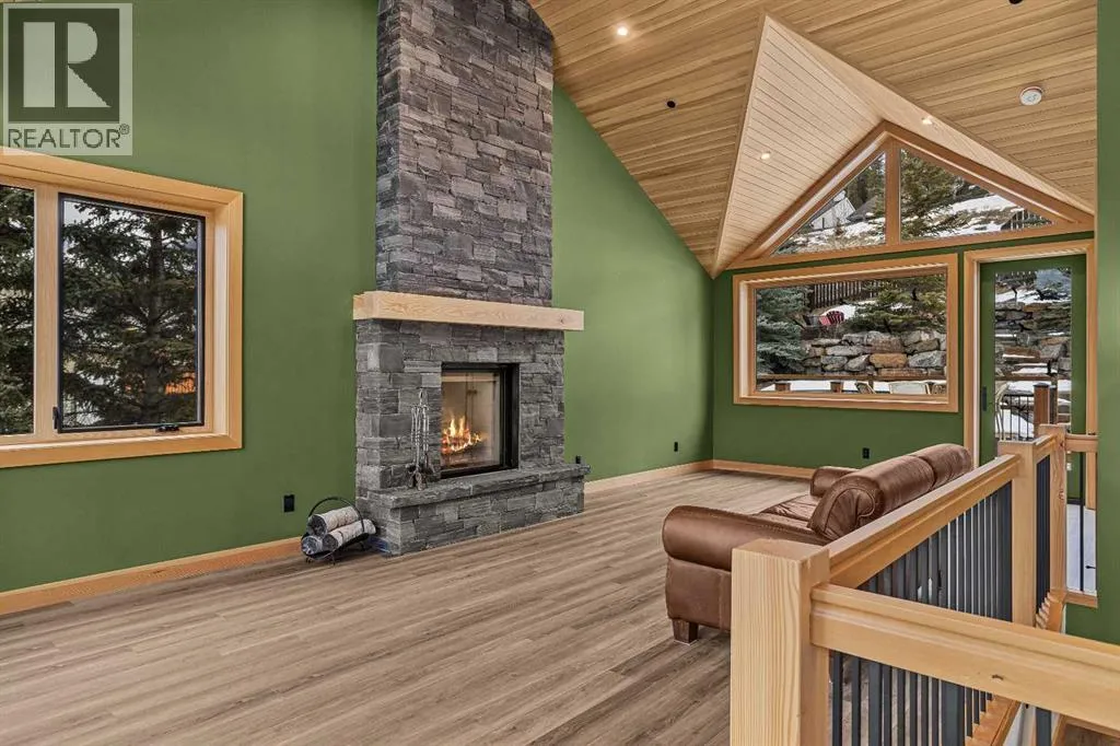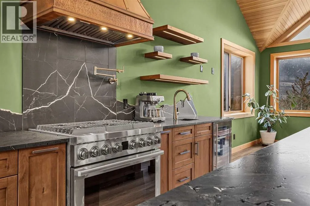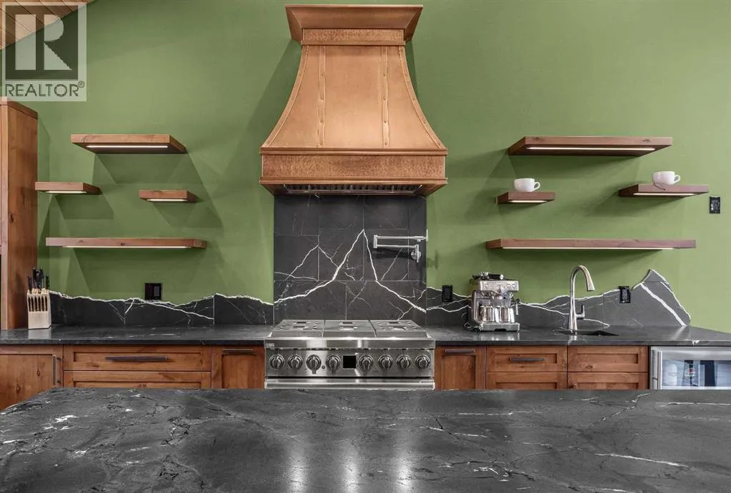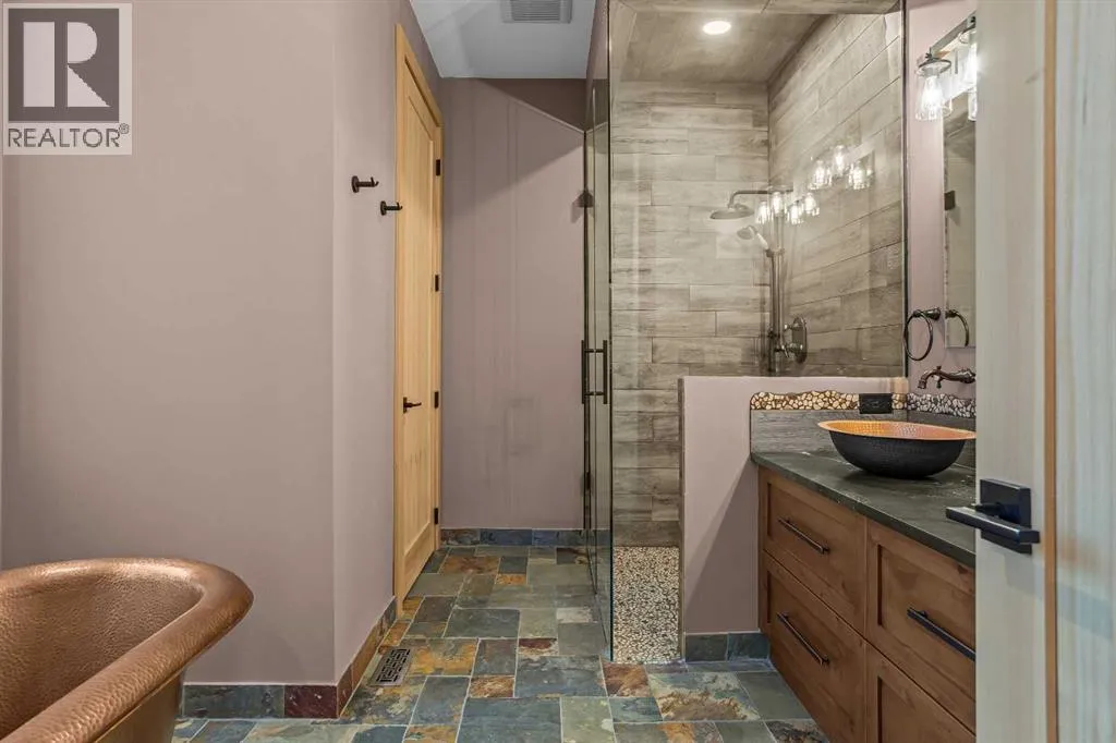 At nearly 3,200 SF, Positioned at the top of a quiet cul-de-sac, 104 Rummel Place captures elevated Bow Valley views in one of Canmoreâs most peaceful residential settings.This 4-bedroom, 4-bathroom custom home blends privacy, scale, and thoughtful design anchored by a triple-car garage with exceptional storage capacity.Vaulted ceilings frame the surrounding mountain and valley views, creating a dramatic yet welcoming upper-level living space. Expansive windows draw natural light throughout, while multiple outdoor patios and balconies offer seamless indoor-outdoor living.The backyard is truly exceptional fully fenced and thoughtfully terraced with multiple lounging areas, a covered hot tub retreat, fire pit, and a private viewing platform perched above the valley an ideal vantage point to take in Canmoreâs landscape.The kitchen is designed for entertaining, featuring a large island, gas range, prep sink, and generous workspace. The main level includes a spacious primary suite complete with a walk-in closet and a striking copper bathtub in the ensuite a distinctive design feature that elevates the space. Two additional bedrooms offer direct access to outdoor areas.The lower level includes a recreation room, fourth bedroom, and full bathroom, creating flexibility for guests, family, or additional living space.Additional features include in-floor heat throughout, heated driveway and steps, solar panels, elevator access to all levels, and rough-in for a future sauna or Nordic spa.This is a home defined by its position elevated, private, and immersed in nature while remaining just minutes from downtown Canmore. (id:27476)