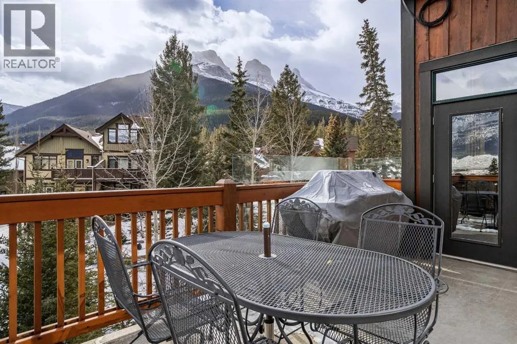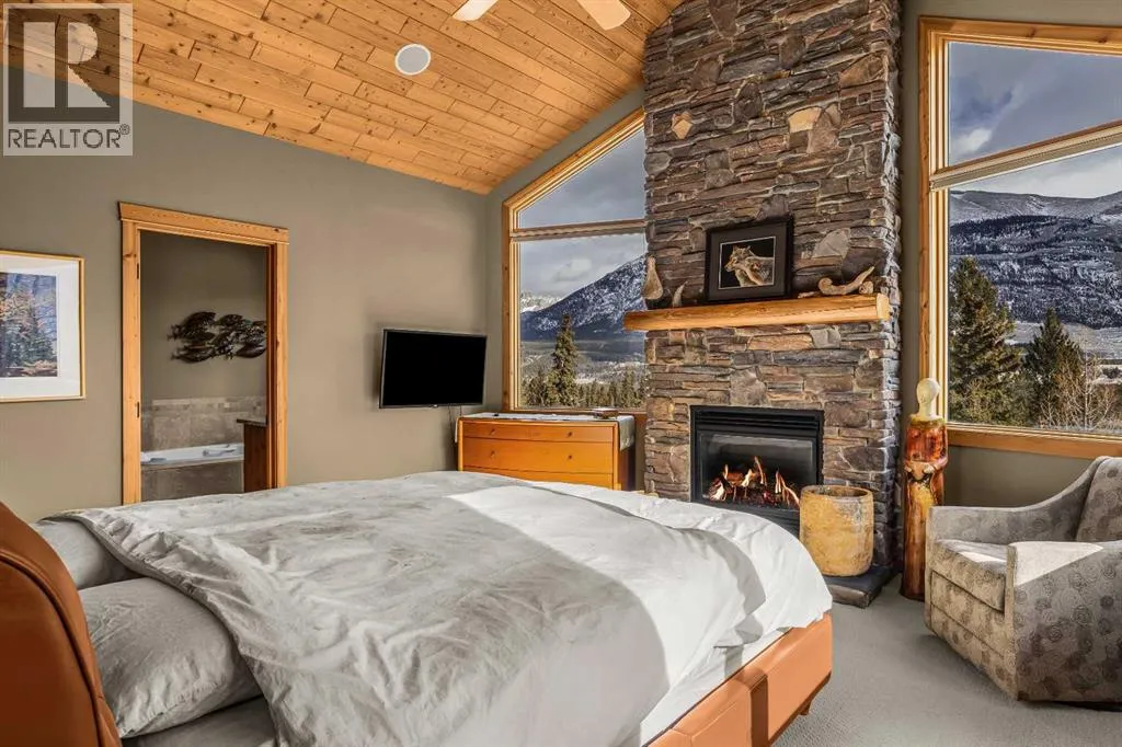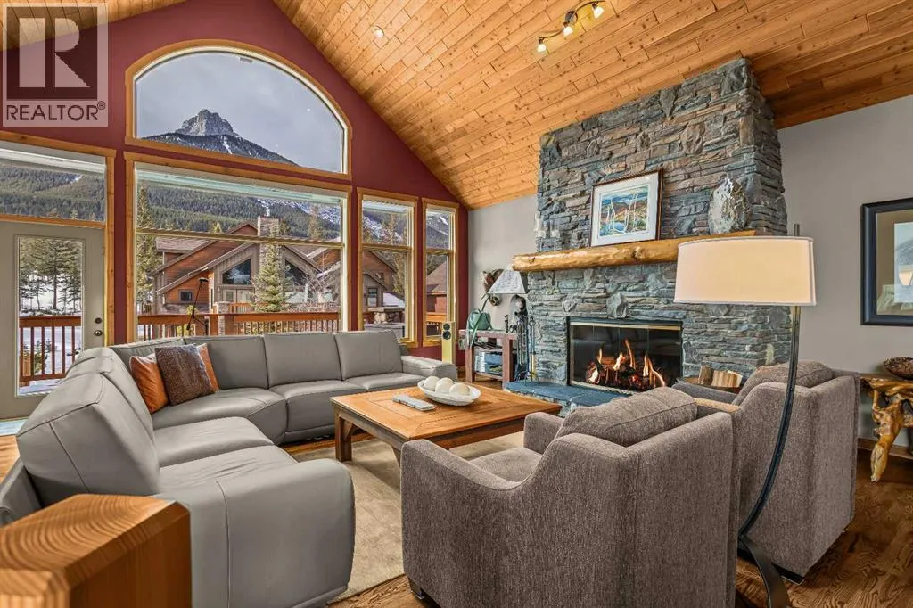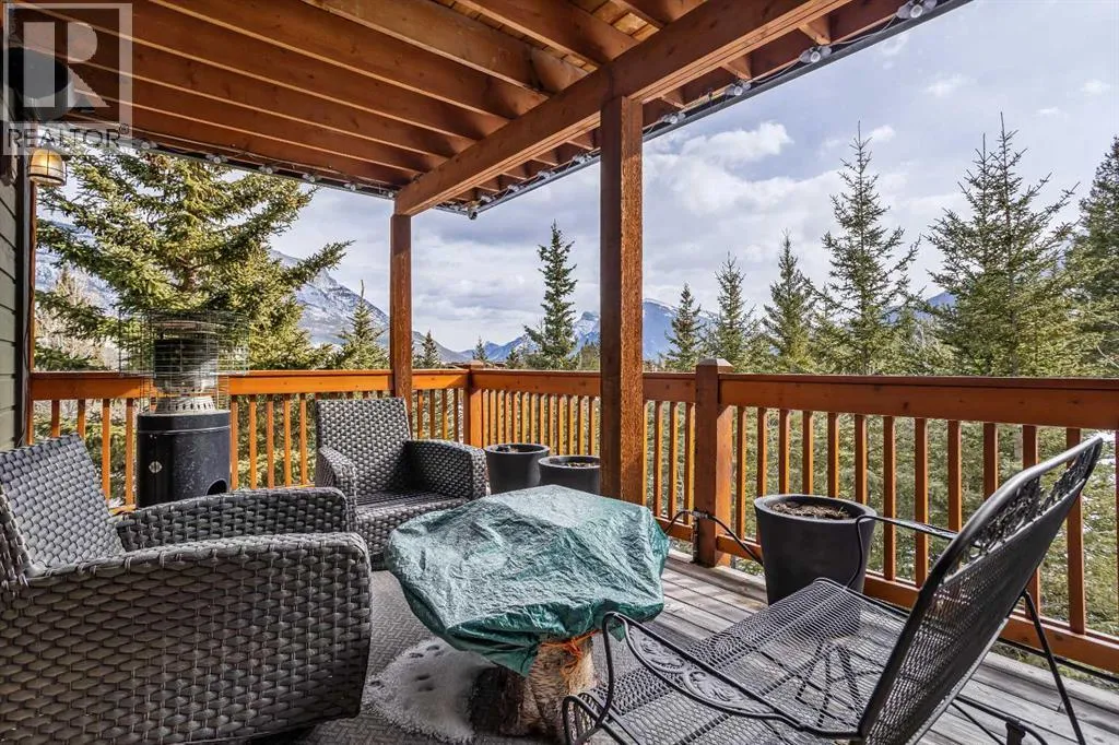 Set within the exclusive enclave of Hubman Landing, this 5-bedroom, 5-bathroom residence offers over 4,100 sq ft of living space, thoughtfully positioned to capture exceptional views from nearly every window. Elevated above the surrounding trees and backing onto privacy, the home embraces its natural setting with multiple outdoor patios and balconies designed to take full advantage of the landscape. The main level is anchored by vaulted ceilings and warm hardwood flooring, creating a timeless Canmore aesthetic. The kitchen is both functional and inviting, opening into generous living and dining spaces that frame the mountains beyond. The primary suite is conveniently located on the main floor for true one-level living and features a striking floor-to-ceiling fireplace, creating a dramatic focal point while maintaining a sense of comfort and retreat.The walkout lower level provides additional living space with separation between levels, ideal for guests, family, or multi-generational living. With five bedrooms and five bathrooms in total, the layout offers flexibility without compromising privacy. A tranquil backyard with a flagstone patio and fire pit, surrounded by mature trees, offers a private outdoor retreat that complements the homeâs elevated setting. A double-car garage, expansive square footage, and a setting that combines elevation, views, and seclusion make this a rare opportunity in one of Canmoreâs most sought-after communities. (id:27476)