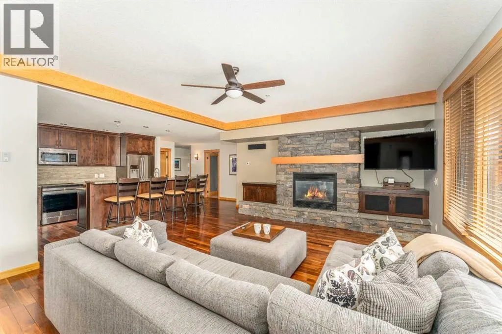 Discover elevated mountain living at Timberline Lodges in this beautifully finished 2-bedroom plus den corner suite. Designed with both comfort and style in mind, the bright open-concept layout creates a seamless flow throughout the home. The thoughtfully designed chefâs kitchen features sleek granite countertops, quality stainless steel appliances, and ample prep space, opening effortlessly into the spacious living area. Here, a dramatic Rundle stone gas fireplace sets a warm and inviting tone, offering an ideal setting to unwind or host in style.Enjoy meals in the dining area framed by a wall of sliding glass doors that lead to your oversized covered balcony, a private outdoor retreat positioned to capture snow-capped views while offering a tranquil sense of seclusion. The generous primary bedroom serves as a peaceful escape, complete with a walk-in closet and a spa-inspired five-piece ensuite with double vanity. Situated on the opposite side of the suite, the second bedroom provides excellent privacy for family or visitors. A versatile den adds flexibility as a home office, reading space, or potential third sleeping area.Additional highlights include in-suite laundry, heated underground parking, and a separate storage locker. Timberline Lodges residents enjoy exceptional amenities such as an indoor pool, hot tubs, fitness centre, theatre room, and a beautifully appointed Great Room ideal for social gatherings. Surrounded by landscaped pathways, scenic trails, and the acclaimed Stewart Creek Golf Course, this home offers the perfect balance of adventure and serenity. The nearby Three Sisters Village Gateway commercial district, with planned shops, restaurants, a liquor store, and grocery options, will further enhance the convenience of this already exceptional mountain lifestyle. (id:27476)