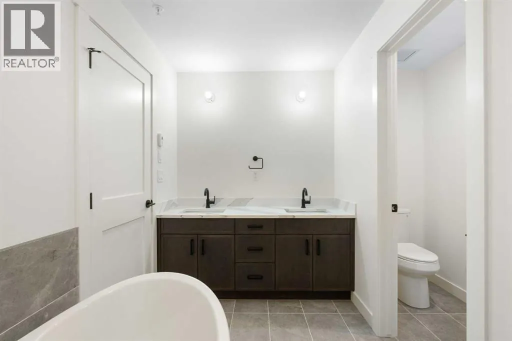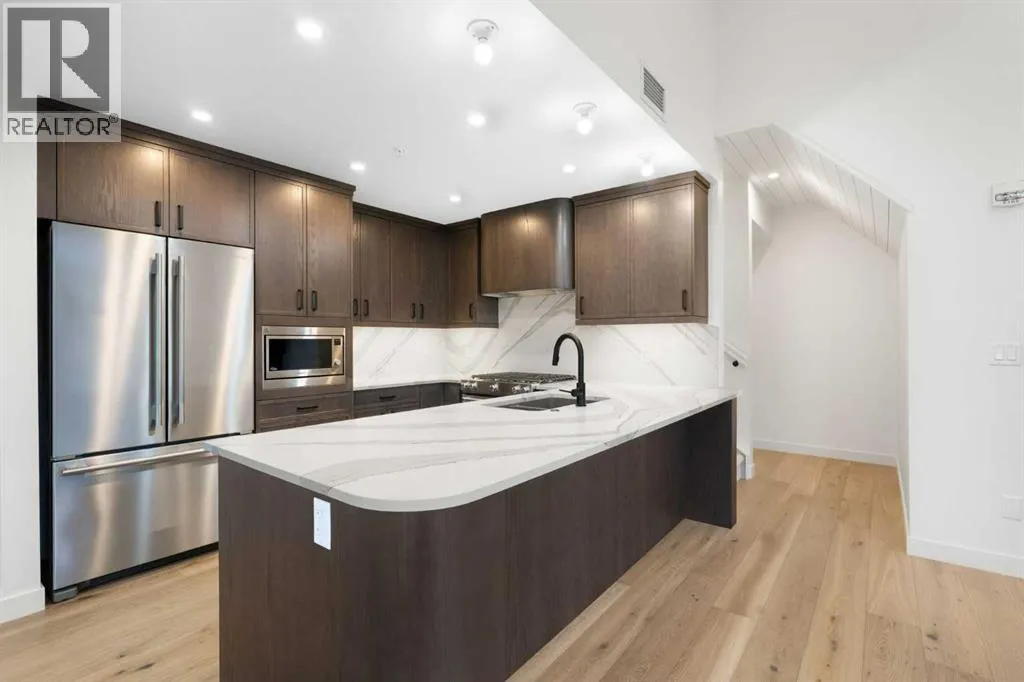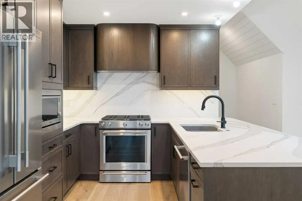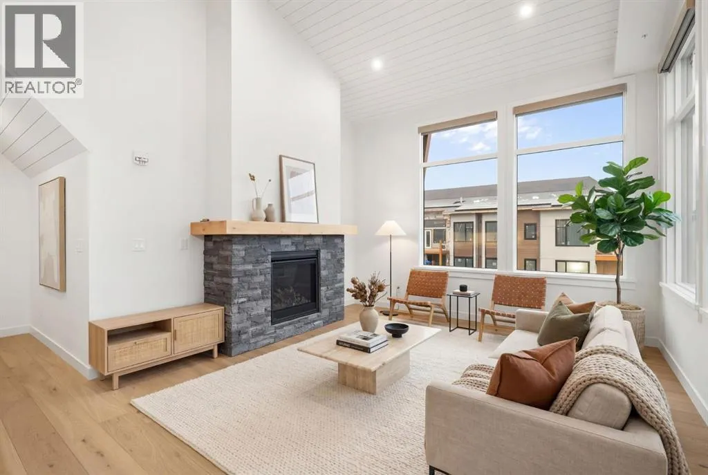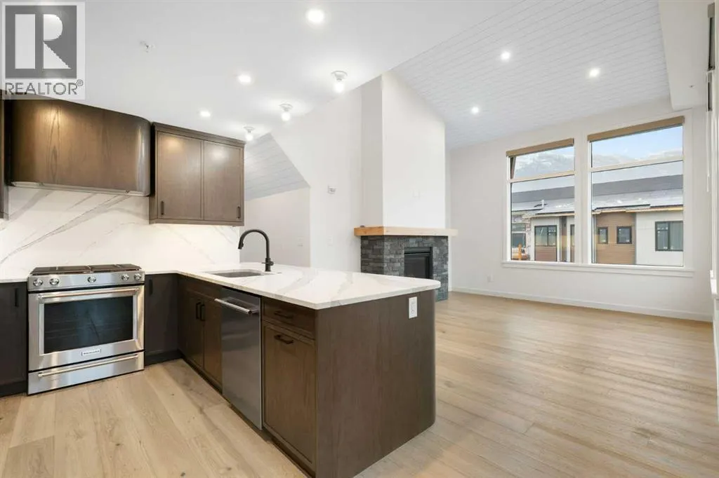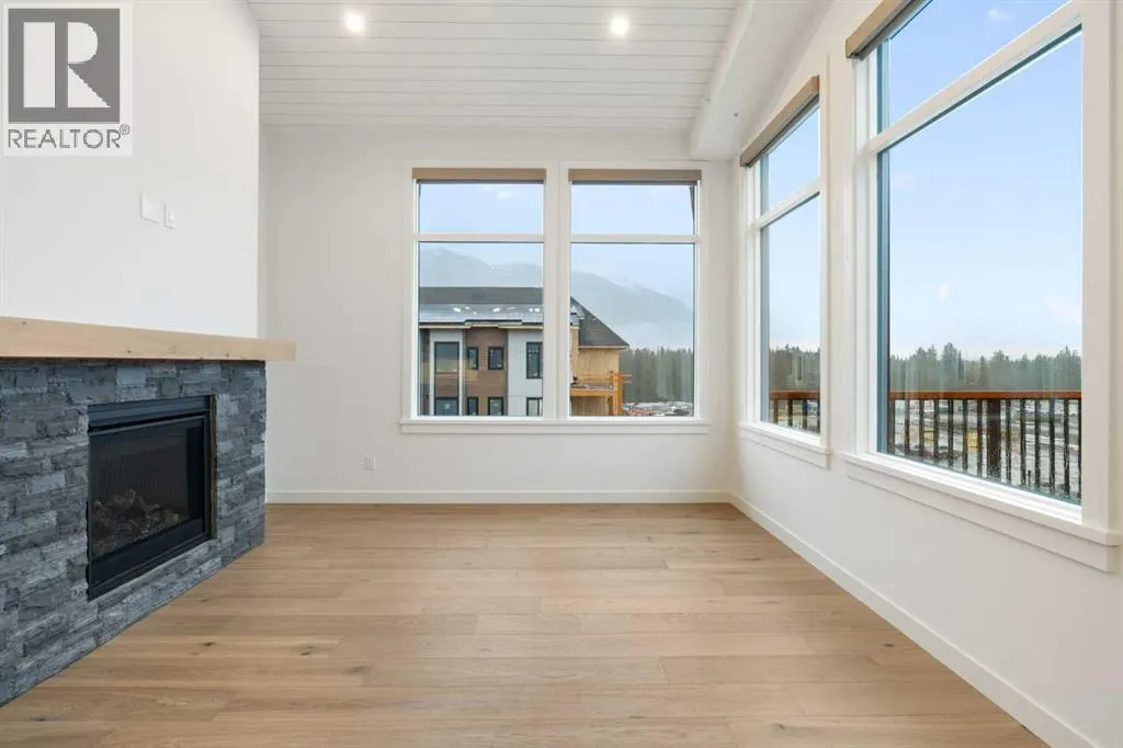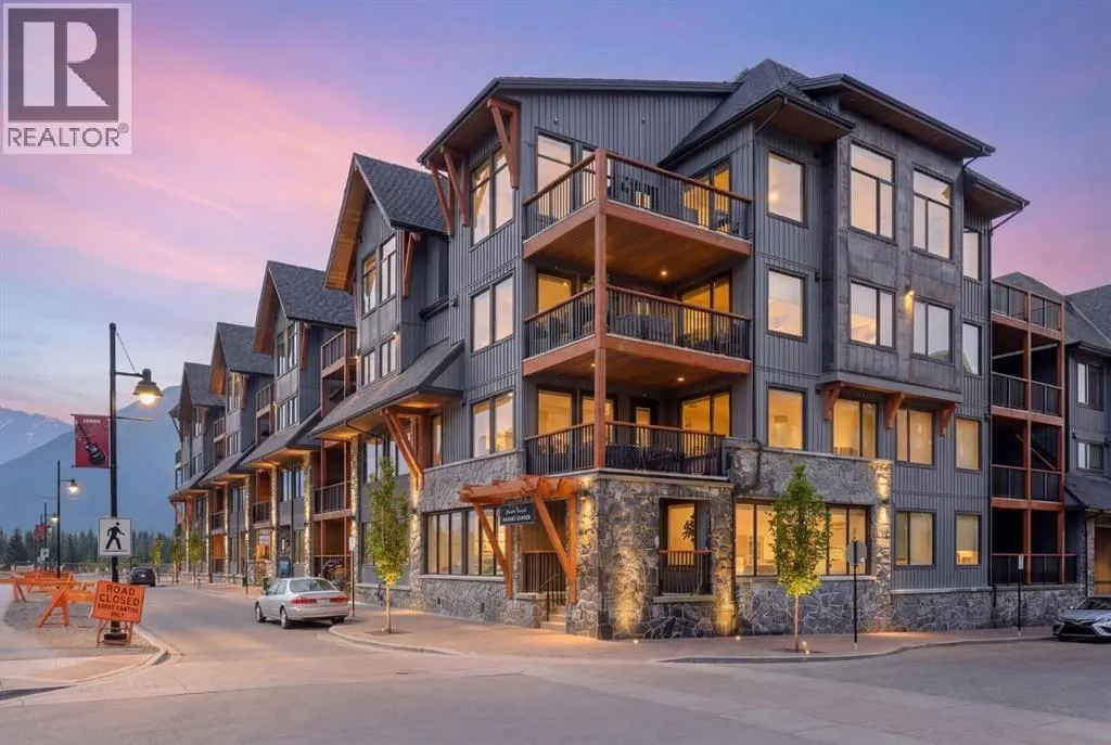 Welcome Home to Black Swift Lodge! Enjoy over 1,500 sq ft of exquisite living space in the sought after community of Silver Creek. Brand new and never lived in, this corner penthouse is ready for you to experience mountain town living at its finest. 2 Bedroom, 2 Bathroom and a Flex loft space make this perfect for anyone looking for a home that is walkable, quiet and away from busy city life. Vaulted ceilings, large windows and light colour palette make this unit bright and open. The well-appointed kitchen offers quartz countertops, solid wood cabinets and upgraded appliances including a gas stove and custom integrated hood fan. The living room with gas fireplace leads to the large corner deck with BBQ gas line and SE mountain views of Three Sisters. The primary suite is complete with a walk-in closet and 5pc ensuite. Located on the other side of the unit for extra privacy, the 2nd bedroom with walk-in closet is steps to the 3pc bath with walk-in shower. The loft is a perfect location for a home office, studio or additional living space. Add a murphy bed for extra guest space! The in-floor heating & central cooling is geothermal. Engineered Hardwood, custom window coverings and recessed lighting through-out. Convenient full sized in-suite laundry. Amenities include a fitness centre, outdoor courtyard with hot tub and secure underground parking with bicycle storage. Included are 2 titled parking stalls and assigned storage unit. Steps to Spring Creek Market and walking distance to downtown Canmore. Covered under Alberta New Home Warranty and available immediately. 20 minutes to Banff. 1 hr to Calgary. Outdoor enthusiasts will enjoy 80 km of regional trails with easy access to hiking, Nordic skiing and cycling. Experience everything living at Silver Creek has to offer! (id:27476)