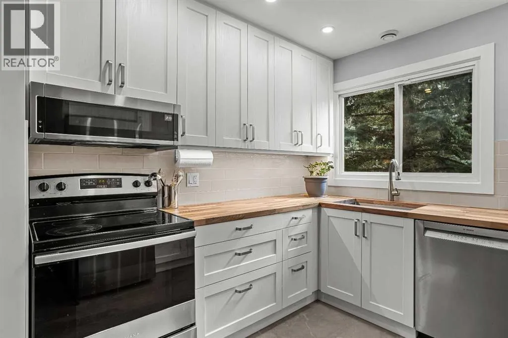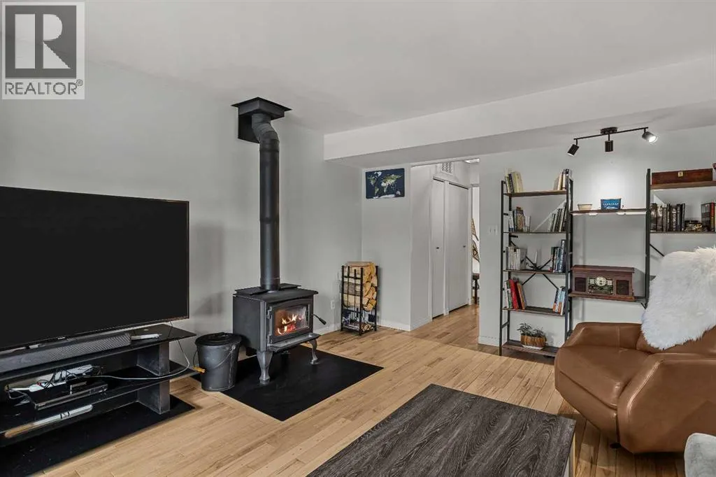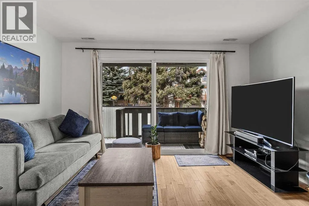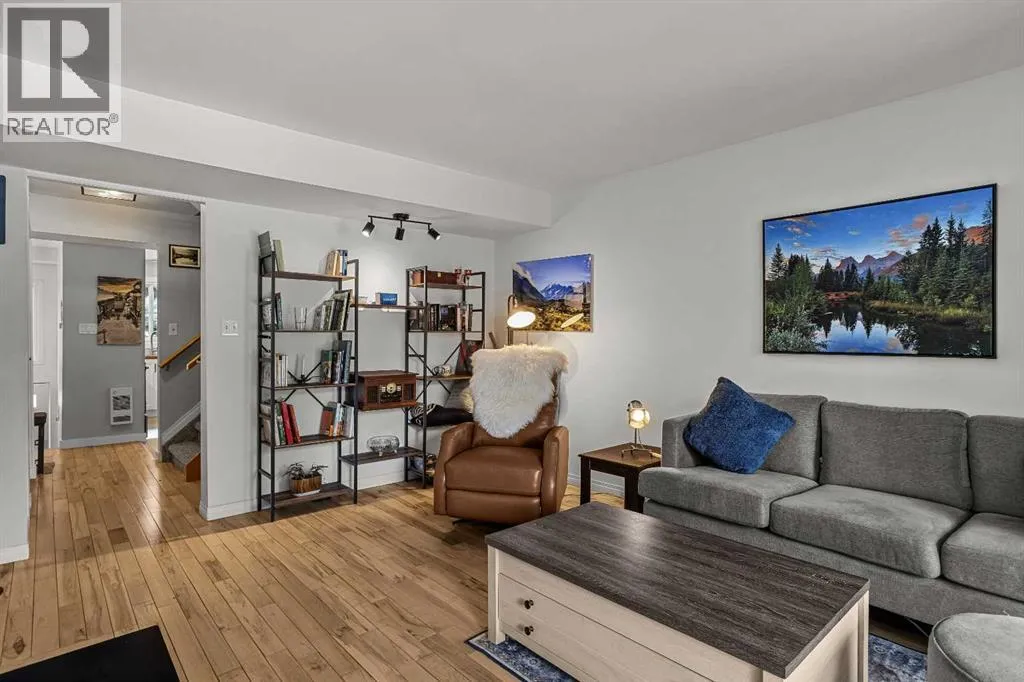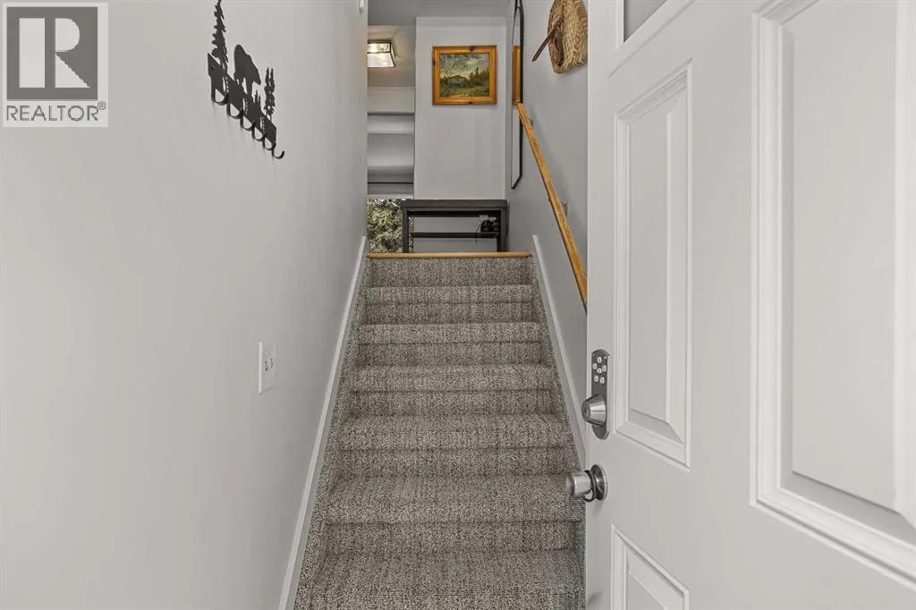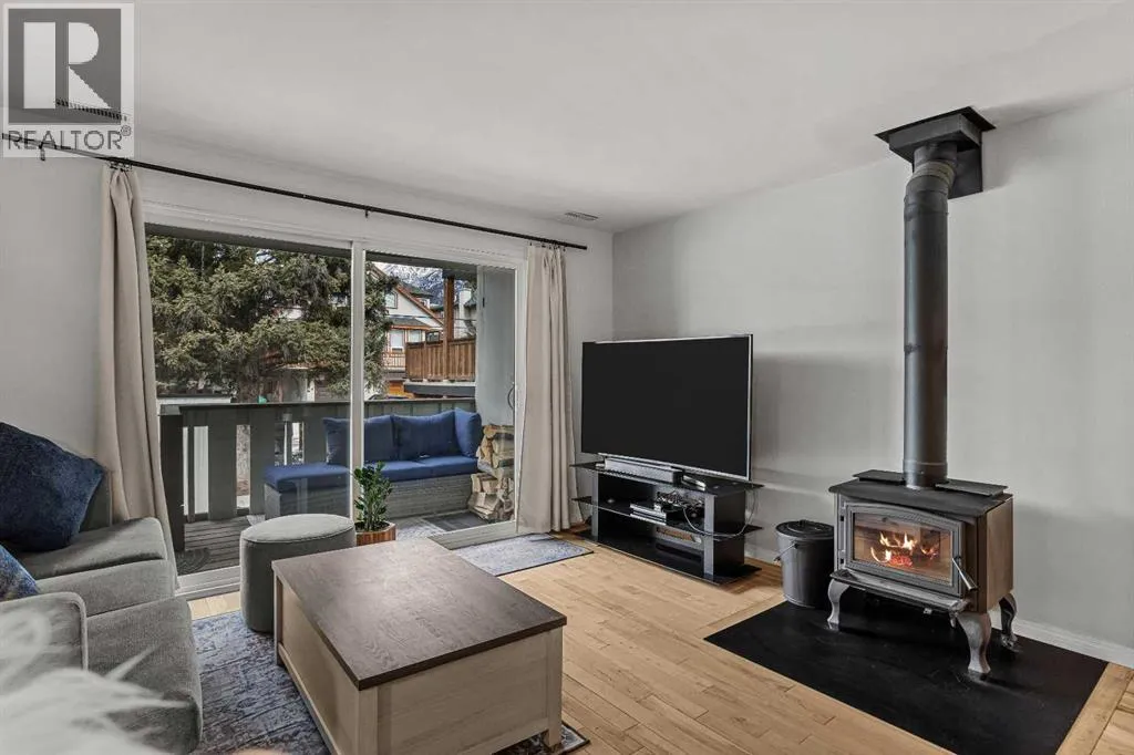 On a quiet street, only blocks from the Bow River as well as the enticing sights & sounds of Canmoreâs vibrant Main St, this mechanically & cosmetically, fully renovated 2 bed top level end unit townhome is a âturnkeyâ stand-out. Entering from ground level, the landing leads up to a spacious & completely remodelled eat-in kitchen. Light & bright finishes gleam as sun pours in through recently replaced south-facing windows. New flooring & smooth, âpaint gradeâ ceilings transition to the living room in a seamless fashion. Here, an airtight wood-burning stove is a major upgrade from the original fireplace & is a wonderful focal point in this restful space. Through new sliding doors, a covered deck adds outdoor living space where convenient stairs take you to the rear yard of the complex. Up stairs flanked in new handrails, you arrive at a broad landing complete with side-by-side laundry, storage & a convenient laundry folding area. The mechanical room contains a new furnace & hot water tank. The bedrooms are a hallmark of a time when developers built more generous floor plans, where the primary bedroom size rivals those in far more costly homes. The second bedroom is also comfortably proportioned. Both share a 4-pc bathroom with designer touches. One off street parking space, a sizable storage shed, all in a well-managed corporation offers value second to none. (id:27476)