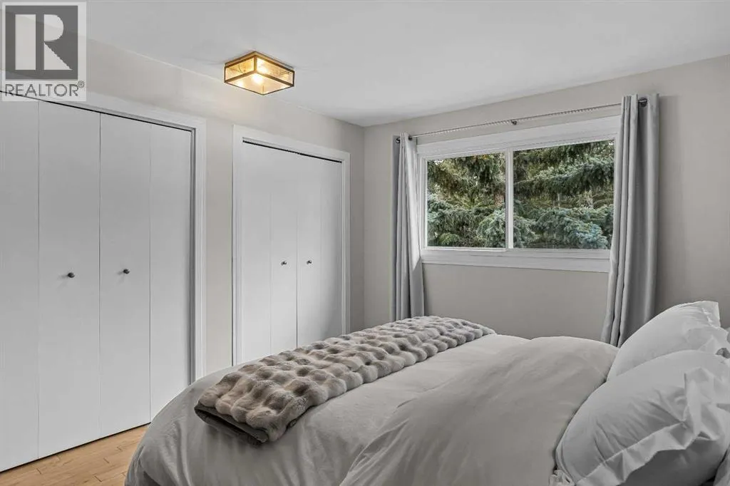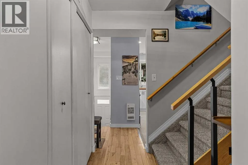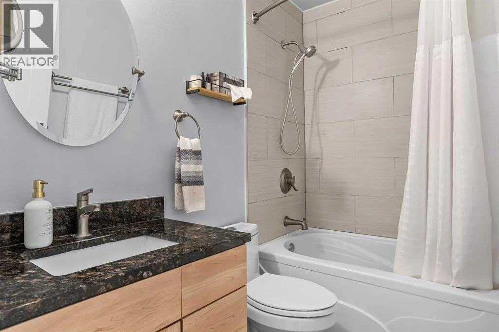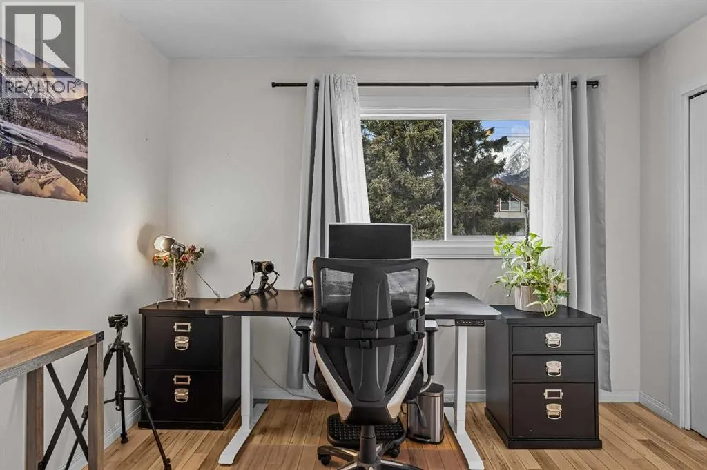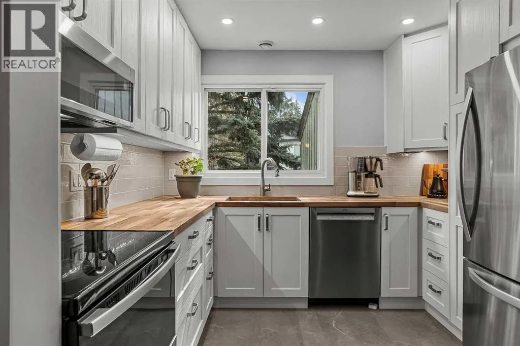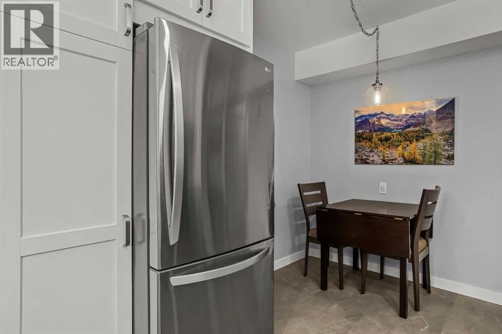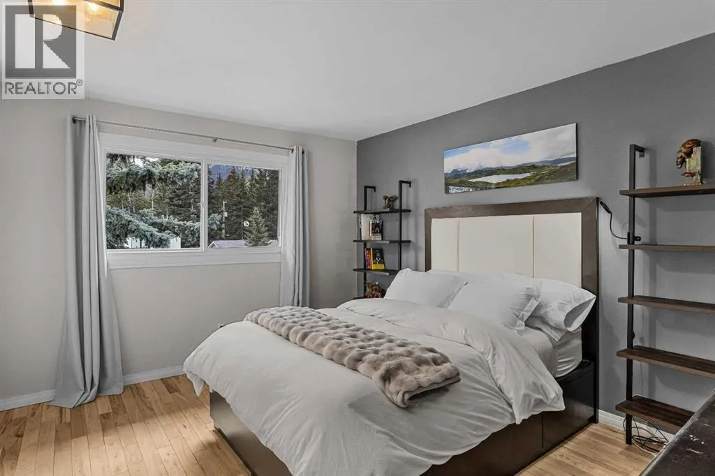 On a quiet street, only blocks from the Bow River as well as the enticing sights & sounds of Canmoreâs vibrant Main St, this mechanically & cosmetically, fully renovated 2 bed top level end unit townhome is a âturnkeyâ stand-out. Entering from ground level, the landing leads up to a spacious & completely remodelled eat-in kitchen. Light & bright finishes gleam as sun pours in through recently replaced south-facing windows. New flooring & smooth, âpaint gradeâ ceilings transition to the living room in a seamless fashion. Here, an airtight wood-burning stove is a major upgrade from the original fireplace & is a wonderful focal point in this restful space. Through new sliding doors, a covered deck adds outdoor living space where convenient stairs take you to the rear yard of the complex. Up stairs flanked in new handrails, you arrive at a broad landing complete with side-by-side laundry, storage & a convenient laundry folding area. The mechanical room contains a new furnace & hot water tank. The bedrooms are a hallmark of a time when developers built more generous floor plans, where the primary bedroom size rivals those in far more costly homes. The second bedroom is also comfortably proportioned. Both share a 4-pc bathroom with designer touches. One off street parking space, a sizable storage shed, all in a well-managed corporation offers value second to none. (id:27476)