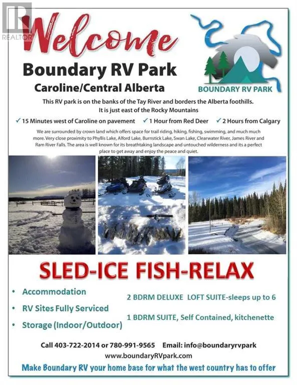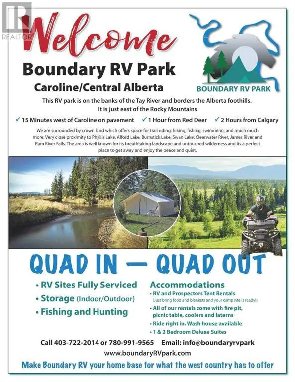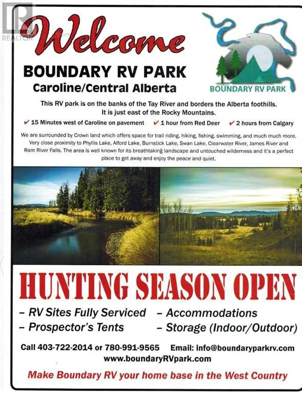 Welcome to Boundary RV Park, a thriving destination nestled in the heart of west-central Alberta, where adventure and tranquility meet. Established in 2014, this property has continually evolved with enhanced infrastructure to provide an exceptional experience for our guests. 51 fully serviced RV sites come equipped with power, water, and septic connections. 15 P/W RV sites. 10 Power only RV sites. Additional 30 non-serviced sites are available for lease and rental drop-ins. Enjoy seasonal camping from May 15th to October 15th, with the added bonus of off-season camping introduced in the 2020/21 season due to high demand.Explore the diverse accommodations, including three cozy cabins, three unique geodesic domes, tree houses, and a well-appointed prospector tent all designed to create memorable getaways. A modern wash facility, playground, quad wash station, and group shelter with a gas BBQ ensure that your stay is comfortable and convenient. The spacious 180âx70â riding arena, currently used for storage, offers potential for future development. The charming Country Store features a snack bar with homemade delights, freshly brewed coffee, and an internet café. Local artisans showcase their beautiful works, making it the perfect spot to relax and refuel. The main house boasts 1,526 sq ft of upgraded living space, including a desirable 1-bedroom suite. Additionally, an oversized detached 2-car garage houses a 2-bedroom loft suite for guests or rental income. Don't miss the original log homestead, which is eligible for restoration funding. There is also a park model mobile home with a fenced yard for added privacy. All this set on a sprawling 42 acres, with 20 acres zoned agricultural and 22 acres designated RF, the parkâs potential is truly remarkable. The RF area can accommodate up to 154 RV sites, with opportunities for subdividing and creating condo RV lots along the scenic Tay River. With the possibility of leasing a service station on the nearby highway, the business prospects are promising.Boundary RV Park borders the picturesque Alberta foothills and is conveniently located just 15 minutes west of Caroline on paved roads, with easy access to outdoor adventures. The stunning backdrop of the Rocky Mountains is only a short drive away, making it an ideal base for exploring.Surrounded by crown land and unique attractions, Boundary RV Park is a gateway to world-class recreational activities. Enjoy trail riding, quadding, hiking, fishing, and swimmingâall while immersing yourself in the breathtaking landscape and untouched wilderness. Newly developed quad trails, prime hunting areas, and blue-ribbon fishing await your discovery.With convenience in mind, youâll find Boundary RV Park just 35 minutes to Rocky Mountain House, 1 hour to Red Deer, and a short 2.75 hours to Edmonton. Experience the beauty of Ram River Falls just 45 minutes away, and explore the nearby Tay, Phyllis, Alford, Burnstick, and Swan Lakes, along with the Clearwater and James Rivers. (id:27476)