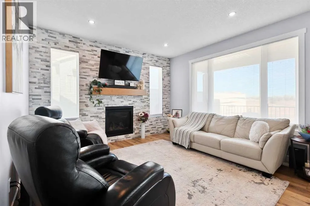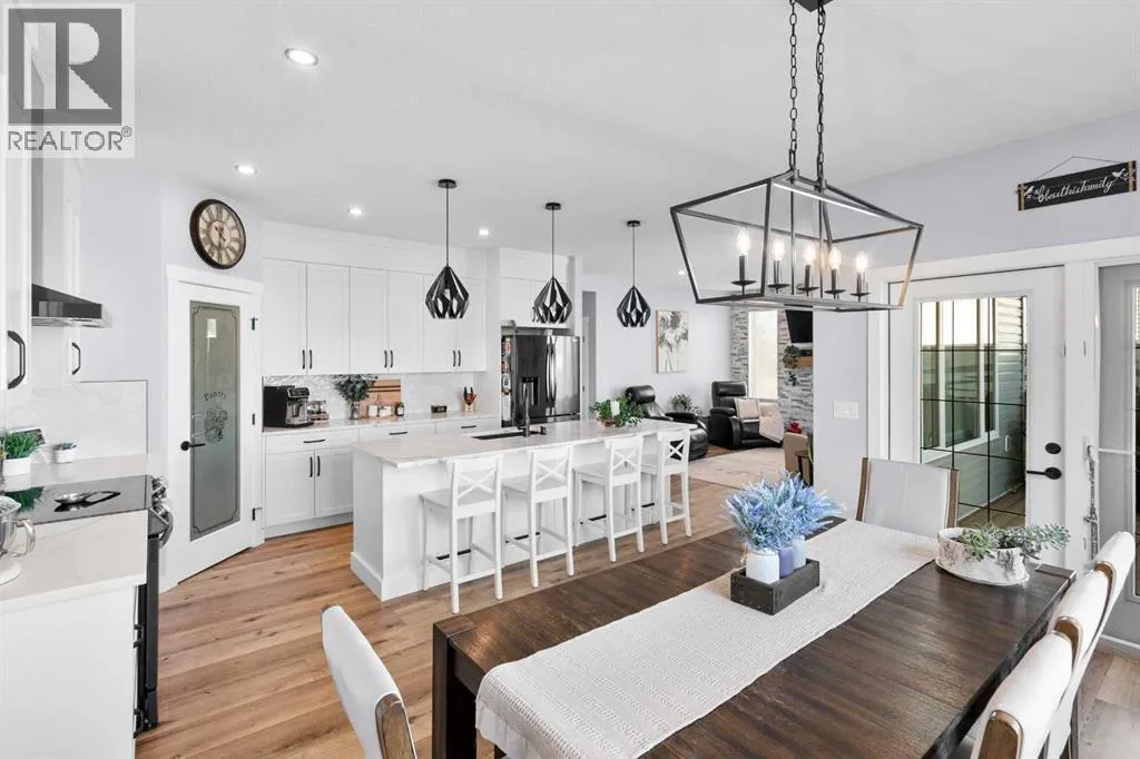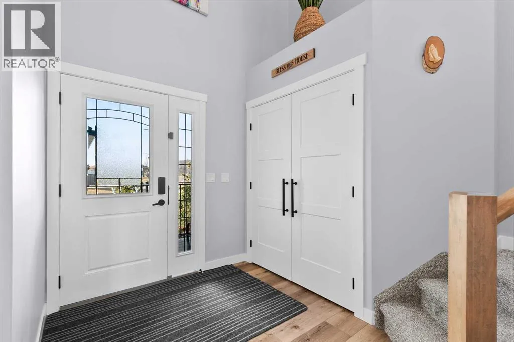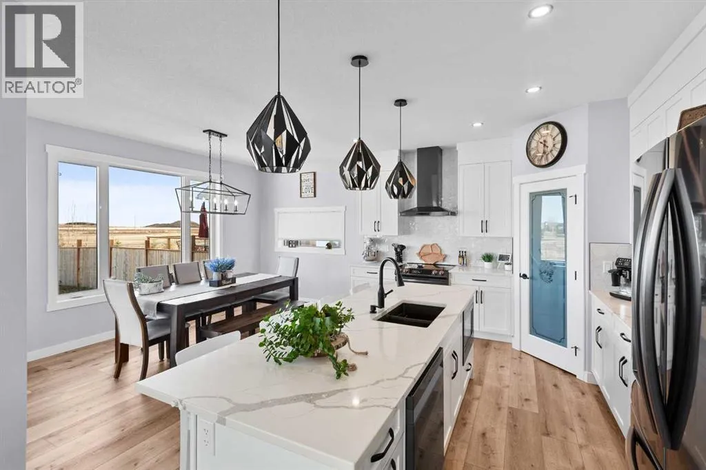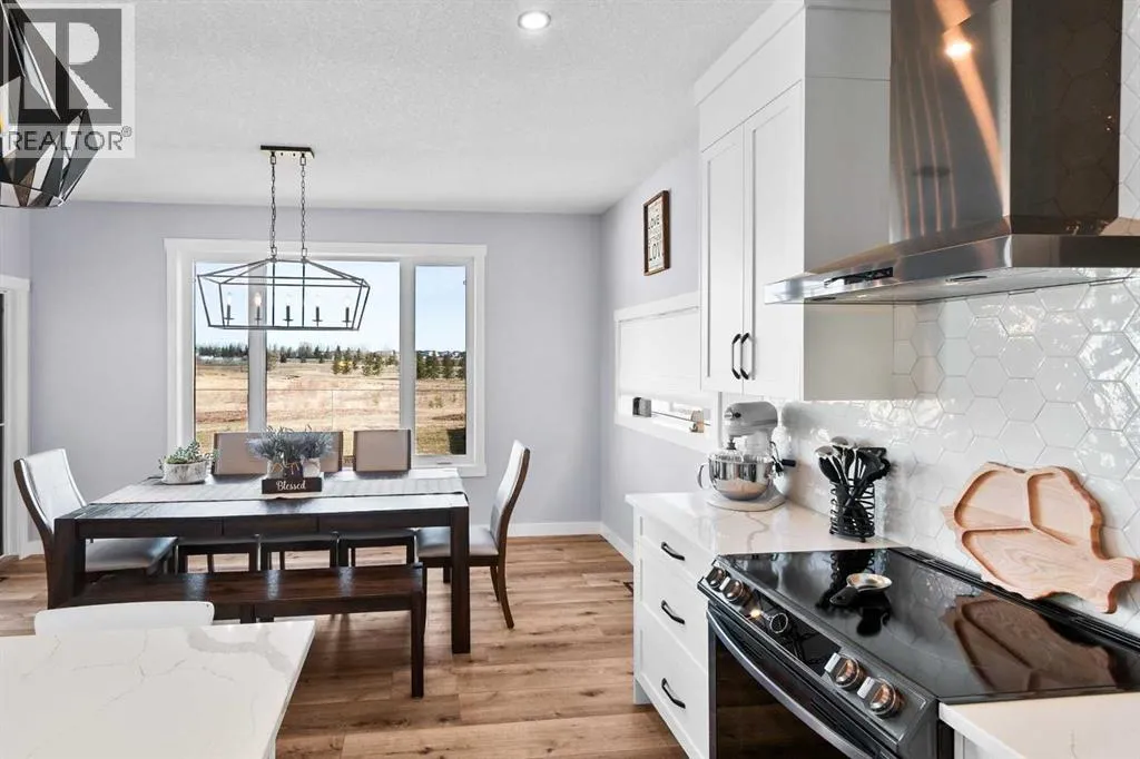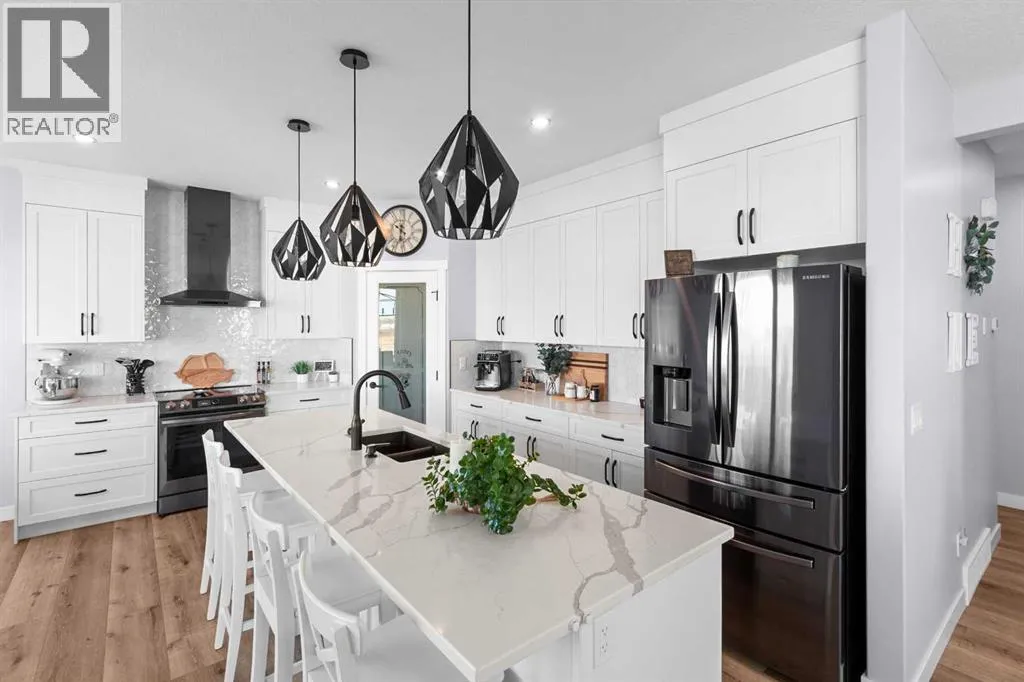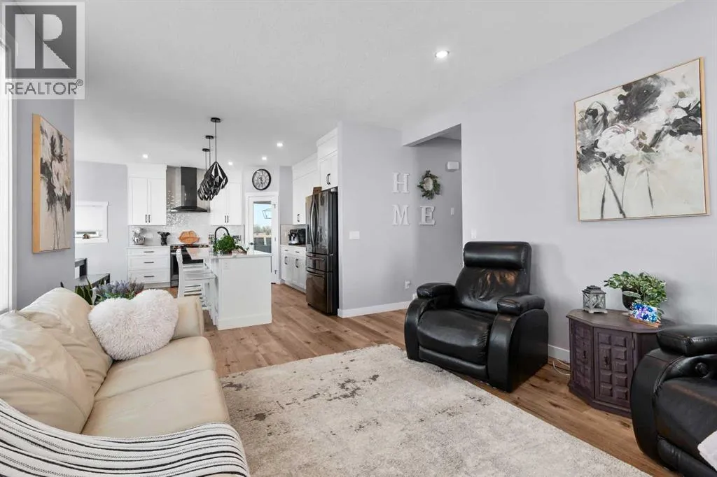 This spotless home was built by a local reputable builder (Anchored Custom Homes) and it backs the Nature Space in Carstairs. It has many added features such as extra windows, special trim, oversized island, wood shelves, 9 ft basement and much more that is evident when you walk through. The front entry is spacious with its full height ceiling. Go next Into the great room which has vaulted ceilings and vinyl plank flooring. The generous sized living room has a gas fireplace with windows on each side and a brick feature wall. The bright white kitchen has a large island with quartz counters and lots of counter space and cabinets. The microwave is tucked under the counter and the pantry is a walk thru one with wood shelves. The dining room is large enough for a big table and has a big window which faces the back yard and the view of the park/nature space WITHOUT ANY NEIGHBORS BEHIND. The door from the dining area leads to the covered back deck and the partially fenced yard. There is an area with gravel that is ready for a patio level. Back inside on the main floor is the powder room with quartz counter, a laundry room and the entry to the garage. The 23x24 ft garage is insulated, drywalled and painted and has an infrared heater. It easily fits 2 vehicles. Upstairs you will find a large primary bedroom with ensuite which has double vanities and a separate shower as well as soaker tub. The walk in closet is large. There are 2 more bedrooms on this level with nice windows and great closets. The main bathroom is large. The basement is ready for your development ideas with large windows and 9 ft ceilings. There is an alley on the west side of the house which makes RV parking easy. Make an appointment today to see this special home. You will not be disappointed. (id:27476)