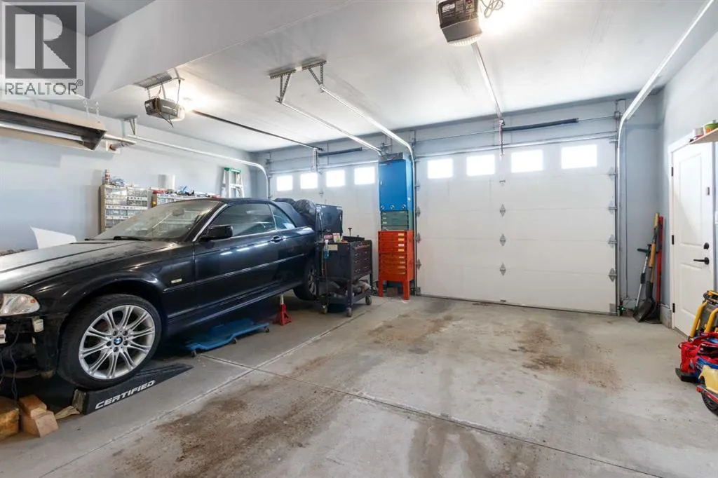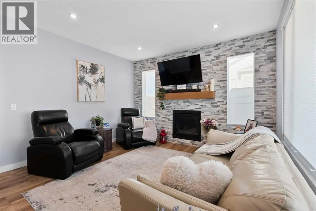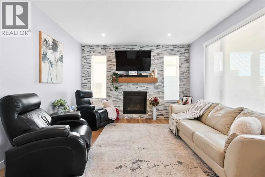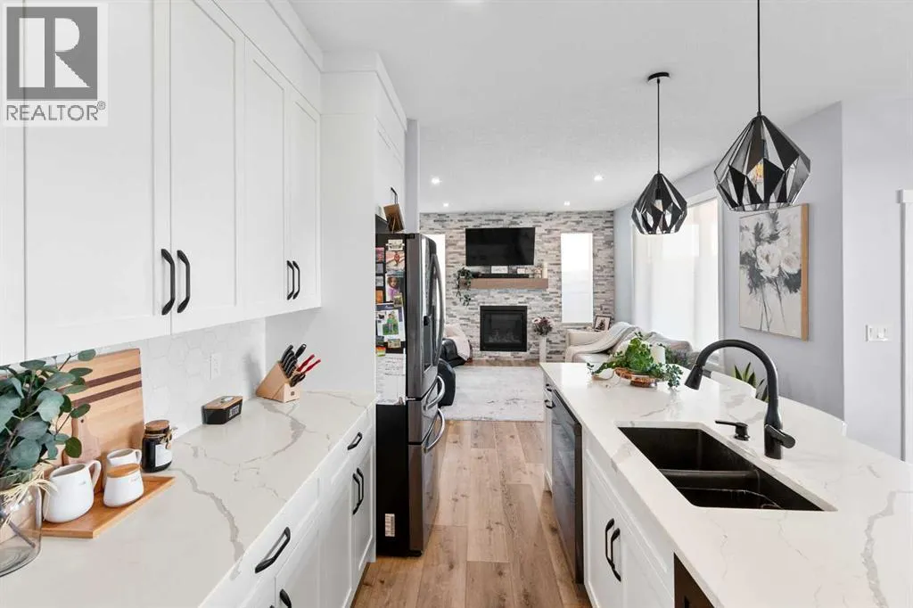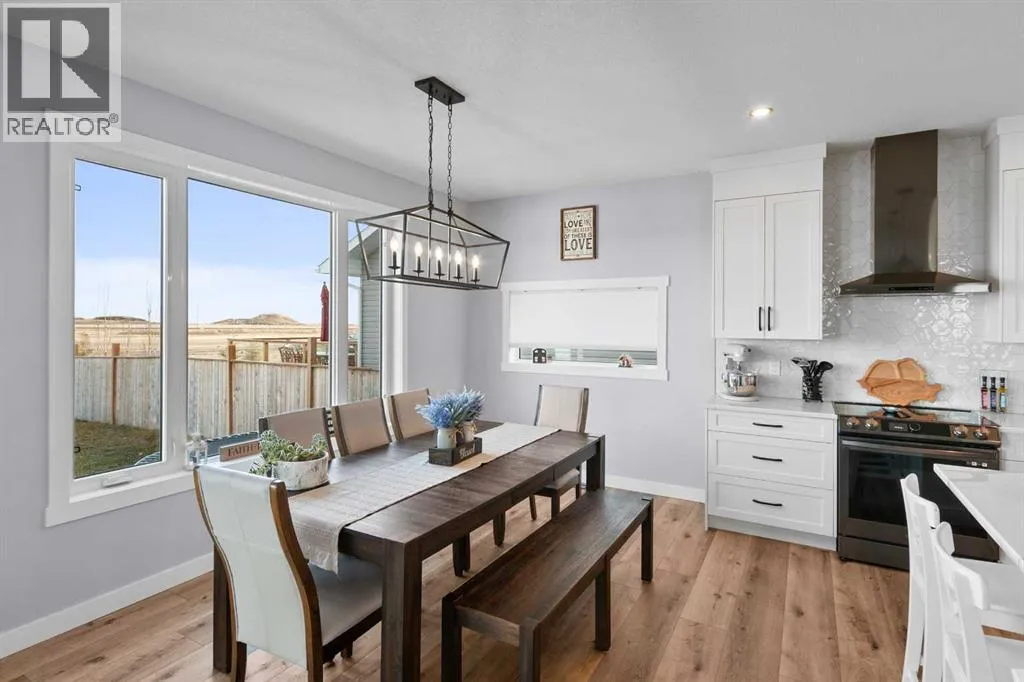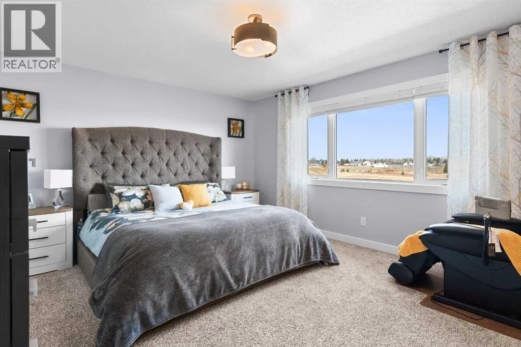 This spotless home was built by a local reputable builder (Anchored Custom Homes) and it backs the Nature Space in Carstairs. It has many added features such as extra windows, special trim, oversized island, wood shelves, 9 ft basement and much more that is evident when you walk through. The front entry is spacious with its full height ceiling. Go next Into the great room which has vaulted ceilings and vinyl plank flooring. The generous sized living room has a gas fireplace with windows on each side and a brick feature wall. The bright white kitchen has a large island with quartz counters and lots of counter space and cabinets. The microwave is tucked under the counter and the pantry is a walk thru one with wood shelves. The dining room is large enough for a big table and has a big window which faces the back yard and the view of the park/nature space WITHOUT ANY NEIGHBORS BEHIND. The door from the dining area leads to the covered back deck and the partially fenced yard. There is an area with gravel that is ready for a patio level. Back inside on the main floor is the powder room with quartz counter, a laundry room and the entry to the garage. The 23x24 ft garage is insulated, drywalled and painted and has an infrared heater. It easily fits 2 vehicles. Upstairs you will find a large primary bedroom with ensuite which has double vanities and a separate shower as well as soaker tub. The walk in closet is large. There are 2 more bedrooms on this level with nice windows and great closets. The main bathroom is large. The basement is ready for your development ideas with large windows and 9 ft ceilings. There is an alley on the west side of the house which makes RV parking easy. Make an appointment today to see this special home. You will not be disappointed. (id:27476)