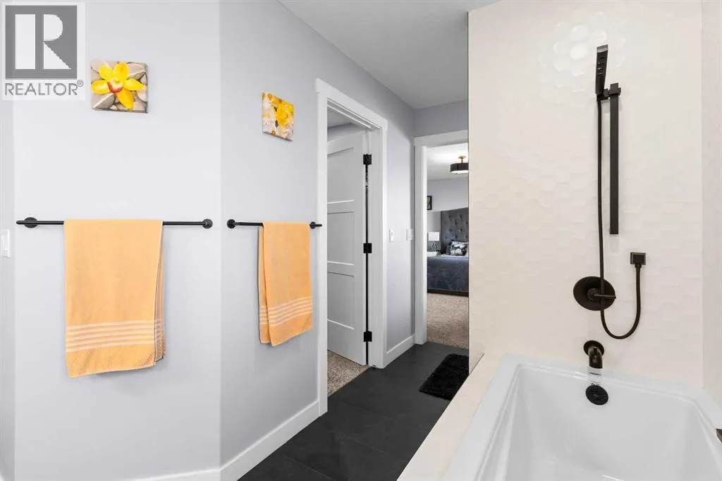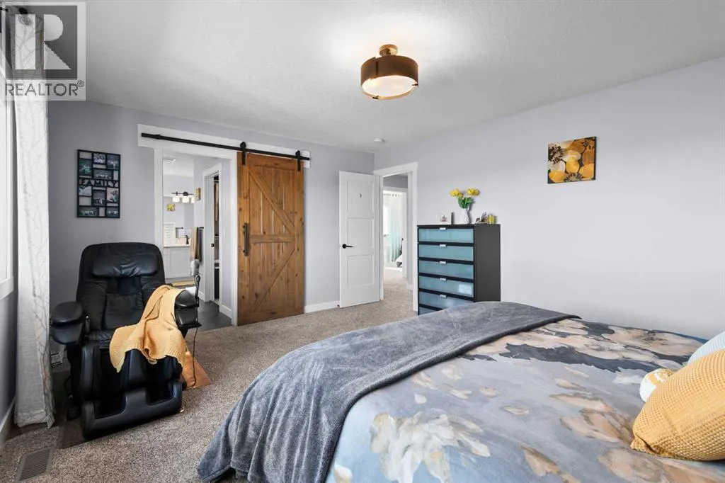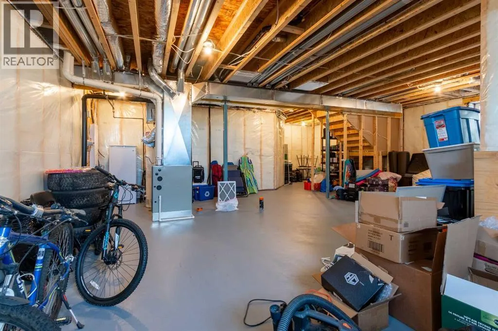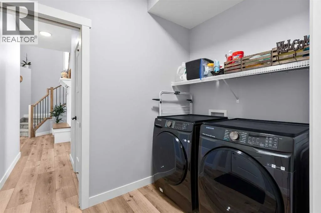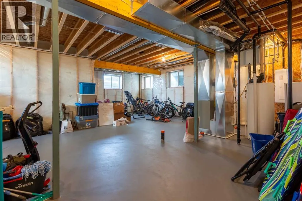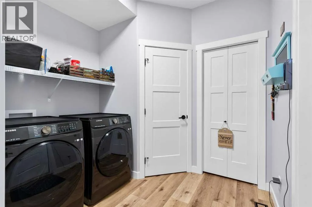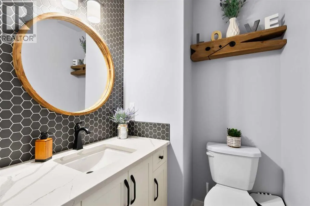 This spotless home was built by a local reputable builder (Anchored Custom Homes) and it backs the Nature Space in Carstairs. It has many added features such as extra windows, special trim, oversized island, wood shelves, 9 ft basement and much more that is evident when you walk through. The front entry is spacious with its full height ceiling. Go next Into the great room which has vaulted ceilings and vinyl plank flooring. The generous sized living room has a gas fireplace with windows on each side and a brick feature wall. The bright white kitchen has a large island with quartz counters and lots of counter space and cabinets. The microwave is tucked under the counter and the pantry is a walk thru one with wood shelves. The dining room is large enough for a big table and has a big window which faces the back yard and the view of the park/nature space WITHOUT ANY NEIGHBORS BEHIND. The door from the dining area leads to the covered back deck and the partially fenced yard. There is an area with gravel that is ready for a patio level. Back inside on the main floor is the powder room with quartz counter, a laundry room and the entry to the garage. The 23x24 ft garage is insulated, drywalled and painted and has an infrared heater. It easily fits 2 vehicles. Upstairs you will find a large primary bedroom with ensuite which has double vanities and a separate shower as well as soaker tub. The walk in closet is large. There are 2 more bedrooms on this level with nice windows and great closets. The main bathroom is large. The basement is ready for your development ideas with large windows and 9 ft ceilings. There is an alley on the west side of the house which makes RV parking easy. Make an appointment today to see this special home. You will not be disappointed. (id:27476)
