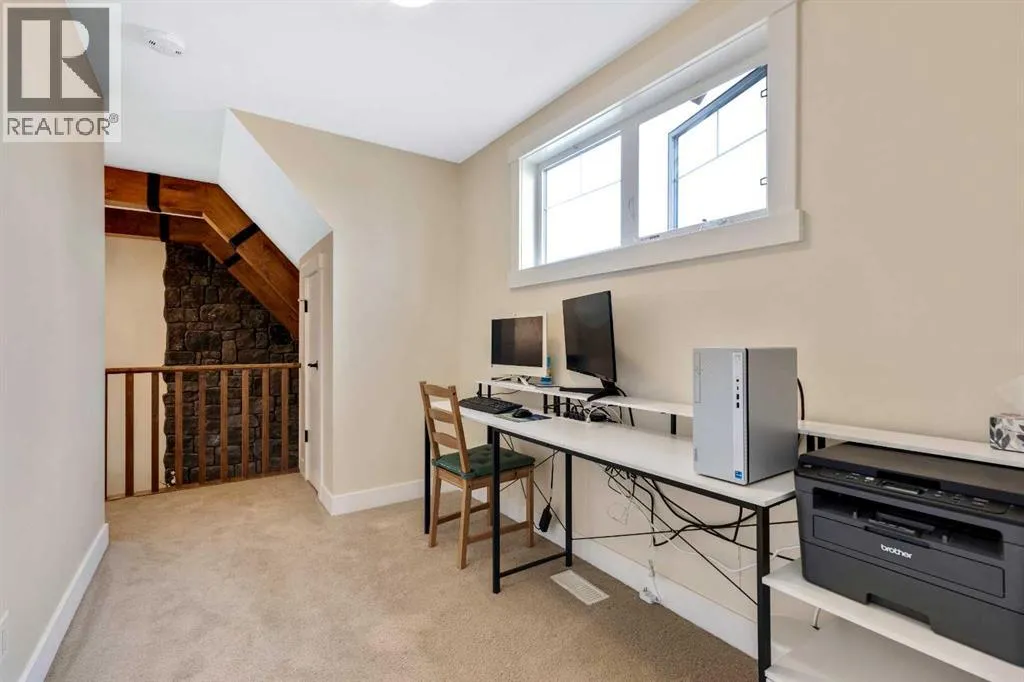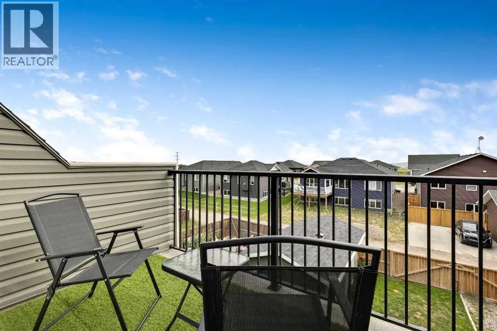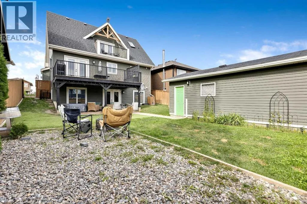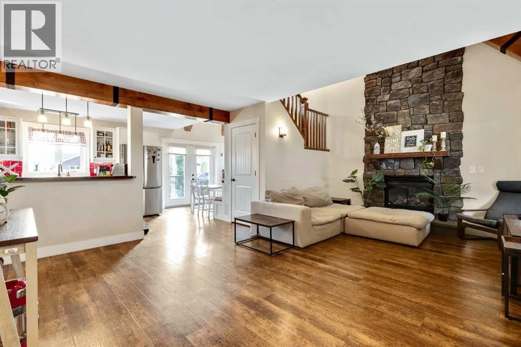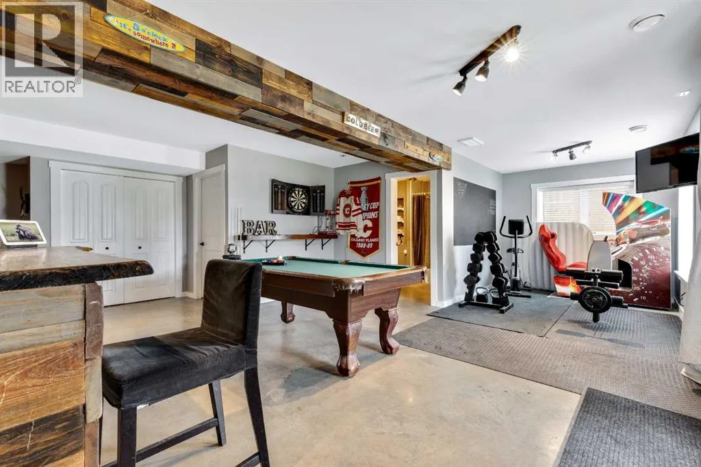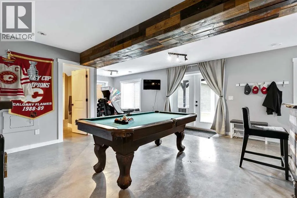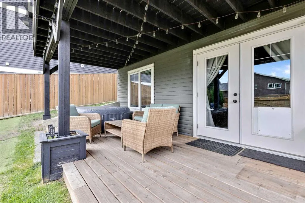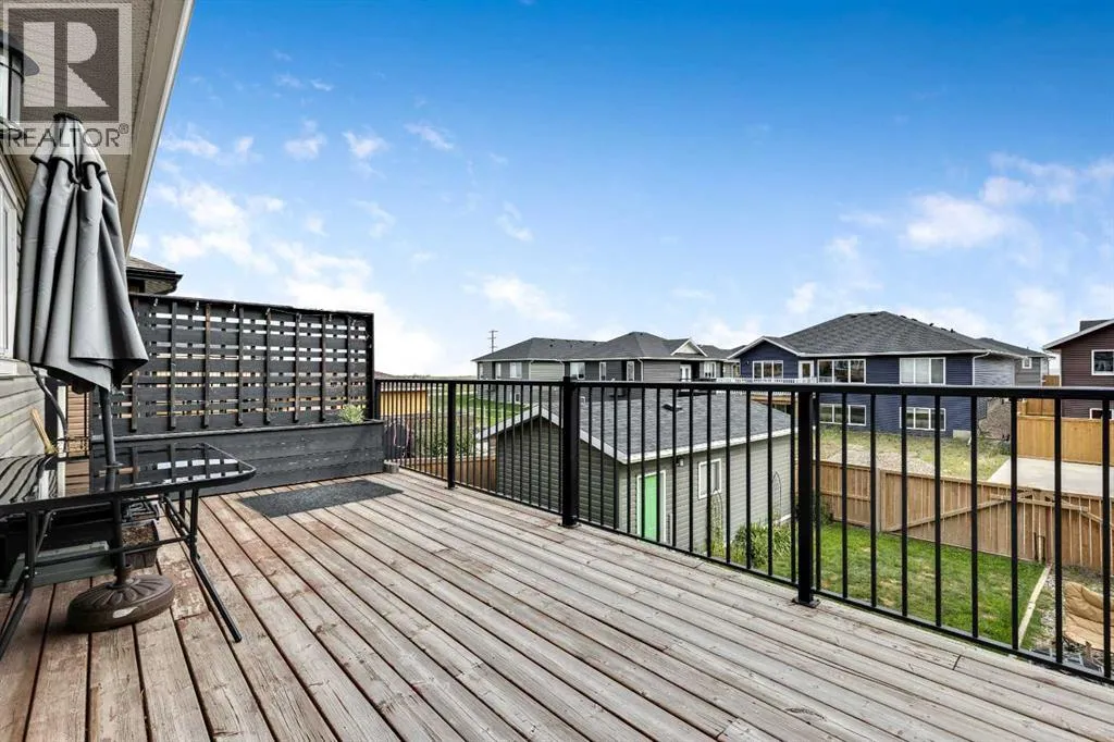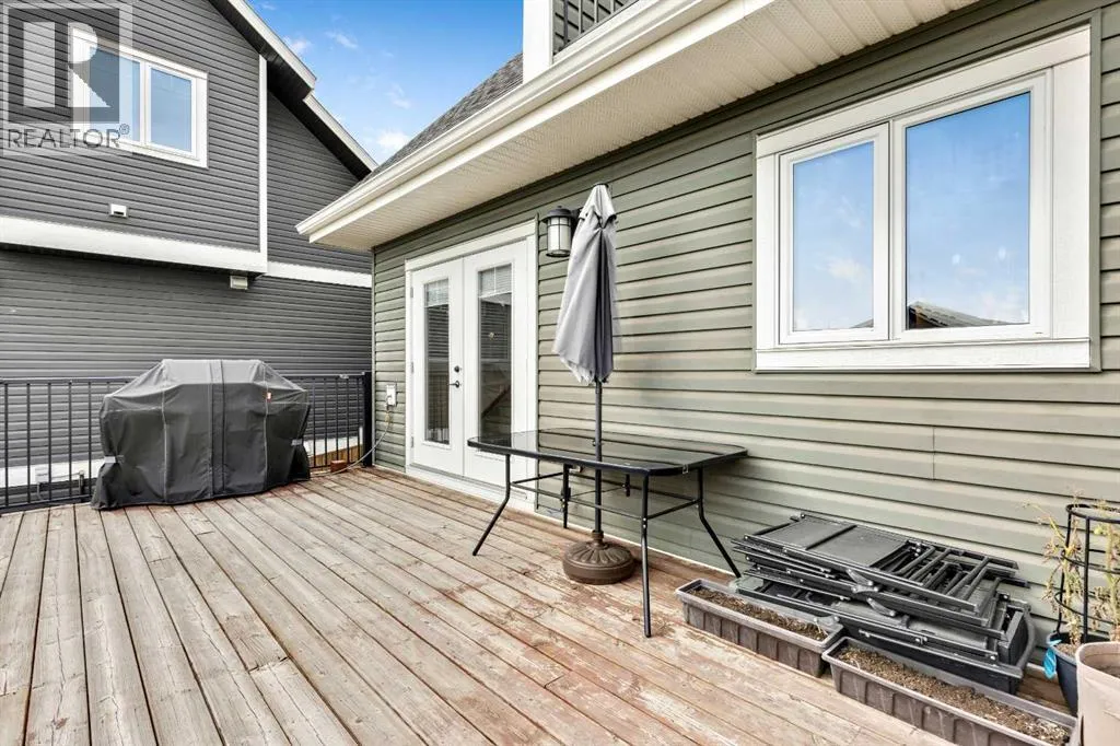 Houlden Place is an attractive cul-de-sac of individually designed, executive-style homesâand number thirteen proudly stands out. With its traditional architectural charm, this residence offers exceptional curb appeal and a warm, welcoming presence.Step inside to an impressive open-plan layout, where a vaulted, beamed ceiling, a striking accent staircase, and a soaring stone chimney stack set the tone for the home's unique character. The kitchen and dining area blend English country charm with a bold, modern twistâhighlighted by vibrant red accents, a voluminous Belfast sink, ample counter space, and a gas stove that any serious cook will appreciate.From the dining room, double doors lead to a raised deck that showcases breathtaking prairie and mountain viewsâideal for entertaining or quiet mornings with coffee.The main floor also features a spacious second bedroom, a stylish three-piece bathroom, and a generous laundry with sink and storage room.Upstairs, the private primary suite offers a peaceful retreat with garden views and access to a walk-out balconyâonce again capturing those stunning long-range mountain vistas. The four-piece ensuite flows into a flexible dressing room or optional additional bedroom, which then connects to a loft-style flex space, currently set up as a home office.The fully finished walkout basement is warmed by in-floor heating and includes a gym area, bar, recreation zone, cozy lounge/movie space, and a modern three-piece bathroom. Large double doors open to a covered patio and the beautifully landscaped, fenced backyardâcomplete with a gated trailer access.Additional features include the following: High-efficiency furnace and water tank, Central air conditioning, Humidification and energy recovery ventilation systems for year-round comfort, Oversized single garage with workshop spaceThis homeâs thoughtful design, unique features, and unbeatable views set it apart from the rest. Itâs truly a must-see! (id:27476)