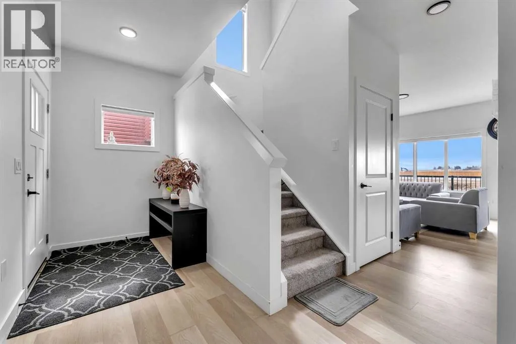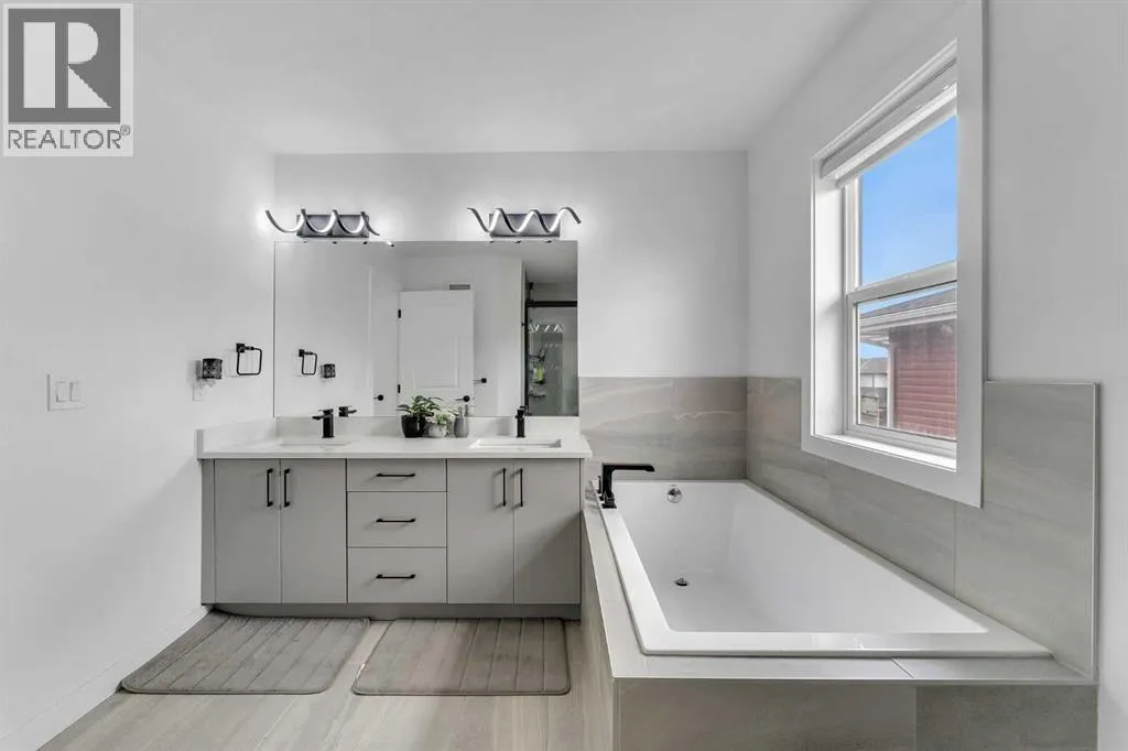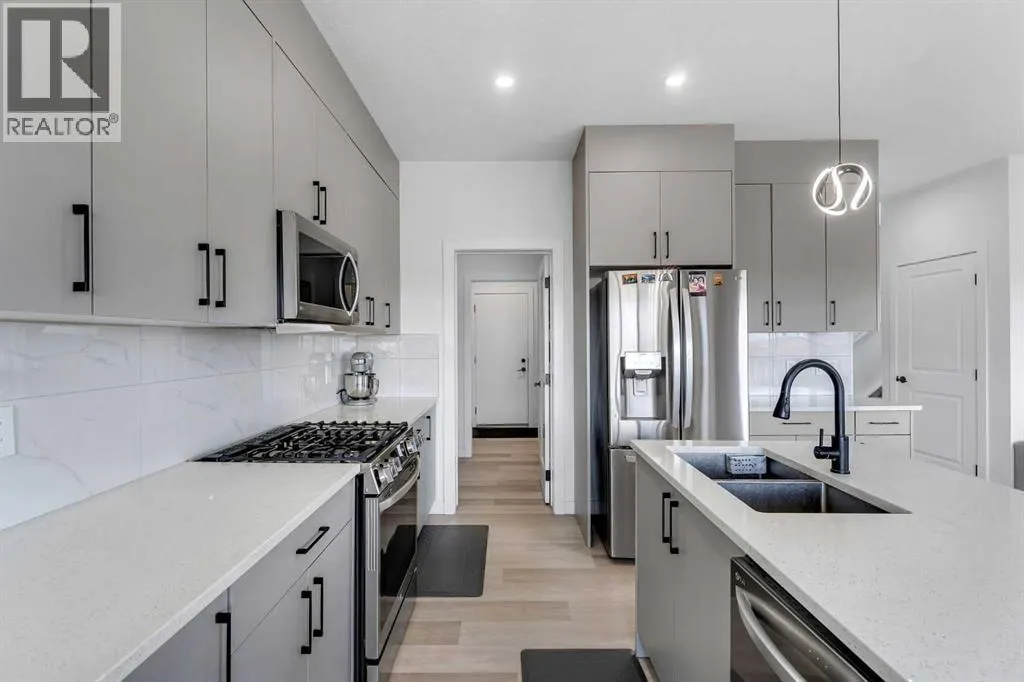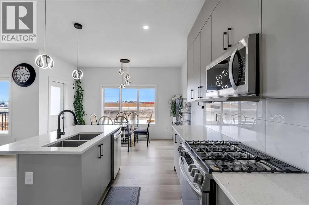 Welcome to this stunning home in the highly sought-after Waterford community of Chestermere!This beautifully designed property offers the perfect blend of elegance and functionality, complete with a double attached front garage and a spacious lot.Step inside to discover a bright, open-concept layout featuring 9-foot ceilings and a versatile main floor denâideal for a home office or study space. The chef-inspired kitchen is a true highlight, boasting quartz countertops, premium cabinetry, a sleek backsplash, and a full stainless steel appliance package.A separate side entrance to the basement provides excellent future development potential.Upstairs, enjoy a cozy bonus room perfect for relaxing or entertaining, along with three generously sized bedrooms. The luxurious primary suite features a stylish double-sink ensuite. For added convenience, the upper-floor laundry room makes daily chores a breeze.Located just steps from shopping centres and the picturesque Chestermere Lake, this home offers the ideal setting for family living.Donât miss outâbook your showing today! (id:27476)