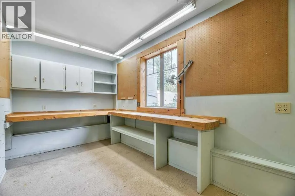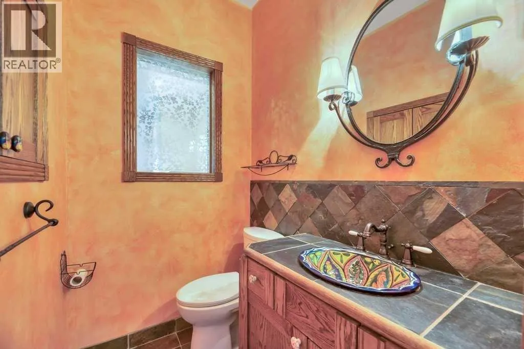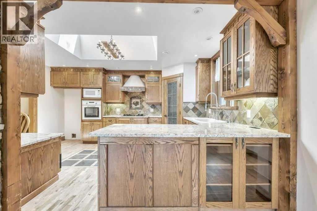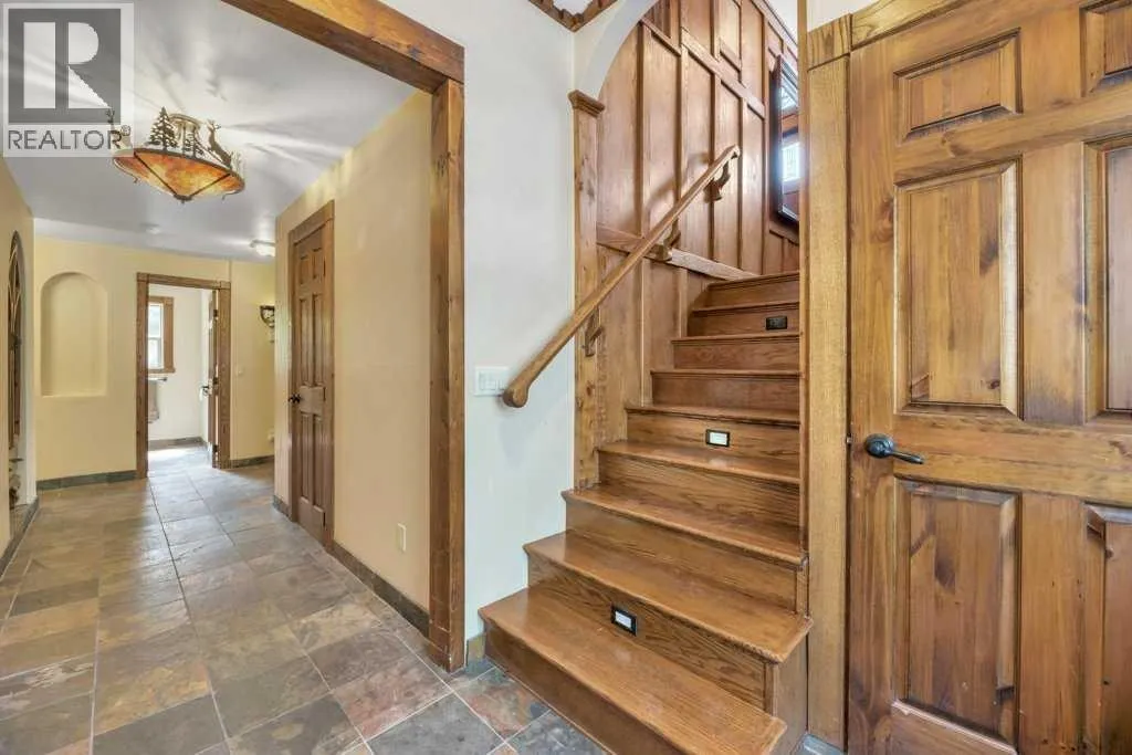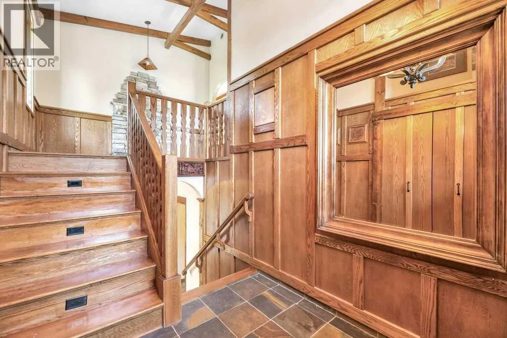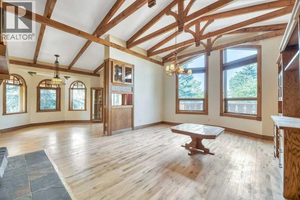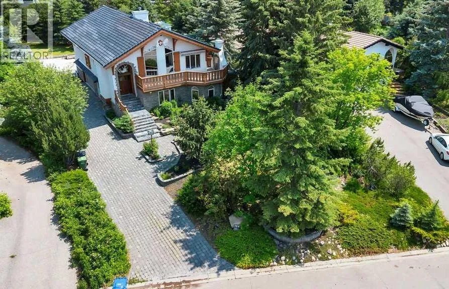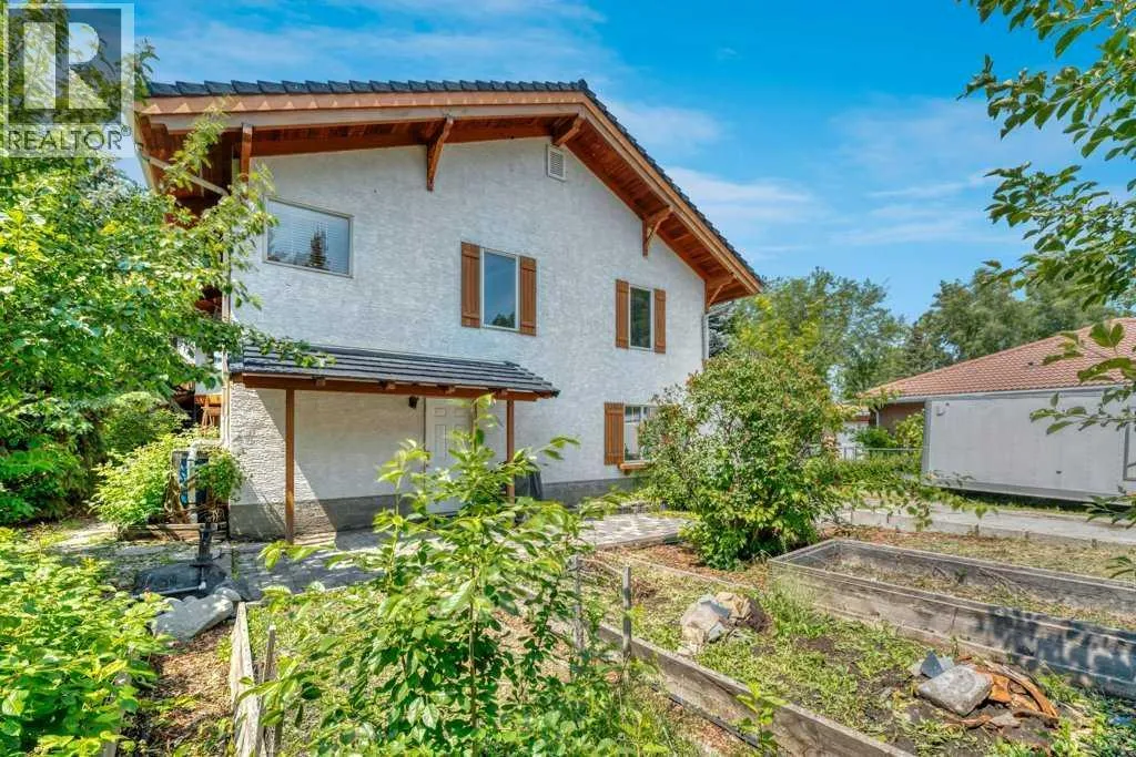 Nestled on a beautifully landscaped 1/3 acre lot adorned with mature trees, this German-inspired masterpiece offers timeless character & thoughtful design at every turn. Across the street from the lake, this one-of-a-kind home boasts stunning curb appeal with lush garden areas, complemented by abundant off-street parking & an additional poured parking pad with roughed-in in-floor heating â ready for a future garage. Inside, you're greeted by intricate custom woodwork, hand-carved detailing, slate flooring, cozy in-floor heating throughout both levels of the home & a custom front-entry fountain. The roof features tiles with a remarkable 50-year lifespan, ensuring peace of mind for years to come.As you ascend to the main level, be captivated by soaring vaulted ceilings with exposed wood beams, stained-glass accents & expansive west-facing windows that fill the space with natural light. The open-concept living & dining area centers around a charming wood-burning fireplace & beautifully crafted built-in cabinetry, blending comfort with artisan craftsmanship. Just off the dining area, a bonus room awaits â ideal as a reading nook, plant retreat, or serene home office. Step out onto the large west-facing deck to enjoy the built-in pizza oven, retractable awning & even a dumbwaiter to easily transport firewood from the ground level. The entire home has ample storage â cleverly built above the closets & on the sides of fireplaces.The kitchen is a chefâs delight, with ample prep space, a gas cooktop, built-in work station and a skylight for added light. There are 2 bedrooms on the main level feature soaring custom wood ceilings, with the primary suite offering his-and-hers closets, a cozy electric fireplace, dual window seats, and a luxurious five-piece ensuite. A convenient main floor laundry room with even more storage & a workspace as well as a stylish three-piece bathroom complete the main level.Downstairs, the lower level offers incredible flexibility, including a spacious cold room, 2 separate grade-level entrances, and two more bedrooms â each with distinctive features. One bedroom includes a mini bar, another boasts a kitchenette, open beam ceilings, electric fireplace, & walk-in closet (with a window) with space for a private office. The third versatile room could easily serve as a secondary kitchen or home office, with its own entrance & sink. A 3-piece bathroom rounds out this impressive lower level.The oversized, heated garage (19'9" x 27'5") includes an integrated workshop & abundant storage options. With instant hot water, quality finishes throughout, & exceptional attention to detail, this home offers a rare combination of craftsmanship, functionality & warmth â a true lakeside gem unlike any other. (id:27476)