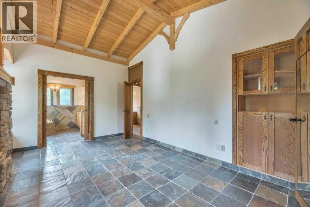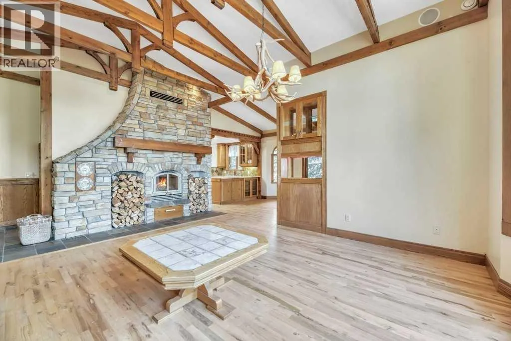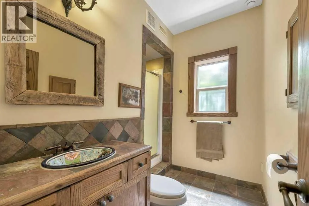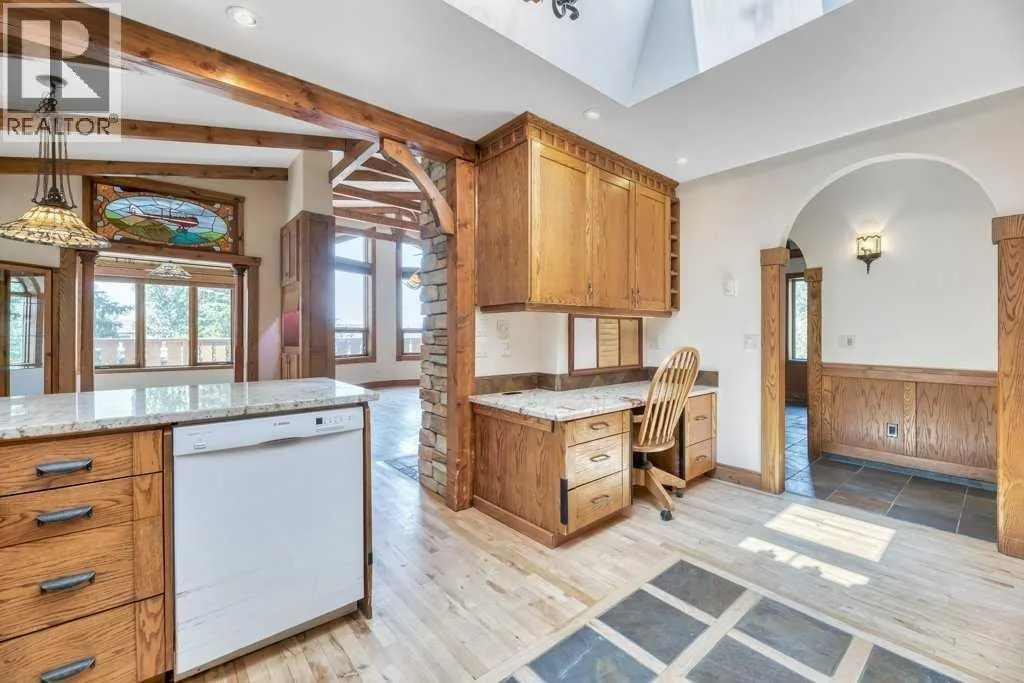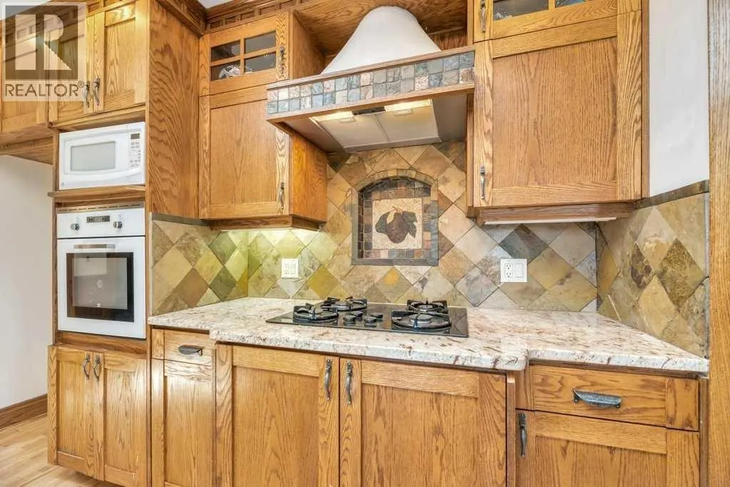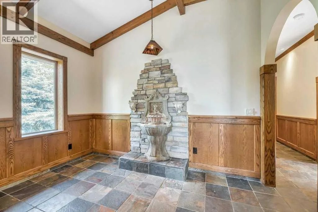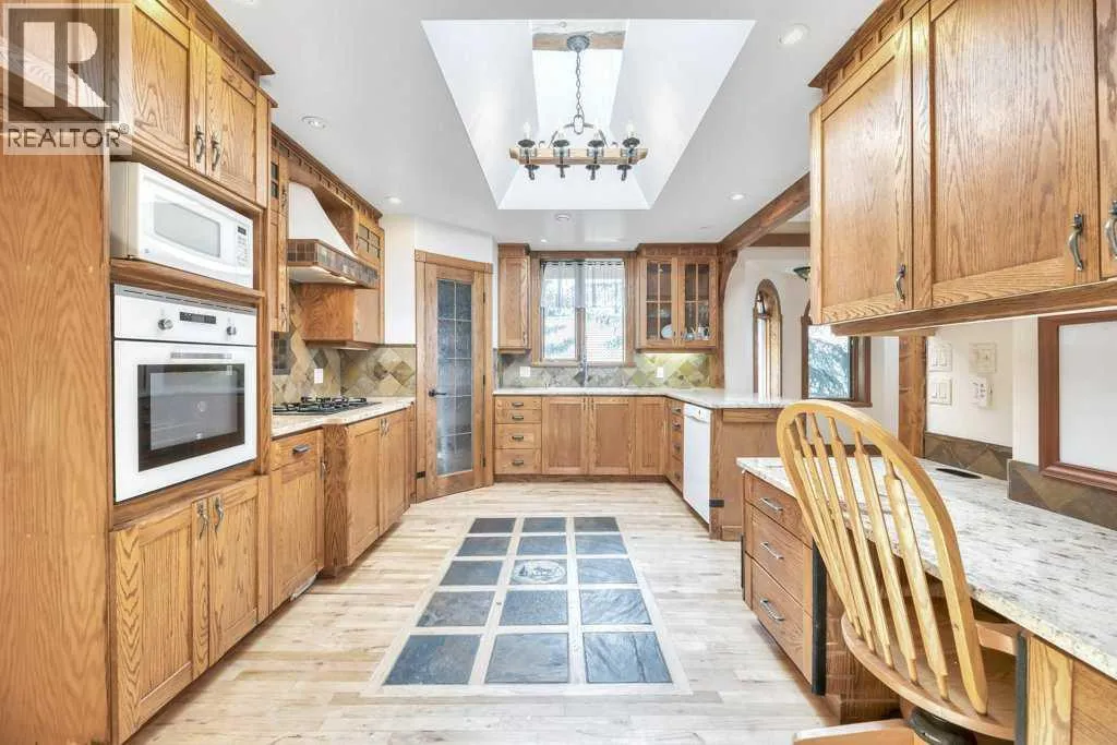 Nestled on a beautifully landscaped 1/3 acre lot adorned with mature trees, this German-inspired masterpiece offers timeless character & thoughtful design at every turn. Across the street from the lake, this one-of-a-kind home boasts stunning curb appeal with lush garden areas, complemented by abundant off-street parking & an additional poured parking pad with roughed-in in-floor heating â ready for a future garage. Inside, you're greeted by intricate custom woodwork, hand-carved detailing, slate flooring, cozy in-floor heating throughout both levels of the home & a custom front-entry fountain. The roof features tiles with a remarkable 50-year lifespan, ensuring peace of mind for years to come.As you ascend to the main level, be captivated by soaring vaulted ceilings with exposed wood beams, stained-glass accents & expansive west-facing windows that fill the space with natural light. The open-concept living & dining area centers around a charming wood-burning fireplace & beautifully crafted built-in cabinetry, blending comfort with artisan craftsmanship. Just off the dining area, a bonus room awaits â ideal as a reading nook, plant retreat, or serene home office. Step out onto the large west-facing deck to enjoy the built-in pizza oven, retractable awning & even a dumbwaiter to easily transport firewood from the ground level. The entire home has ample storage â cleverly built above the closets & on the sides of fireplaces.The kitchen is a chefâs delight, with ample prep space, a gas cooktop, built-in work station and a skylight for added light. There are 2 bedrooms on the main level feature soaring custom wood ceilings, with the primary suite offering his-and-hers closets, a cozy electric fireplace, dual window seats, and a luxurious five-piece ensuite. A convenient main floor laundry room with even more storage & a workspace as well as a stylish three-piece bathroom complete the main level.Downstairs, the lower level offers incredible flexibility, including a spacious cold room, 2 separate grade-level entrances, and two more bedrooms â each with distinctive features. One bedroom includes a mini bar, another boasts a kitchenette, open beam ceilings, electric fireplace, & walk-in closet (with a window) with space for a private office. The third versatile room could easily serve as a secondary kitchen or home office, with its own entrance & sink. A 3-piece bathroom rounds out this impressive lower level.The oversized, heated garage (19'9" x 27'5") includes an integrated workshop & abundant storage options. With instant hot water, quality finishes throughout, & exceptional attention to detail, this home offers a rare combination of craftsmanship, functionality & warmth â a true lakeside gem unlike any other. (id:27476)