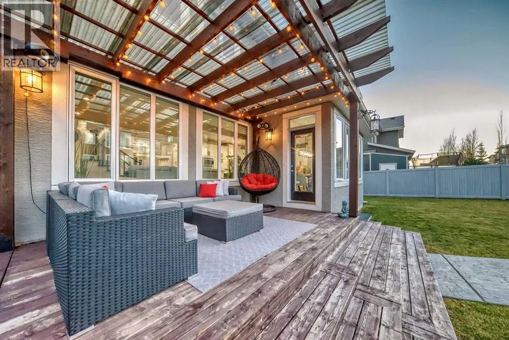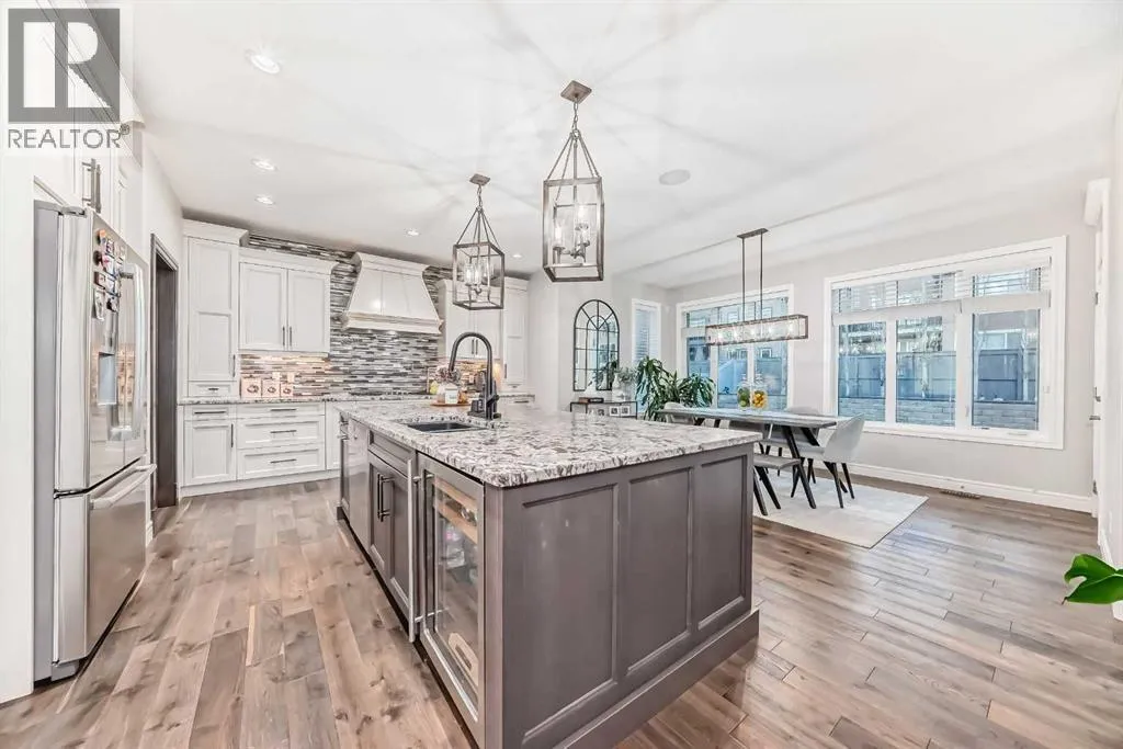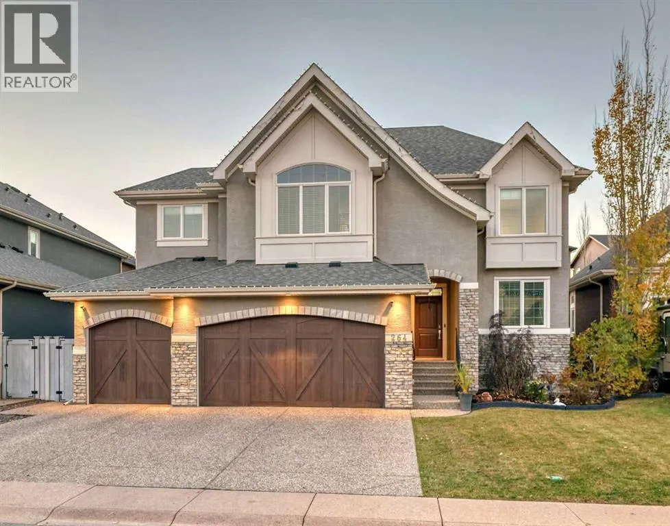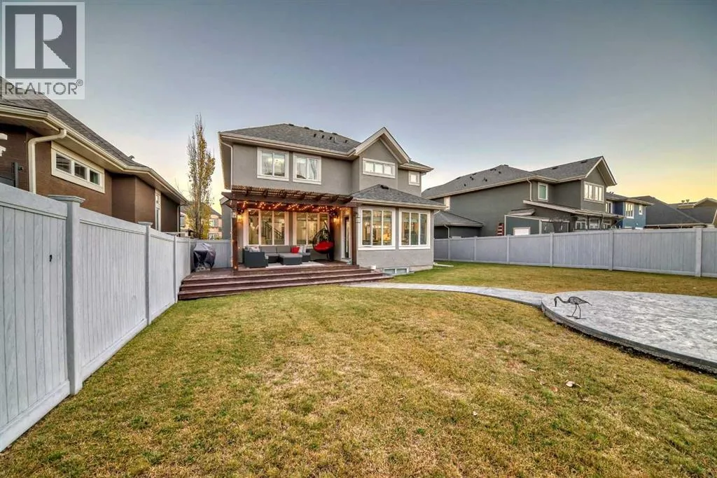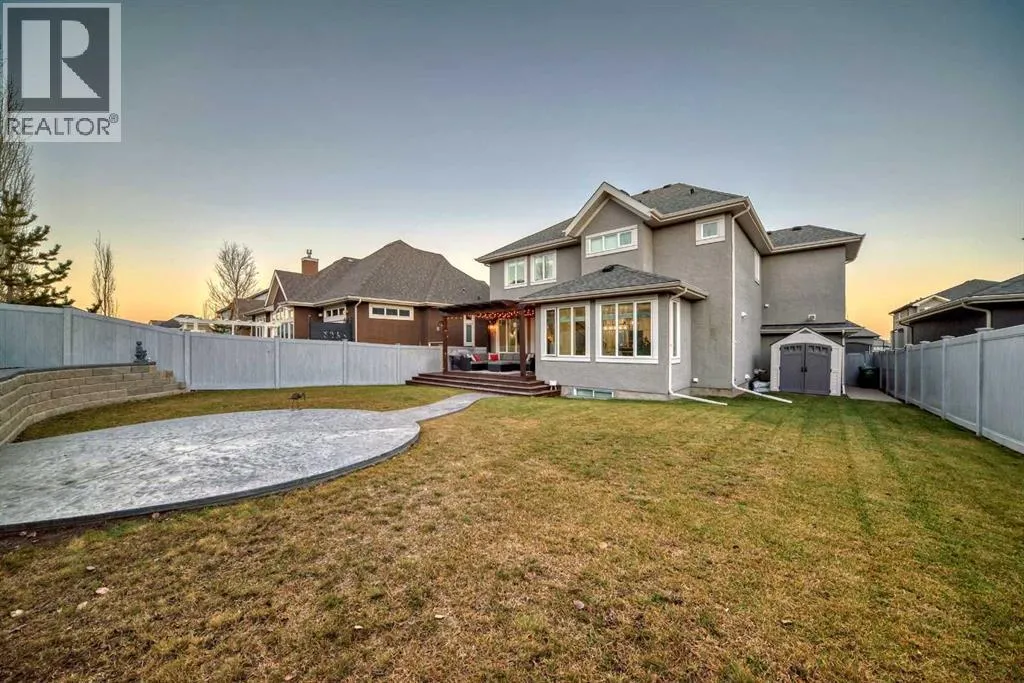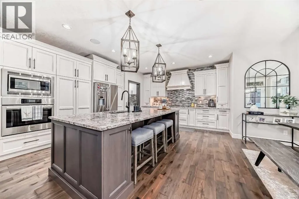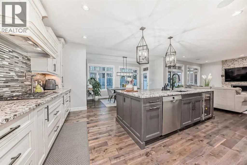 Welcome to this stunning executive home featuring a triple car garage and over 4,098 sq. ft. of beautifully designed living space. With 5 bedrooms, 4 bathrooms, and a main floor office, this residence is nestled on one of Chestermereâs most tranquil and sought-after streets. This home is loaded with high-end finishes and thoughtful upgrades, including new carpet, rich hardwood floors, granite countertops, upgraded and recessed lighting, and a chefâs kitchen outfitted with premium built-in Bosch stainless steel appliances. Additional features include two air conditioning units, central vacuum, built-in speakers, CCTV security cameras, a heated garage, and an exposed aggregate concrete driveway. As you step through the front door, youâre welcomed by a spacious foyer featuring a built-in bench and coat hooks. Just off the entry is a beautifully designed home office, perfectly placed for privacy and productivity. The main floor boasts an open-concept layout ideal for entertaining. The family room offers plenty of seating space and a cozy gas fireplace with a floor-to-ceiling stone surround. The chefâs kitchen is a dream, featuring Bosch built-in stainless-steel appliances, a gas cooktop with a custom hood fan canopy, granite counters, and a kitchen island with a built-in bar fridge for extra beverage storage. A walk-through butlerâs pantry with a prep sink provides additional storage and connects seamlessly to the mudroom, which includes built-in cabinetry, a bench, and coat hooks. The dining area is located at the back of the home, filled with natural light from large windows and providing easy access to the backyard. A conveniently located 2-piece bathroom completes the main level. The backyard is a true outdoor retreat with a covered deck, a generous grassy area with mature trees, and a stamped concrete pathway leading to a separate patio with seating around a cozy fire pit â ideal for relaxing or entertaining guests. Upstairs, you'll find four generously sized bed rooms, each featuring custom-built walk-in closets. A bright and spacious bonus room with vaulted ceilings offers additional space for relaxation or play. The luxurious primary suite is the ultimate retreat with tray ceilings, a spa-inspired 5-piece ensuite that includes dual vanities, a freestanding soaker tub, a custom tile shower with bench, and a massive walk-in closet with custom built-ins. A full 4-piece bathroom and a well-placed laundry room complete the upper level. The fully finished basement is designed for entertaining, with 9-foot ceilings and a large open family and recreation area. A stylish wet bar includes an island with a fridge, stove, and dishwasher â perfect for hosting. The lower level also features a fifth bedroom and a modern 3-piece bathroom with a custom walk-in shower. (id:27476)