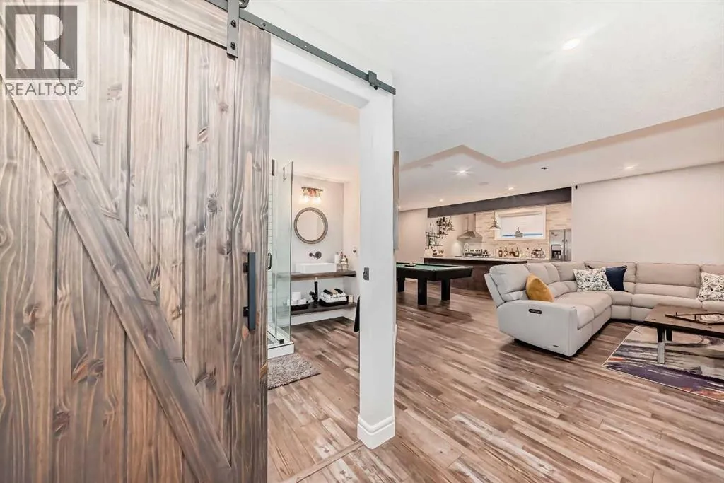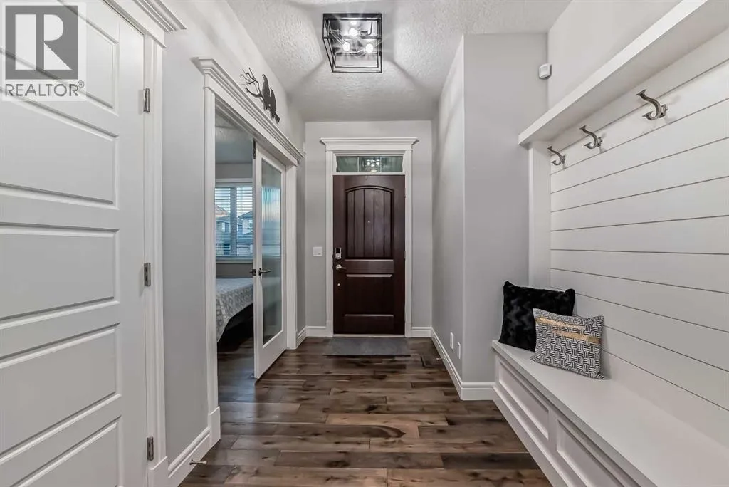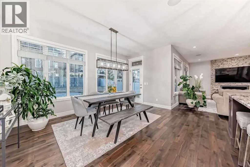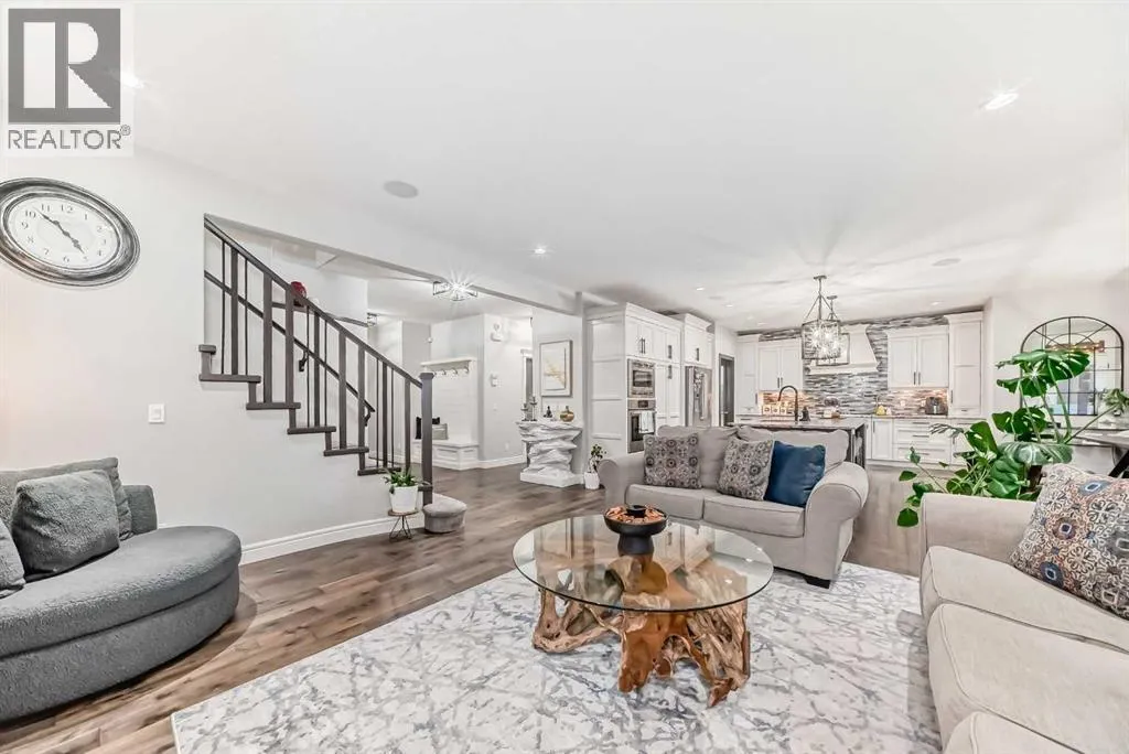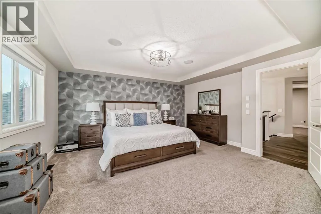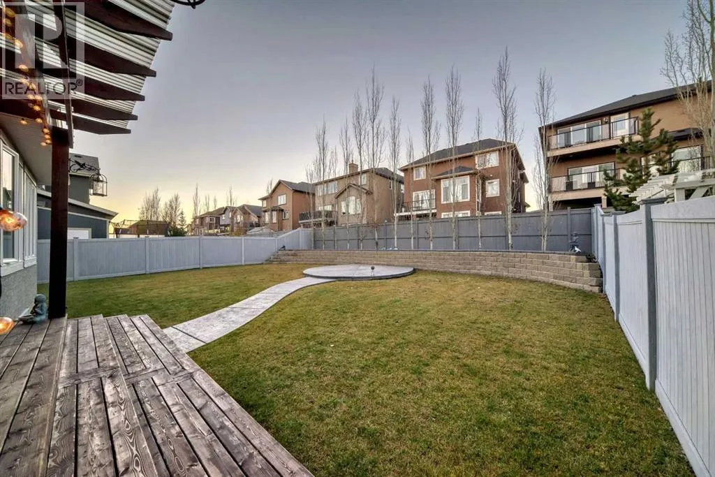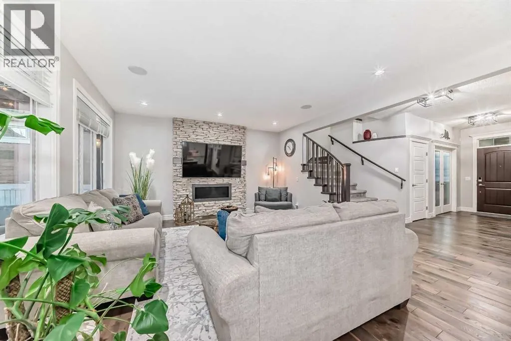 Welcome to this stunning executive home featuring a triple car garage and over 4,098 sq. ft. of beautifully designed living space. With 5 bedrooms, 4 bathrooms, and a main floor office, this residence is nestled on one of Chestermereâs most tranquil and sought-after streets. This home is loaded with high-end finishes and thoughtful upgrades, including new carpet, rich hardwood floors, granite countertops, upgraded and recessed lighting, and a chefâs kitchen outfitted with premium built-in Bosch stainless steel appliances. Additional features include two air conditioning units, central vacuum, built-in speakers, CCTV security cameras, a heated garage, and an exposed aggregate concrete driveway. As you step through the front door, youâre welcomed by a spacious foyer featuring a built-in bench and coat hooks. Just off the entry is a beautifully designed home office, perfectly placed for privacy and productivity. The main floor boasts an open-concept layout ideal for entertaining. The family room offers plenty of seating space and a cozy gas fireplace with a floor-to-ceiling stone surround. The chefâs kitchen is a dream, featuring Bosch built-in stainless-steel appliances, a gas cooktop with a custom hood fan canopy, granite counters, and a kitchen island with a built-in bar fridge for extra beverage storage. A walk-through butlerâs pantry with a prep sink provides additional storage and connects seamlessly to the mudroom, which includes built-in cabinetry, a bench, and coat hooks. The dining area is located at the back of the home, filled with natural light from large windows and providing easy access to the backyard. A conveniently located 2-piece bathroom completes the main level. The backyard is a true outdoor retreat with a covered deck, a generous grassy area with mature trees, and a stamped concrete pathway leading to a separate patio with seating around a cozy fire pit â ideal for relaxing or entertaining guests. Upstairs, you'll find four generously sized bed rooms, each featuring custom-built walk-in closets. A bright and spacious bonus room with vaulted ceilings offers additional space for relaxation or play. The luxurious primary suite is the ultimate retreat with tray ceilings, a spa-inspired 5-piece ensuite that includes dual vanities, a freestanding soaker tub, a custom tile shower with bench, and a massive walk-in closet with custom built-ins. A full 4-piece bathroom and a well-placed laundry room complete the upper level. The fully finished basement is designed for entertaining, with 9-foot ceilings and a large open family and recreation area. A stylish wet bar includes an island with a fridge, stove, and dishwasher â perfect for hosting. The lower level also features a fifth bedroom and a modern 3-piece bathroom with a custom walk-in shower. (id:27476)