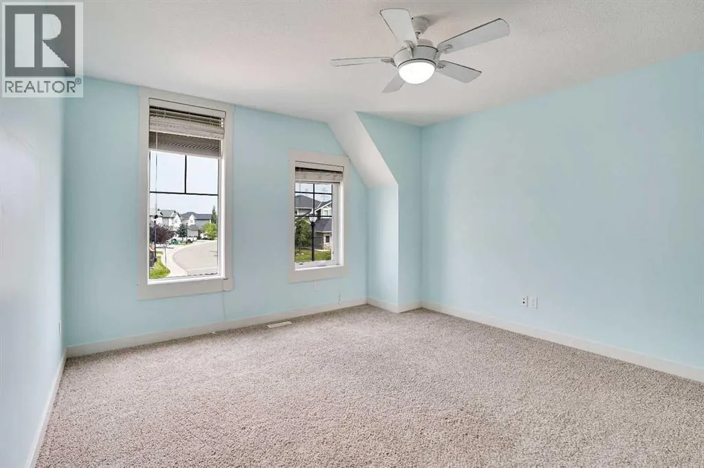 2 Primary Bedrooms | Finished Basement | Backs onto Green Space | Central Air. Welcome to this gorgeous front-drive semi-detached home in the highly desirable community of Rainbow Falls, Chestermere. Combining timeless design with modern upgrades, this property offers an exceptional layout and unbeatable locationâperfect for families, professionals, or anyone looking to enjoy a vibrant community with city convenience.The main floor impresses with soaring ceilings and an open-concept design that creates a bright, airy atmosphere. A spacious living room with a cozy fireplace sets the stage for relaxation, while the dining area easily accommodates family meals and gatherings. The upgraded kitchen features stainless steel appliances, sleek cabinetry, and plenty of counter space, making it a chefâs delight. A convenient 2-piece bathroom completes the main level.Upstairs, youâll find two generously sized primary suites, each with its own 4pc private ensuiteâideal for multi-generational living, guests, or roommates. A large bonus area adds flexibility, whether you need a family room, home office, or entertainment space.The fully finished basement extends your living space with a versatile den, additional bedroom, recreation room, 3pc bathroom, and storage. Itâs a perfect retreat for teens, guests, or hobby enthusiasts.Step outside to enjoy the private, fully fenced backyard featuring a spacious deck thatâs perfect for summer barbecues and outdoor relaxation. Backing directly onto green space, this home offers both privacy and a peaceful natural viewâan ideal setting for everyday living.With fantastic curb appeal, central air conditioning, an attached front-drive garage, and proximity to two excellent schools, No Frills, parks, and Chestermere Lake, this property delivers the lifestyle youâve been searching for.Donât miss your chance to call this Rainbow Falls beauty your next home. Book your private showing today! (id:27476)