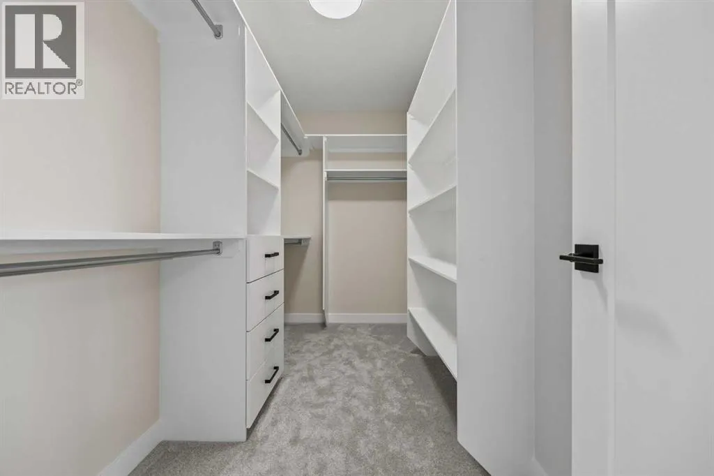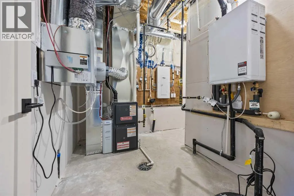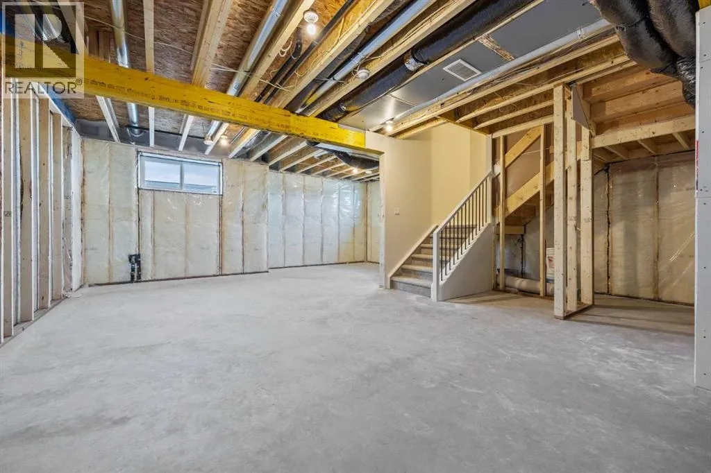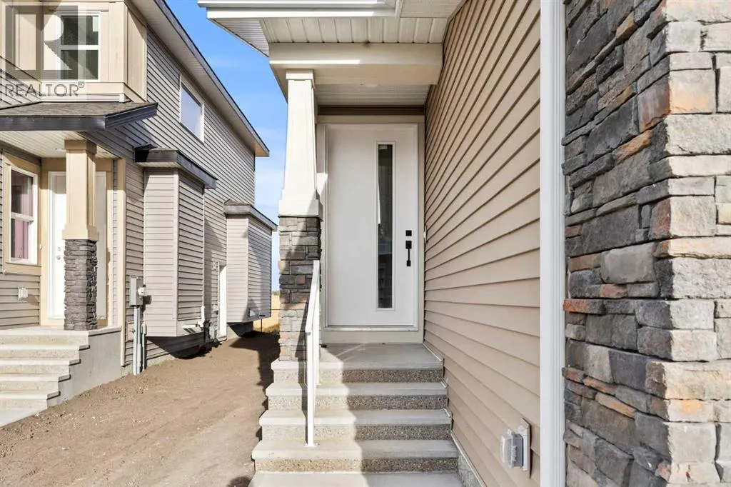 Welcome to 482 Kinniburgh Loopâan elegantly designed 1,840 sq. ft. duplex in the highly sought-after community of Kinniburgh South, Chestermere. Built by award-winning luxury builder Golden Homes, this residence blends modern living, functionality, and timeless designâall just minutes from schools, everyday amenities, and Lake Chestermere.The main floor features an inviting open-concept layout with soaring 9â ceilings and 8â doors, creating a spacious and grand feel. As you enter, youâre welcomed by a large 8â front door with a built-in glass window, setting the tone for the luxury inside. The front of the home includes a convenient half bath, access to your basement, and beautifully finished stairs leading down to the undeveloped basement. This home also includes a side entrance for added flexibility.At the heart of the home is a chef-inspired kitchen boasting a striking two-tone cabinet design, quartz countertops, a large island with breakfast bar seating, ceiling-height painted cabinetry, and sleek stainless-steel appliances. Oversized triple-pane windows flood the living and dining areas with natural light, creating a bright, warm space thatâs perfect for entertaining, relaxing, and everyday living. The living room is completed with an electric fireplace featuring multiple color settings and heat modes, adding both style and comfort.Upstairs, the oversized grand staircase with white railings and matte black iron spindles leads you to the luxurious primary bedroom. This bedroom offers a spa-like 5-piece ensuite with a freestanding tub, fully tiled walk-in shower, dual vanities, and an enclosed toilet. The primary bedroom also includes a custom walk-in closet with built-in shelving and organizers, plus stunning sunrise views to start your mornings. Two additional spacious bedrooms and a full bathroom provide plenty of room for family, while the tiled laundry roomâcomplete with a quartz countertop for folding and storageâadds everyday convenience.Premium featur es throughout include an oversized 20âx22â garage, upgraded spindle railings, MDF shelving, matte black fixtures and hardware, high-efficiency triple-pane windows for energy savings, and an enhanced party wall for superior soundproofing. Golden Homesâ signature quality and craftsmanship are evident in every detail.The exterior will be fully landscaped, including grading, loam, sod to the side entrance, and a front yard treeâoffering instant curb appeal and outdoor enjoyment. With its west-facing orientation, youâll enjoy beautiful sunrises to begin the day and softer evening light to wind down. (id:27476)