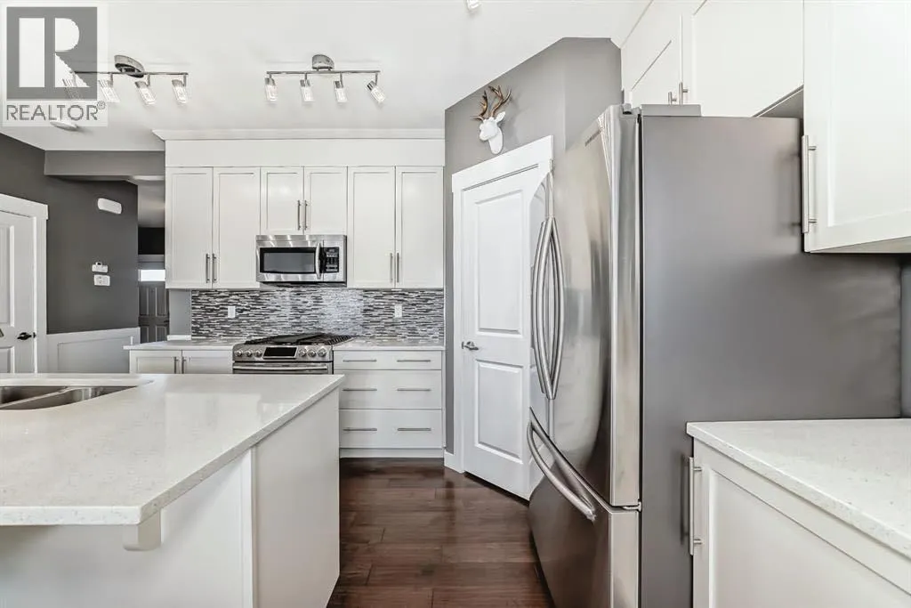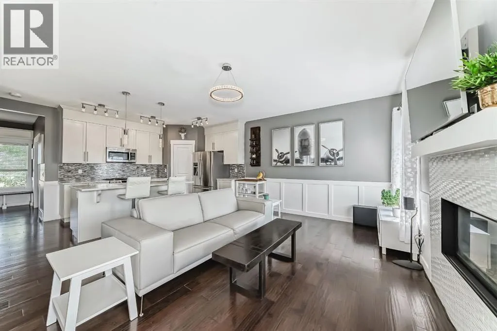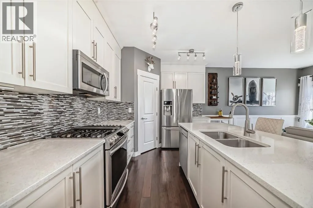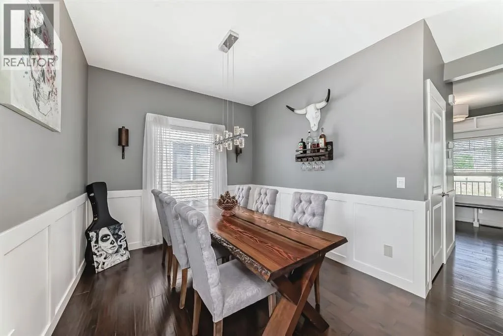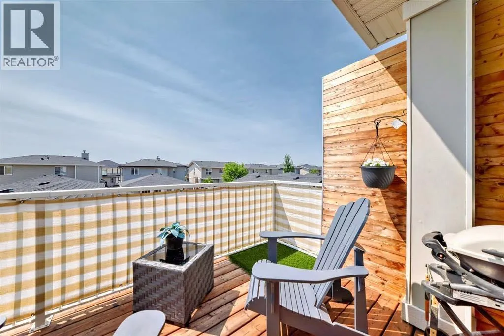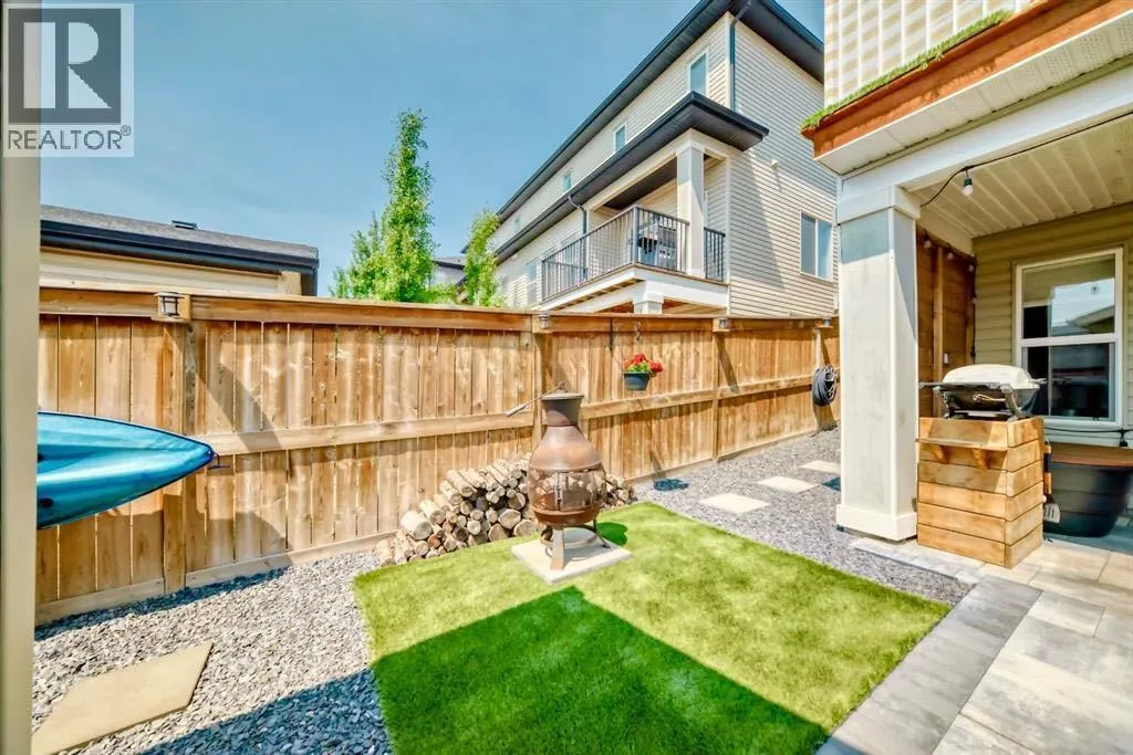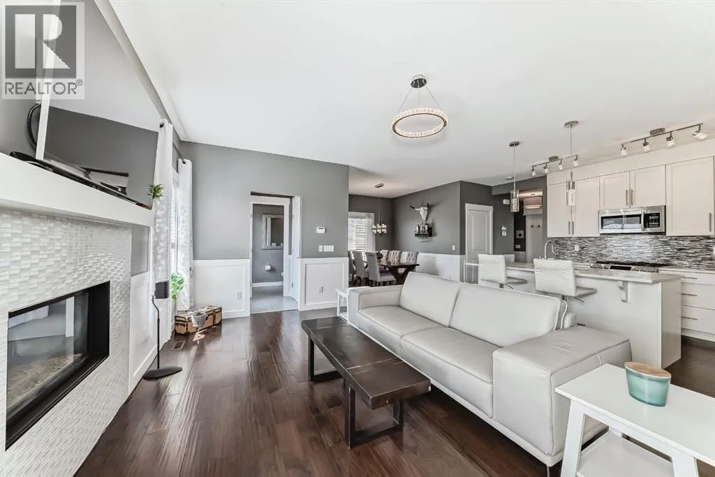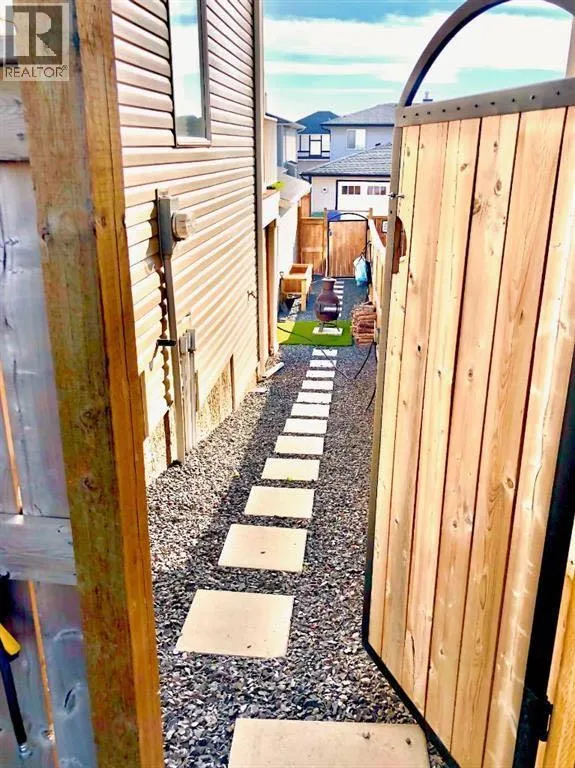 Stunning Duplex in Chestermereâs Rainbow Falls Welcome to a world of elegance and modern luxury in this breathtaking duplex, nestled in the heart of Chestermereâs coveted Rainbow Falls within the vibrant Lake Community. Meticulously crafted, this showhome-worthy residence dazzles with thoughtful upgrades and a fresh, inviting aesthetic. Exterior & Curb Appeal Charming Front Patio: Full-length patio overlooks a lush green belt, offering a warm welcome. Landscaped Backyard: Low-maintenance design with ample lounging areas for relaxation. Extended Back Deck: Complete with privacy fencing, perfect for outdoor entertaining. Oversized Double Garage: Insulated with extra-high doors, ideal for larger vehicles like trucks. Main Level Inviting Foyer: Features custom-built bench seating and intricate woodworking. Gleaming Hardwood Floors: Flow throughout, leading to a versatile flex room (office, bedroom, or more). Gourmet Kitchen: Ceiling-height white cabinetry Walk-in pantry Upgraded stainless steel appliances & gas range Expansive quartz island for prep and gatherings Sunlit Living & Dining Areas: South-facing for natural light, with a sleek gas fireplace and elegant mantel. Upper Level Primary Suite: Expansive with coffered ceilings Spa-like ensuite with dual vanities Walk-in closet with locking door for valuables Additional Bedrooms: Two generously sized rooms for flexibility (id:27476)