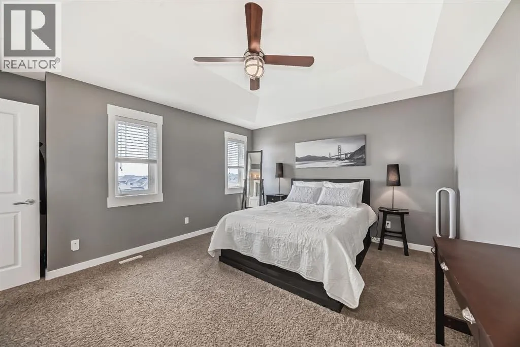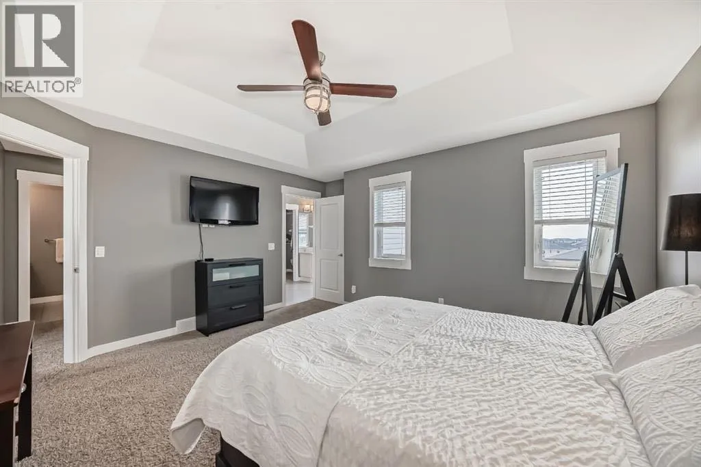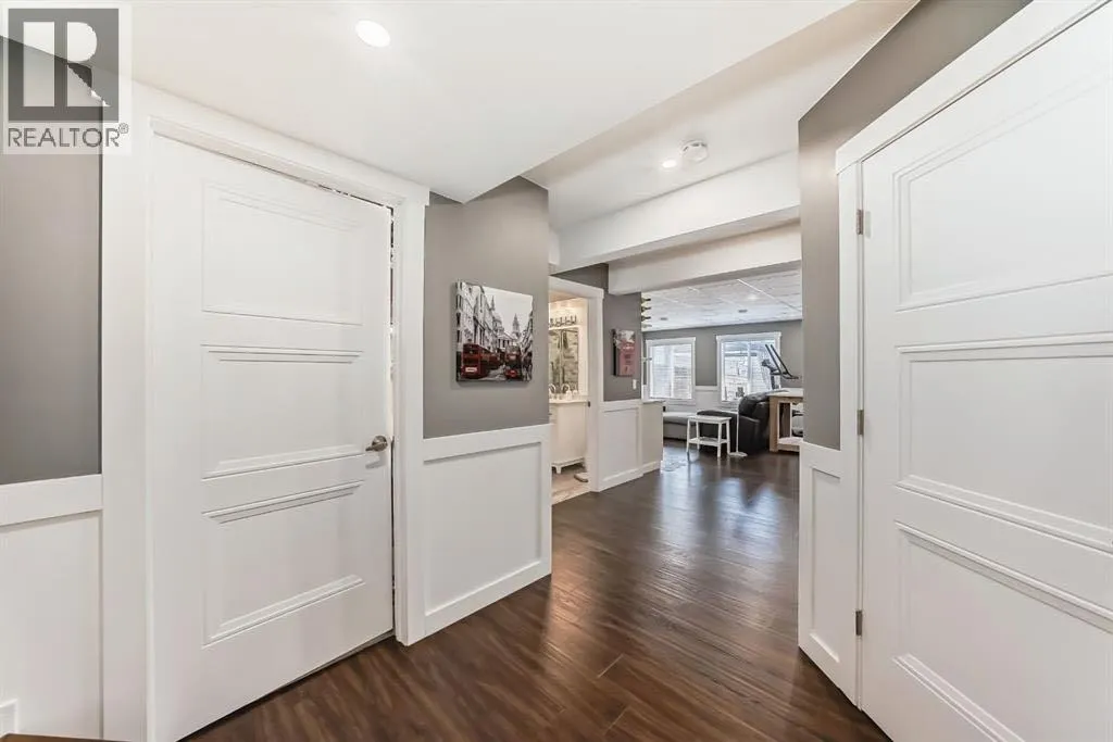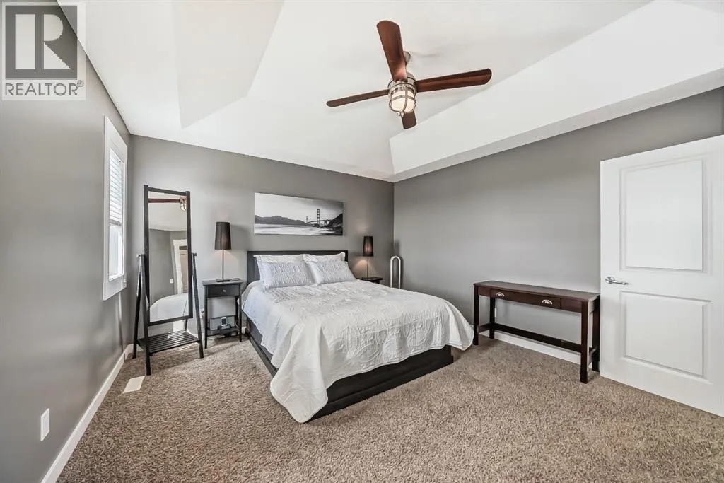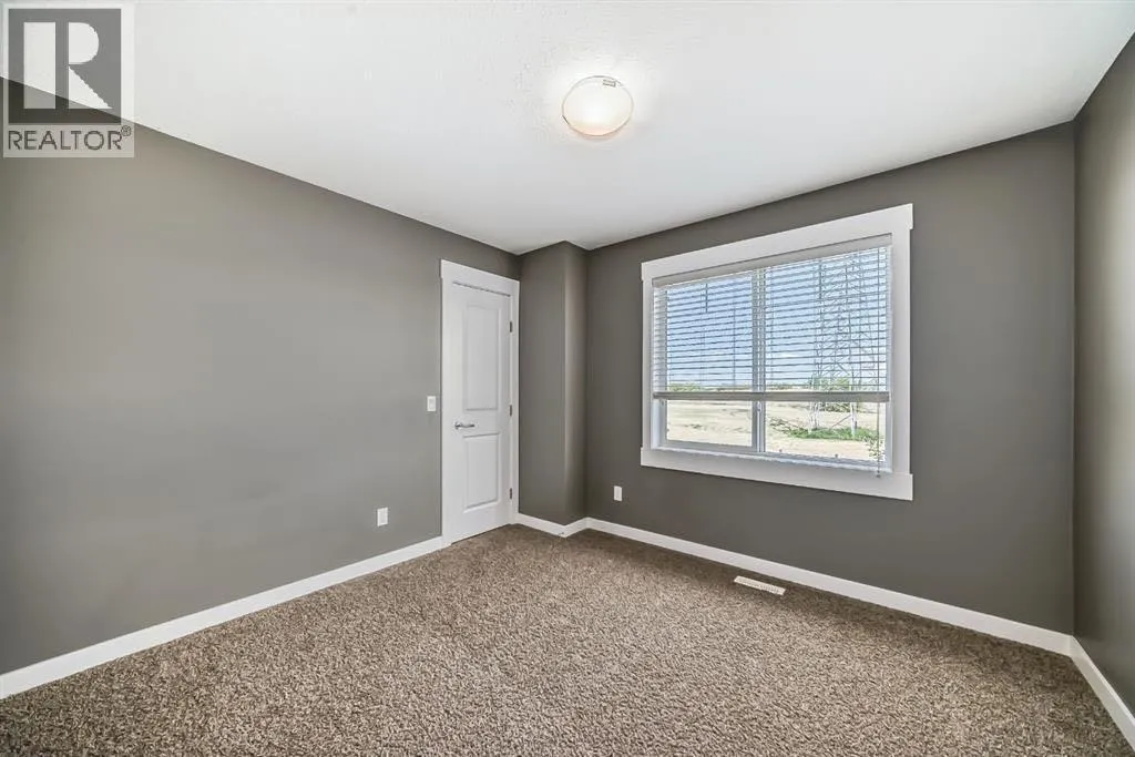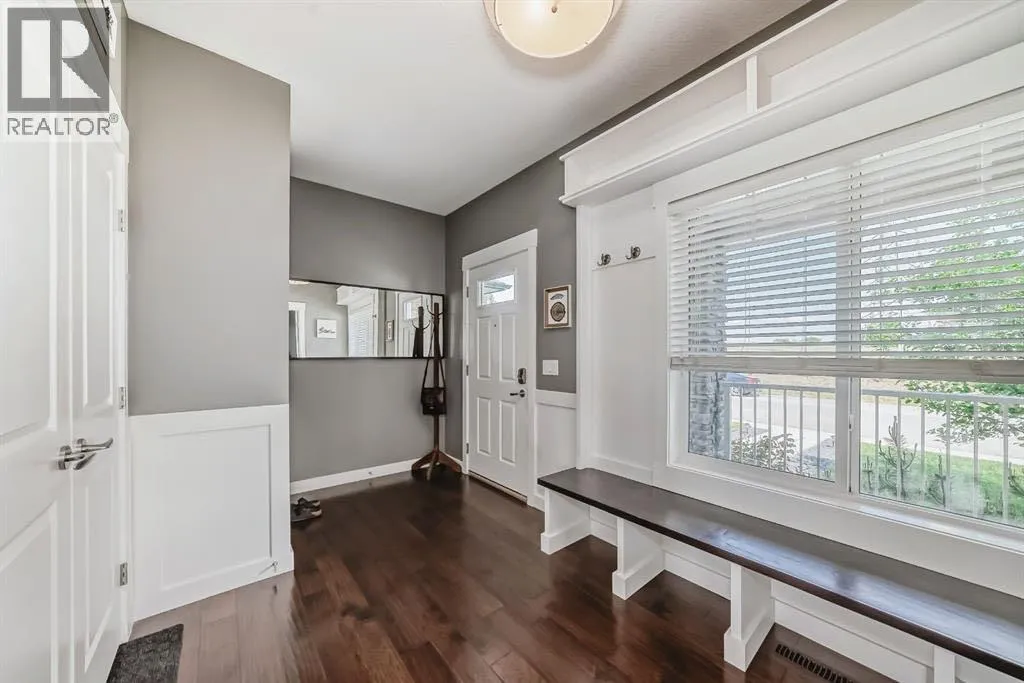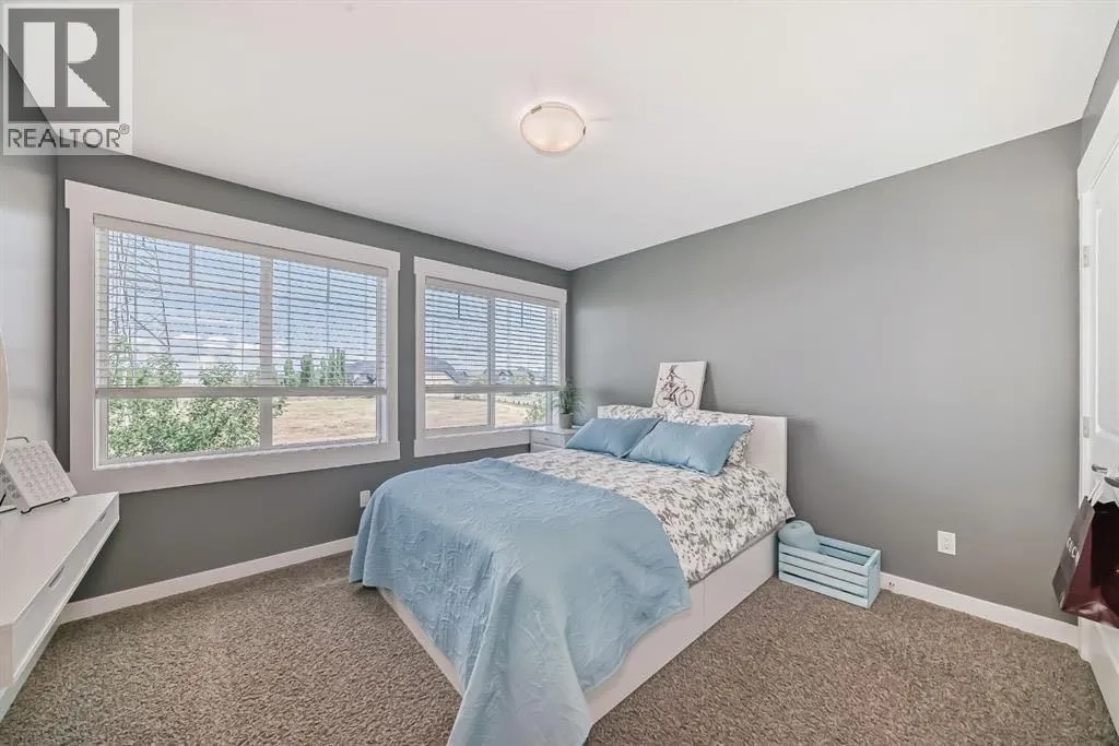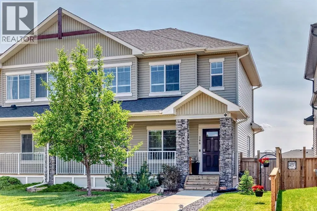 Stunning Duplex in Chestermereâs Rainbow Falls Welcome to a world of elegance and modern luxury in this breathtaking duplex, nestled in the heart of Chestermereâs coveted Rainbow Falls within the vibrant Lake Community. Meticulously crafted, this showhome-worthy residence dazzles with thoughtful upgrades and a fresh, inviting aesthetic. Exterior & Curb Appeal Charming Front Patio: Full-length patio overlooks a lush green belt, offering a warm welcome. Landscaped Backyard: Low-maintenance design with ample lounging areas for relaxation. Extended Back Deck: Complete with privacy fencing, perfect for outdoor entertaining. Oversized Double Garage: Insulated with extra-high doors, ideal for larger vehicles like trucks. Main Level Inviting Foyer: Features custom-built bench seating and intricate woodworking. Gleaming Hardwood Floors: Flow throughout, leading to a versatile flex room (office, bedroom, or more). Gourmet Kitchen: Ceiling-height white cabinetry Walk-in pantry Upgraded stainless steel appliances & gas range Expansive quartz island for prep and gatherings Sunlit Living & Dining Areas: South-facing for natural light, with a sleek gas fireplace and elegant mantel. Upper Level Primary Suite: Expansive with coffered ceilings Spa-like ensuite with dual vanities Walk-in closet with locking door for valuables Additional Bedrooms: Two generously sized rooms for flexibility (id:27476)