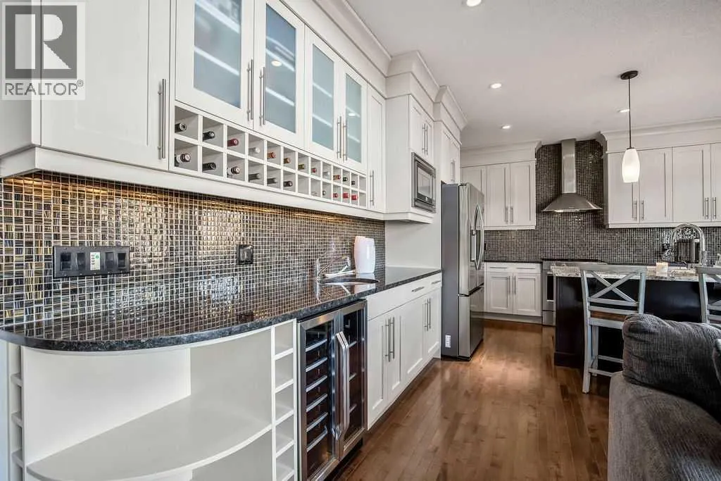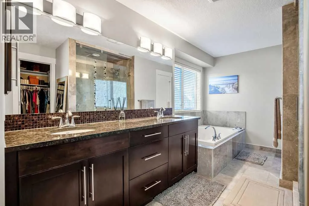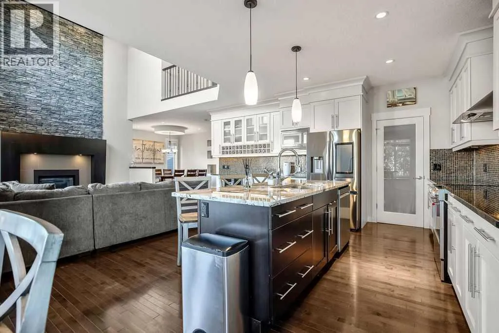 **OPEN HOUSE SATURDAY NOV 1 from 12-2PM** Tucked in one of the most sought-after locations in Chestermere, this stunning two-storey walkout backs directly onto the tranquil Rainbow Falls green space and creek-side pathway. Step outside your back gate to enjoy peaceful walks along the water, surrounded by mature trees and lush landscaping â a true outdoor retreat right at home. Inside, this fully finished residence impresses with thoughtful updates and high-end finishes throughout. The reimagined Chefâs Kitchen now features brand-new stainless steel appliances, elegant granite countertops, custom maple cabinetry with soft-close drawers and under-cabinet lighting, plus a convenient walk-through pantry connecting to the mudroom. Whether preparing an intimate meal or hosting guests, this kitchen delivers both beauty and functionality. Soaring west-facing windows flood the main floor with natural light, framing picturesque views of the creek and park beyond. The inviting great room centers around a full-height stone fireplace â perfect for cozy evenings with family or friends. Upstairs; flowing new carpet, the spacious primary suite provides a true retreat, complete with a spa-inspired 5-piece ensuite featuring heated marble floors, a jetted marble-wrapped tub, dual vanities, and his-and-hers walk-in closets. The walkout lower level is beautifully designed with versatility in mind â featuring an impressive wet bar, built-in Murphy bed, custom wine room, in-ceiling audio, and a sleek 4-piece bath with heated floors and steam shower. Ideal as a guest suite or entertainment space, itâs fully equipped with separate laundry and security systems. Outdoors, the private fenced yard offers multiple gathering spaces â a large deck for summer dining, a cozy fire pit area, and a concrete patio overlooking the natural green space and gently flowing creek. This home truly combines luxury living with the serenity of nature â an exceptional balance of indoor comfort and outdoor beauty. (id:27476)