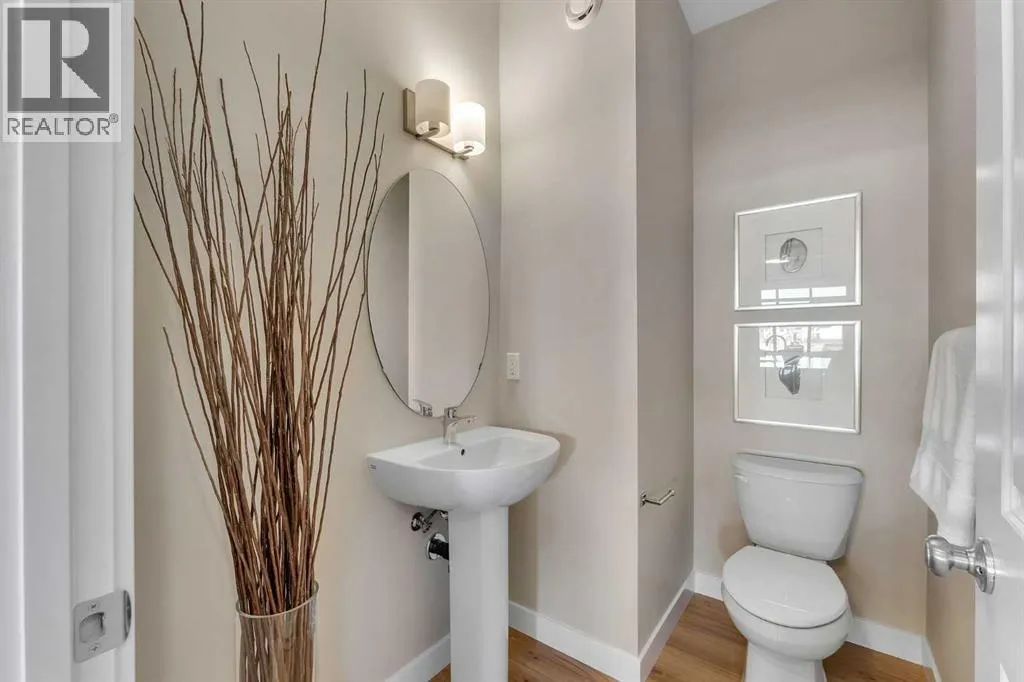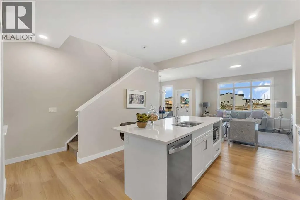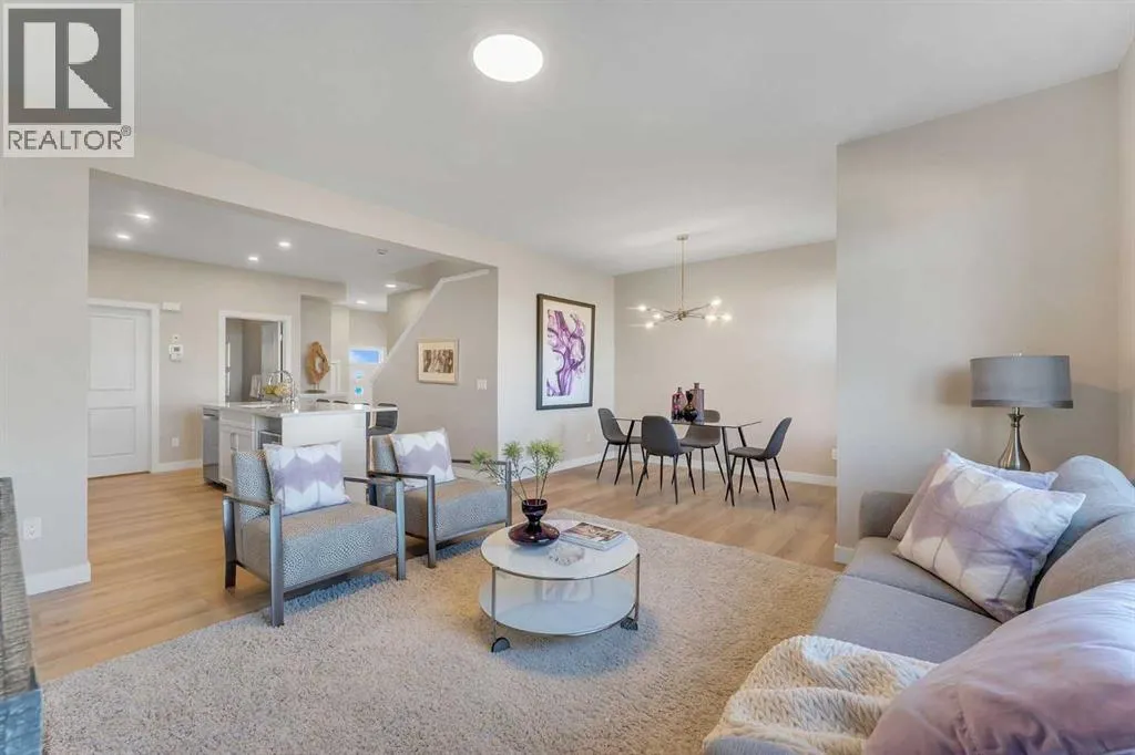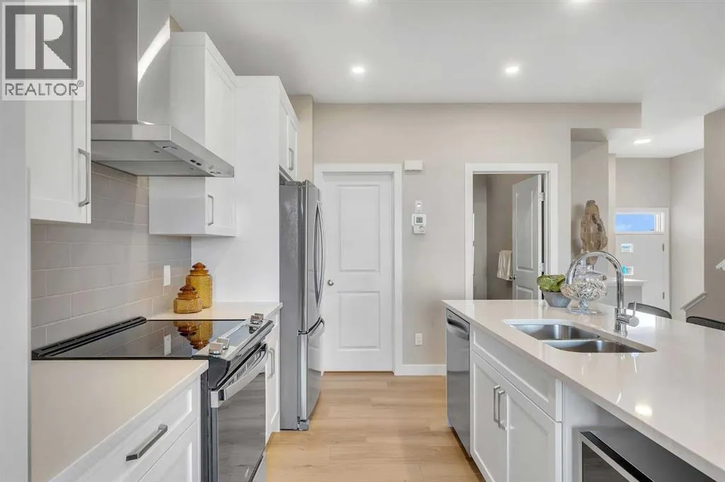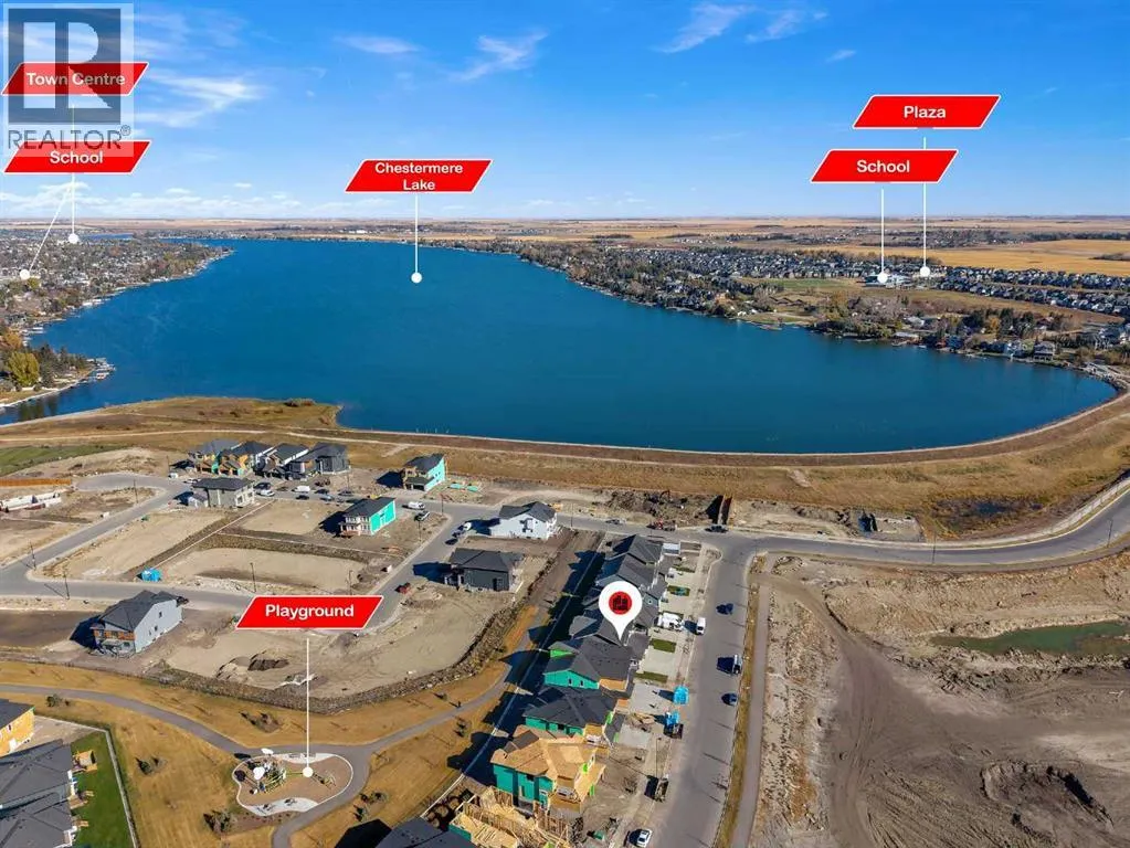 Stylish, steps to the lake, and ready for you to call home. Welcome to this beautifully appointed, 1700 sq ft brand-new Alliston at Home front-attached garage duplex, ideally located just steps from Chestermere Lake. Offering a thoughtful and functional floor plan with gorgeous finishes throughout, featuring 3 bedrooms, 2.5 bathrooms, a side entrance to the basement and backing onto a pathway with a lake view, what's not to love? Inside, the open concept kitchen, living room and dining area features wide luxury vinyl plank flooring and airy 9' ceilings, creating a bright and spacious feel. The kitchen will please the chef of the home with quartz countertops, a large island perfect for meal prep and entertaining, classic white 42" cabinets, sleek stainless steel appliances and a dedicated pantry. Triple-pane windows, which are a standard feature at Alliston Homes, flood the space with natural light. A powder room and spacious foyer with a large closet off the double attached garage complete the main level. Step outside to the sunny backyard, complete with a deck equipped with a gas line for BBQs, and enjoy lake views year-round. Whether swimming in the summer or skating in the winter, this location is all about connection to the outdoors. The spacious yard offers ample space for children or pets to play. Upstairs, the primary suite is a comfortable retreat, featuring a large walk-in closet and a spa-inspired en-suite with his and hers sinks and a spacious walk-in shower. Two additional bedrooms and a convenient laundry room complete the 2nd level. The unfinished basement with 9-foot ceilings and a side entrance offers endless potential for future development and equity-building ideas. This property is turnkey, complete with front and back landscaping and is close to schools, shopping and access to the Calgary. (id:27476)
