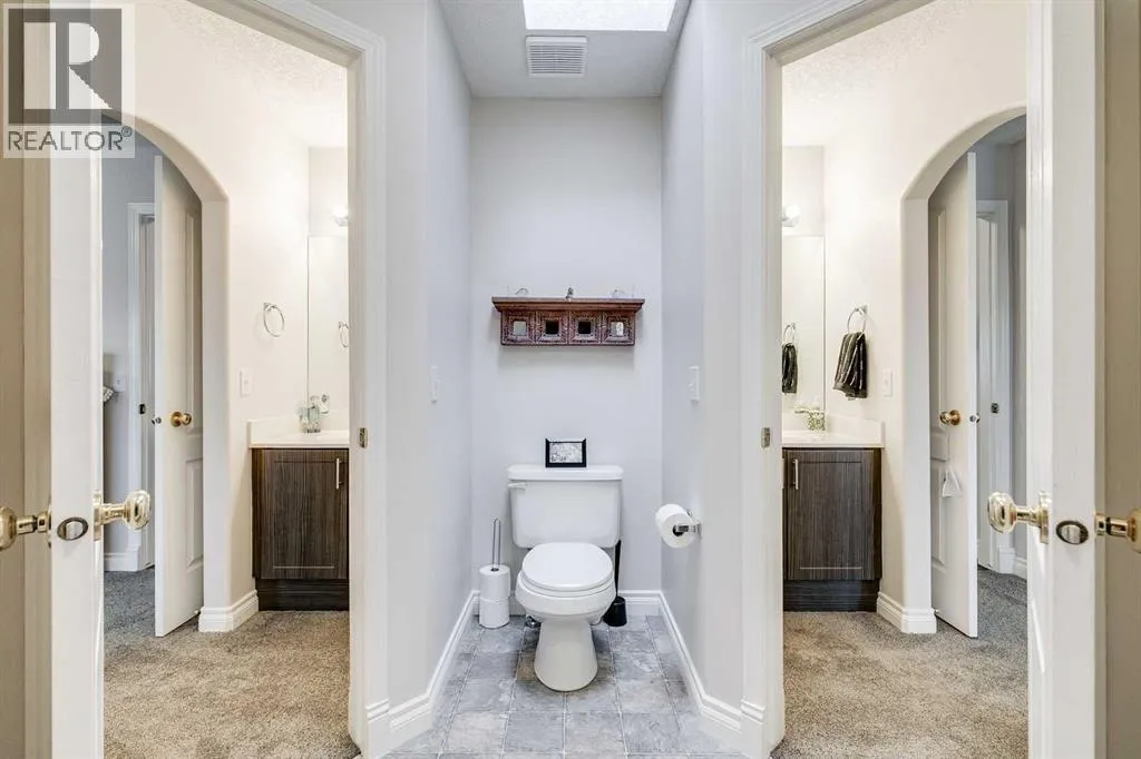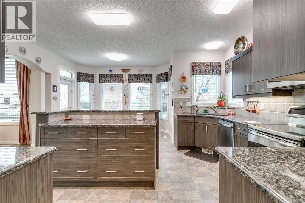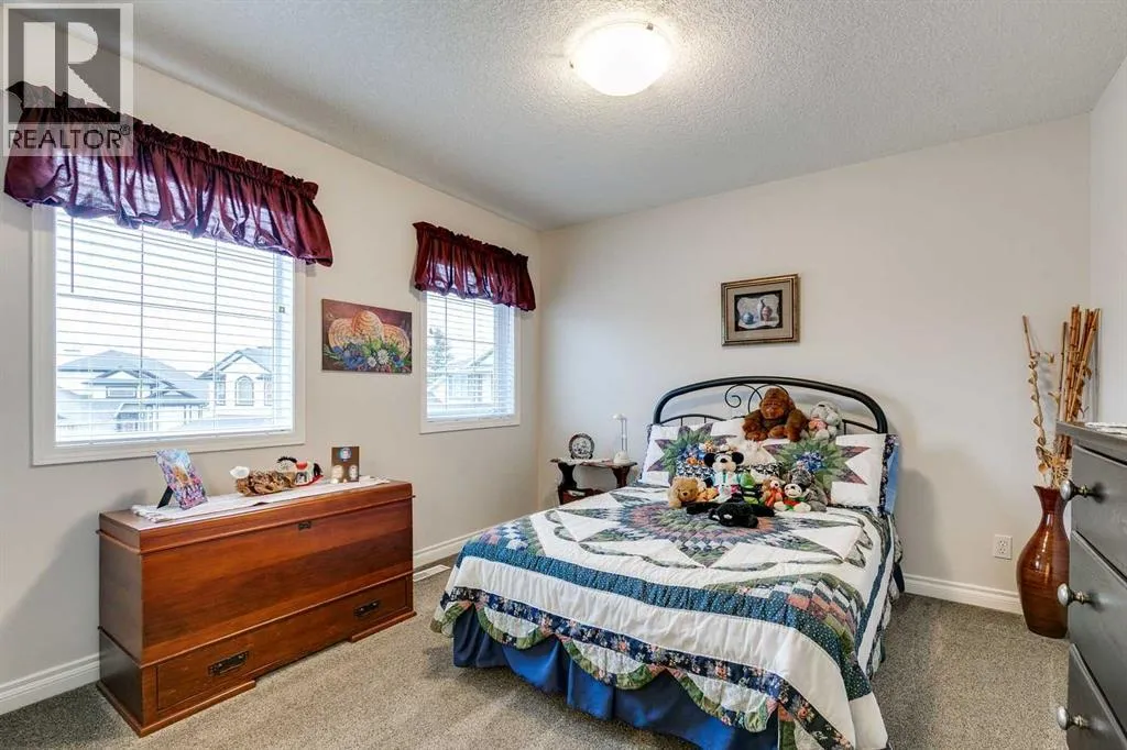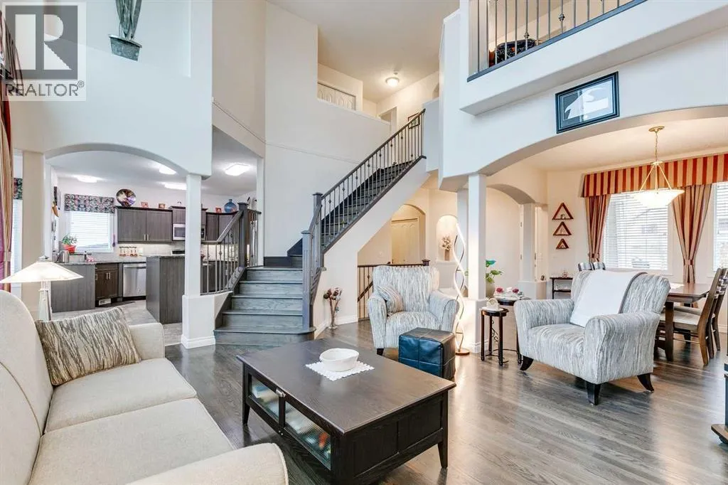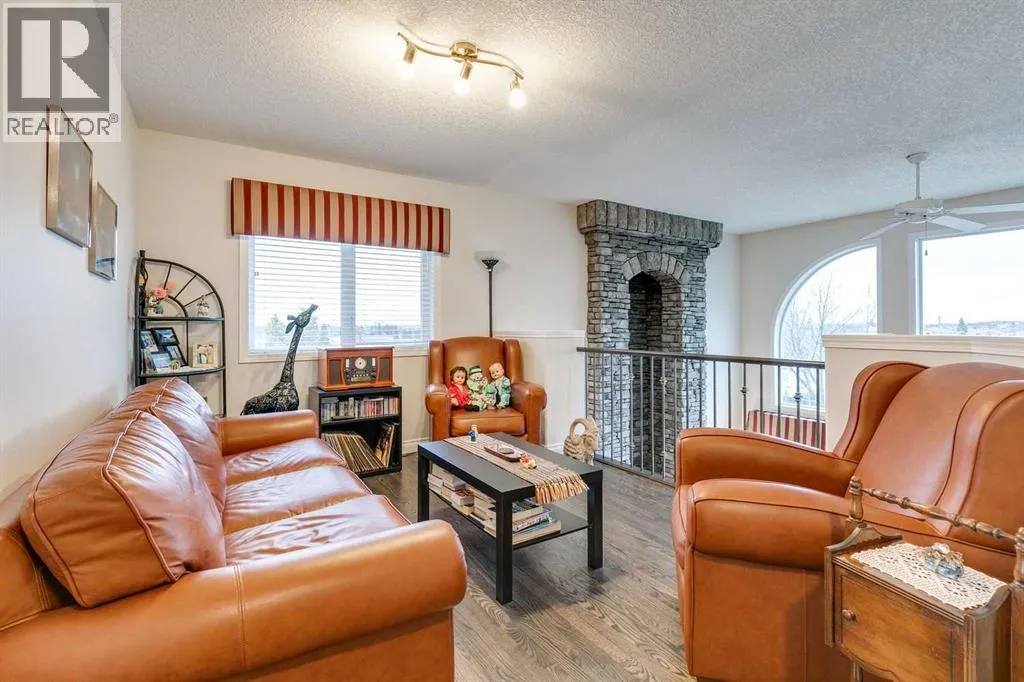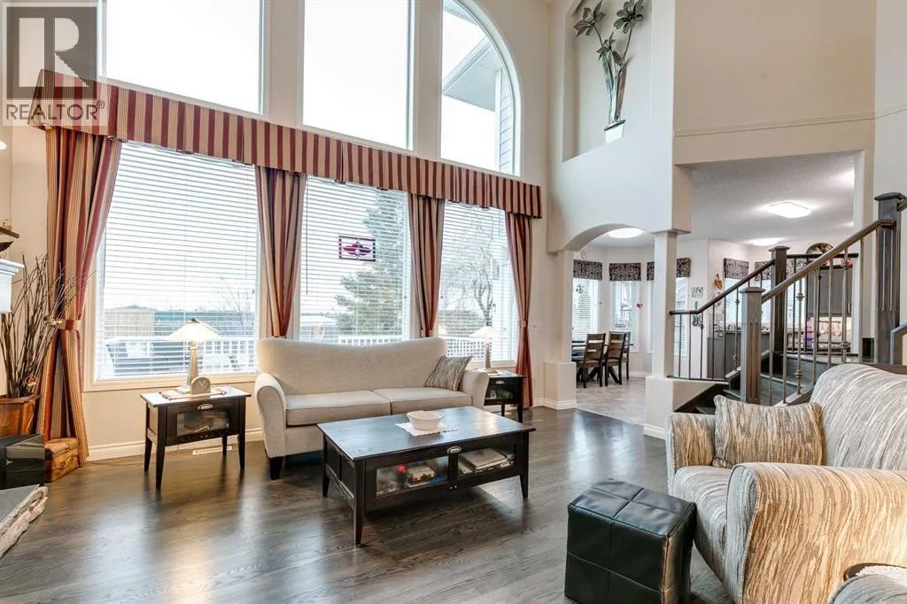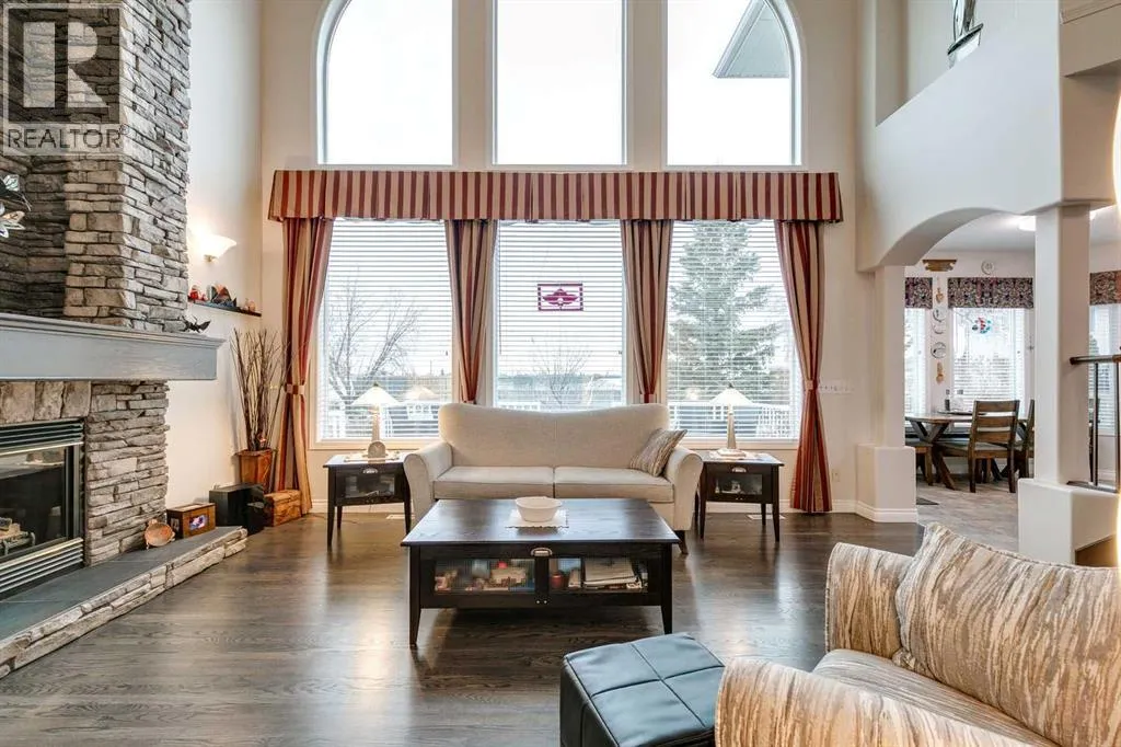 Tucked away in a quiet cul-de-sac, this beautiful home sits on a private 0.30-acre lot surrounded by mature trees, lush landscaping and gardens. From the moment you step inside, youâll notice the attention to detail and upgraded features throughout. Elegant pillars frame the formal dining room, while gleaming hardwood floors flow through the main living spaces.The living room impresses with its soaring cathedral ceiling and striking floor-to-ceiling stone fireplace â a stunning focal point for gatherings. A wall of windows offers expansive view of the back yard, and with the sunny South exposure the home has so much natural light year round. The open-concept kitchen features newer cabinetry, granite countertops, stainless steel appliances, a large island, and a walk-in pantry, offering both style and function. The breakfast nook overlooks the back gardens and is surrounded in windows. Step out the new patio door to the 23x14 low maintenance composite deck (done in 2015). The laundry is conveniently located on the main. Upstairs, a loft overlooks the main floor and provides the perfect work-from-home or reading space as there is amazing window views through the wall of windows in the main floor living area. Two spacious bedrooms share a full bathroom. One of the bedrooms has an upper balcony access-amazing. The primary suite offers a true retreat â complete with a walk in closet separate from the 4-piece ensuite featuring a walk-in shower, and a relaxing jetted tub. The fully developed lower level includes a hobby room, a large recreation area, and a family room with another fireplace. The two piece bath is plumbed for easy install of a shower where the storage cabinet is. This is the first time this home has been offered to the market and the care and attention to this home is exceptional. The garage is 23.5x19, there is rubber shingles (installed in 2015 under warranty for 50 years from install), Hardy Board siding (installed in 2015) Low E windows, Furnace and Hot Water Tank (2015), and 9 Solar Panels for energy efficiency (2023). Rear alley access and Rv parking. Don't miss out! (id:27476)