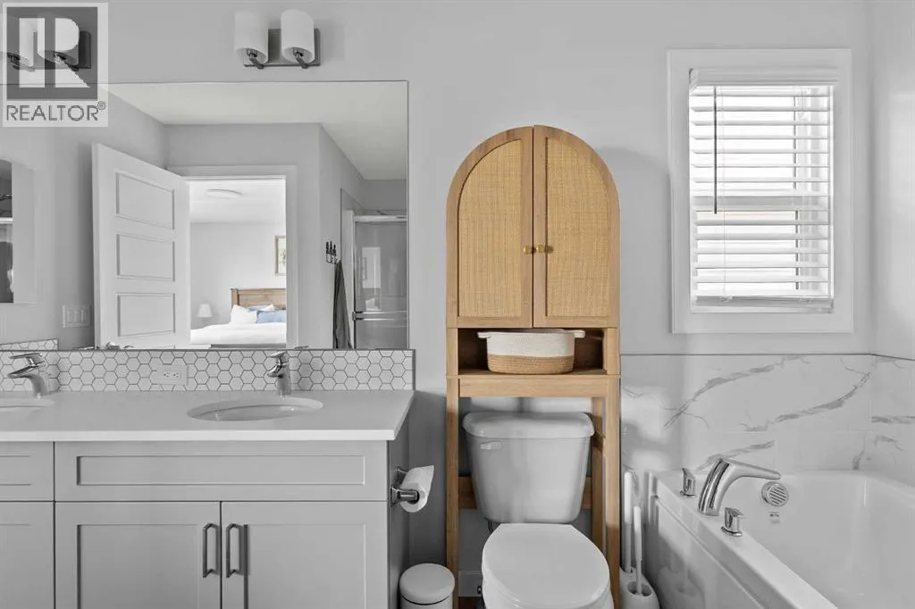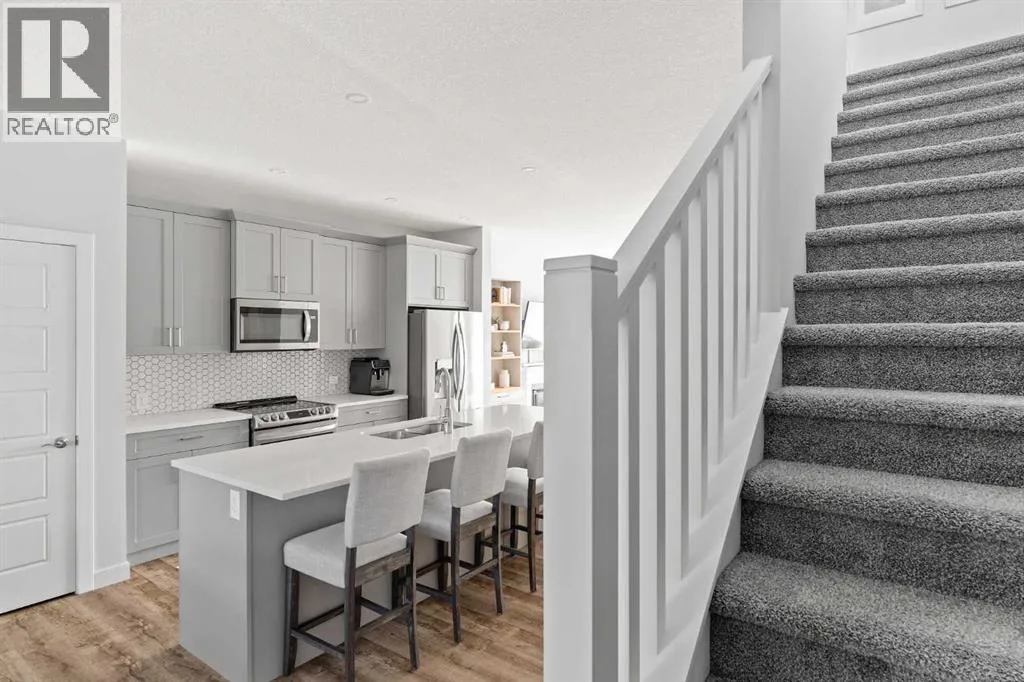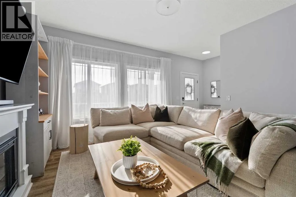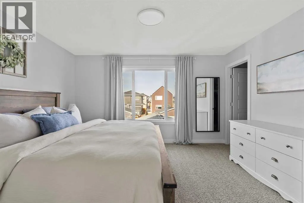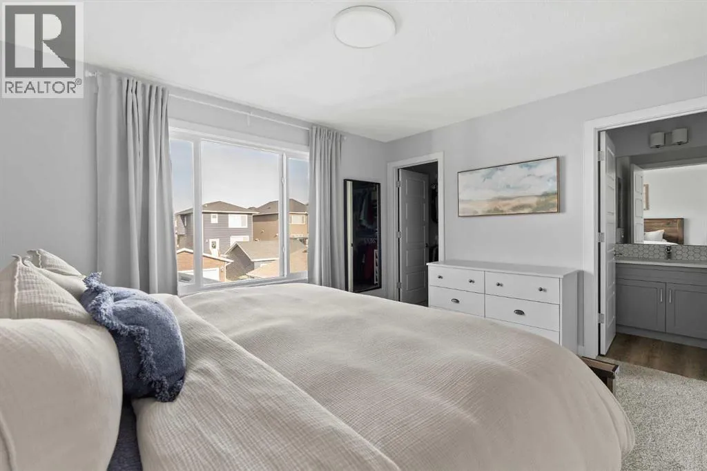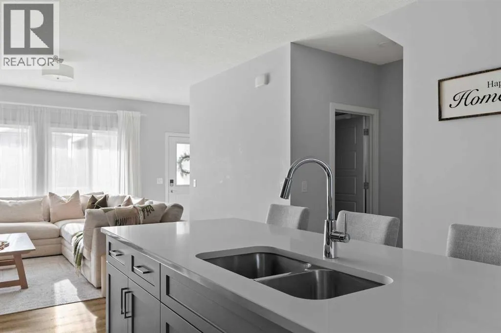 **OPEN HOUSE - SATURDAY, NOVEMBER 22nd FROM 1:00-3:00!** A pristine original-owner home in the heart of Chelsea, Chestermere - showcasing true pride of ownership and presenting as close to new as it gets. With nearly 1,650 sq. ft. of thoughtfully designed living space, this is the ideal family home offering 3 bedrooms, 2.5 bathrooms, a fully landscaped yard, a private double detached garage, and an undeveloped basement with rough-ins ready for your future vision. The open-concept main level is anchored by a stunning central kitchen, creating the perfect flow for both everyday living and entertaining. Finished with timeless light grey shaker cabinetry, an oversized quartz island, and a full suite of upgraded stainless-steel appliances, this kitchen is as functional as it is beautiful. A south-facing front great room is bathed in natural light through a wall of windows, while the expansive ~14' x 10' dining area at the rear comfortably accommodates any dining setup and overlooks the private backyard. A convenient powder room and large closets at both the front and back entrances complete the main level. On the upper level, the impressive ~14' x 12' primary suite easily fits a king-sized bed and additional furniture. Itâs complete with a luxurious 5-piece ensuite featuring dual sinks, a soaker tub, a walk-in shower, and a generous walk-in closet with space for two. Two comfortable secondary bedrooms sit at the opposite end of the home, separated by a large main bathroom and an upper-level laundry room - an ideal layout for privacy and practicality. Outside, the property is fully landscaped, fenced, and completely move-in ready - saving you the time and cost typically associated with new construction. Enjoy multiple outdoor living spaces, including a charming full-width covered front porch to capture the south sun, and a large rear deck with gas line and pergola overlooking the private yard. The double detached garage provides secure parking and extra storage year-round - an especially appreciated benefit during the winter. Perfectly positioned within walking distance to parks, schools, and local amenities, while still only a quick drive to Calgary, this home delivers convenience, comfort, and exceptional value in the vibrant community of Chelsea in Chestermere. A truly move-in-ready home that combines thoughtful design, modern finishes, and unbeatable location - this is one you wonât want to miss. (id:27476)