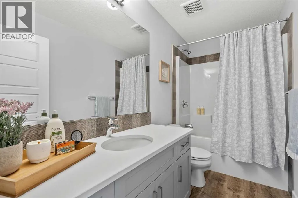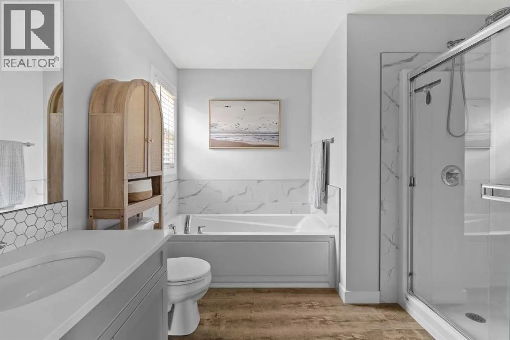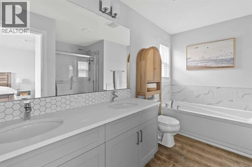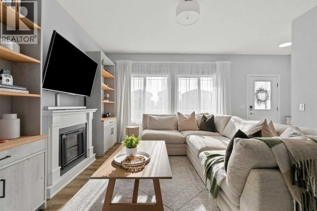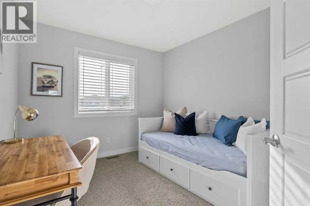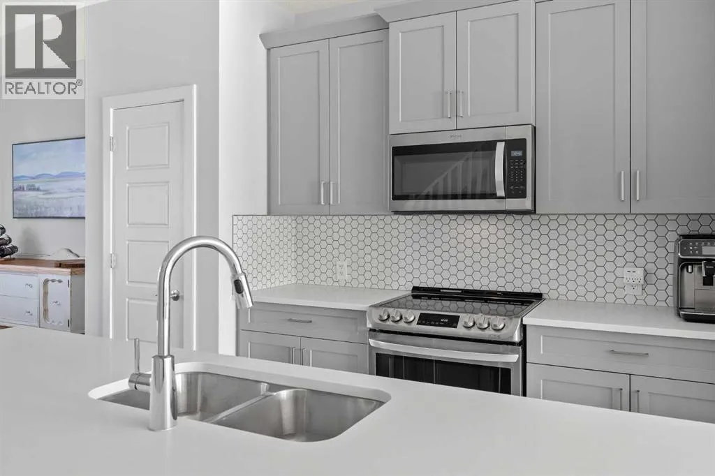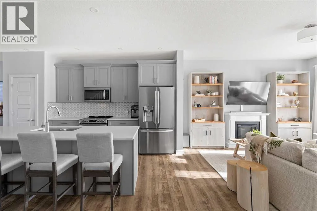 **OPEN HOUSE - SATURDAY, NOVEMBER 22nd FROM 1:00-3:00!** A pristine original-owner home in the heart of Chelsea, Chestermere - showcasing true pride of ownership and presenting as close to new as it gets. With nearly 1,650 sq. ft. of thoughtfully designed living space, this is the ideal family home offering 3 bedrooms, 2.5 bathrooms, a fully landscaped yard, a private double detached garage, and an undeveloped basement with rough-ins ready for your future vision. The open-concept main level is anchored by a stunning central kitchen, creating the perfect flow for both everyday living and entertaining. Finished with timeless light grey shaker cabinetry, an oversized quartz island, and a full suite of upgraded stainless-steel appliances, this kitchen is as functional as it is beautiful. A south-facing front great room is bathed in natural light through a wall of windows, while the expansive ~14' x 10' dining area at the rear comfortably accommodates any dining setup and overlooks the private backyard. A convenient powder room and large closets at both the front and back entrances complete the main level. On the upper level, the impressive ~14' x 12' primary suite easily fits a king-sized bed and additional furniture. Itâs complete with a luxurious 5-piece ensuite featuring dual sinks, a soaker tub, a walk-in shower, and a generous walk-in closet with space for two. Two comfortable secondary bedrooms sit at the opposite end of the home, separated by a large main bathroom and an upper-level laundry room - an ideal layout for privacy and practicality. Outside, the property is fully landscaped, fenced, and completely move-in ready - saving you the time and cost typically associated with new construction. Enjoy multiple outdoor living spaces, including a charming full-width covered front porch to capture the south sun, and a large rear deck with gas line and pergola overlooking the private yard. The double detached garage provides secure parking and extra storage year-round - an especially appreciated benefit during the winter. Perfectly positioned within walking distance to parks, schools, and local amenities, while still only a quick drive to Calgary, this home delivers convenience, comfort, and exceptional value in the vibrant community of Chelsea in Chestermere. A truly move-in-ready home that combines thoughtful design, modern finishes, and unbeatable location - this is one you wonât want to miss. (id:27476)