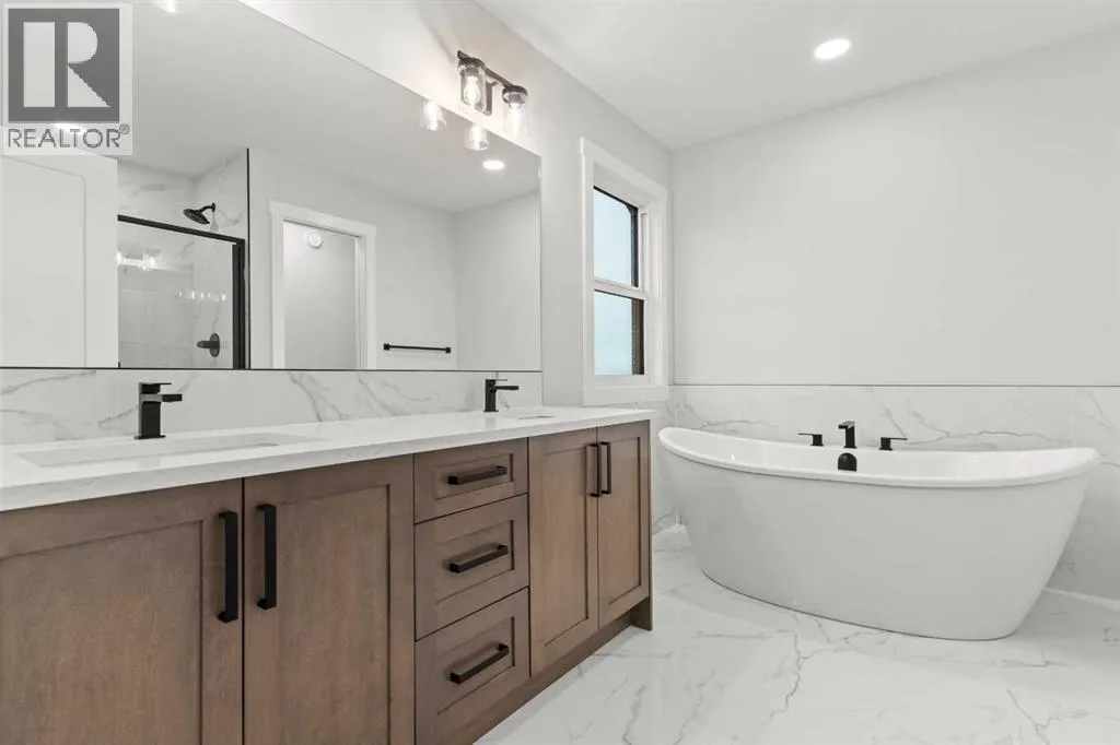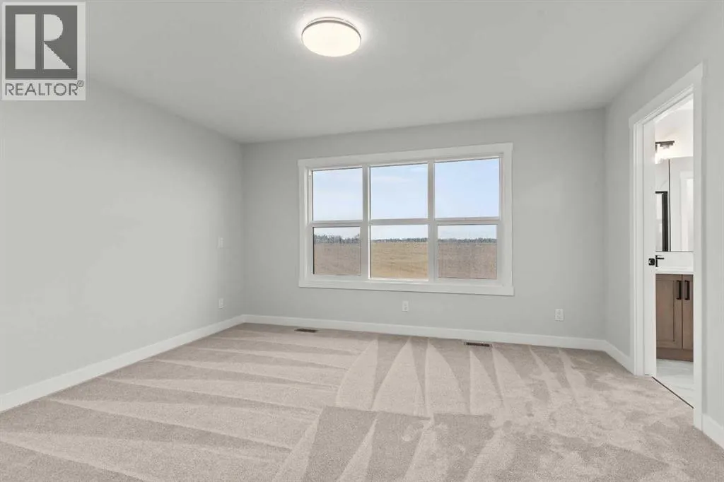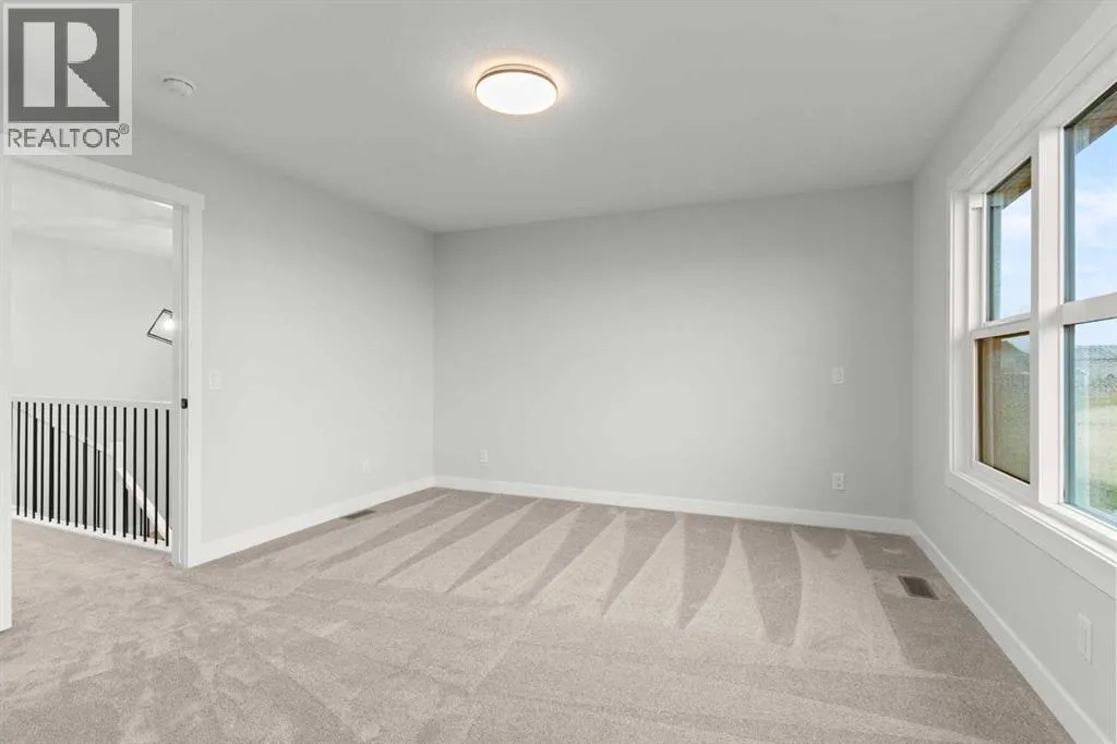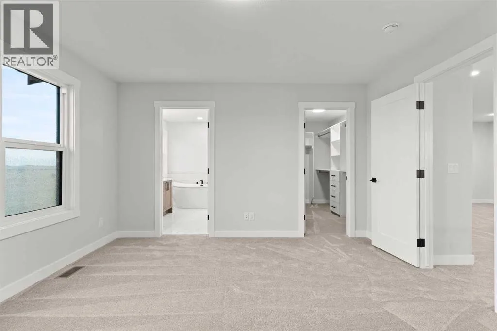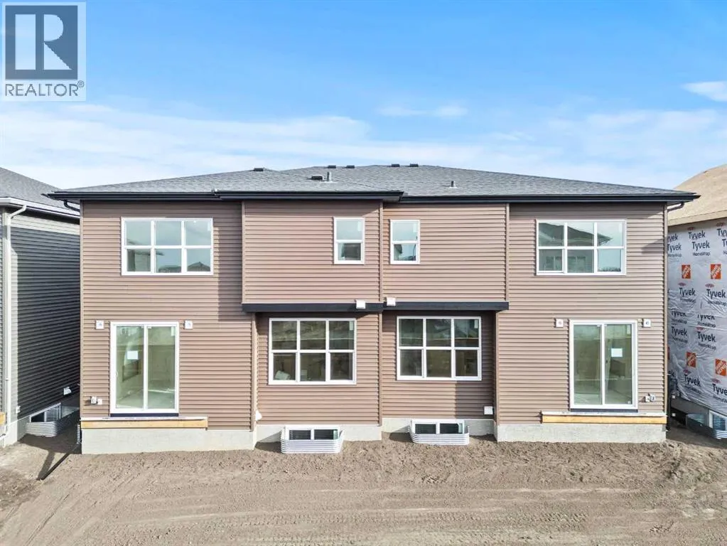 This beautifully designed 2134 SQFT semi-detached home, built by 5-star builder Golden Homes, sits on a conventional lot with an oversized double car front-attached garage, offering the perfect combination of functionality and modern craftsmanship in one of Chestermereâs most desirable communities.The main floor welcomes you with 9-foot ceilings, 8-foot doors, and an open-concept layout thatâs both spacious and practical. The heart of the main floor is the upgraded kitchen, featuring two-tone cabinetryâChantilly Lace white perimeter cabinets and a light wood islandâquartz countertops in the kitchen and throughout the home, soft-close drawers with metal sides, and upgraded Samsung stainless steel appliances. The main floor also features a built-in microwave with a luxury stainless steel trim and a walk-in pantry with built-in shelves, ideal for storing everything from food to small appliances and dishware.The main level continues with a large dining area filled with light from the oversized triple-pane windows, a cozy living room with an electric fireplace, and glass sliding doors that lead to your backyard. Additional highlights include a half bath, side entrance, and a finished staircase to the basement, offering endless future development opportunities. The basement is fully roughed-in and includes a separate mechanical room for added safety and convenience.Making your way upstairs, youâre greeted by an oversized staircase with iron spindle railings and an open-to-below feature that adds even more space and light. The primary bedroom offers luxury finishings with a 5-piece ensuite, showcasing a fully tiled shower with glass doors, freestanding tub, double vanity, and a private enclosed toilet. The walk-in closet is custom-designed with built-in drawers and shelving.Two additional bedrooms each have their own walk-in closets and share a well-designed Jack & Jill bathroom with a double vanity and a separated toilet/shower spaceâperfect for daily convenience. The upper level also includes a laundry room with quartz countertop and shelving.Located in the family-friendly neighborhood of Kinniburgh South, this is your opportunity to own a brand new, thoughtfully upgraded home close to schools, parks, and everyday amenities an be part of the Golden Homes family! Pictures of same model. Selection specification are subject to change. (id:27476)
