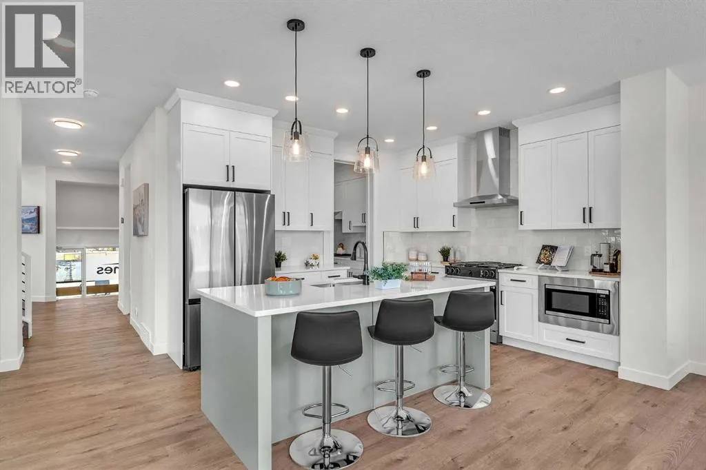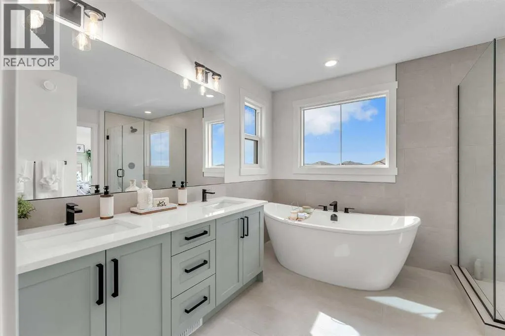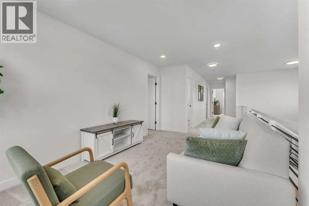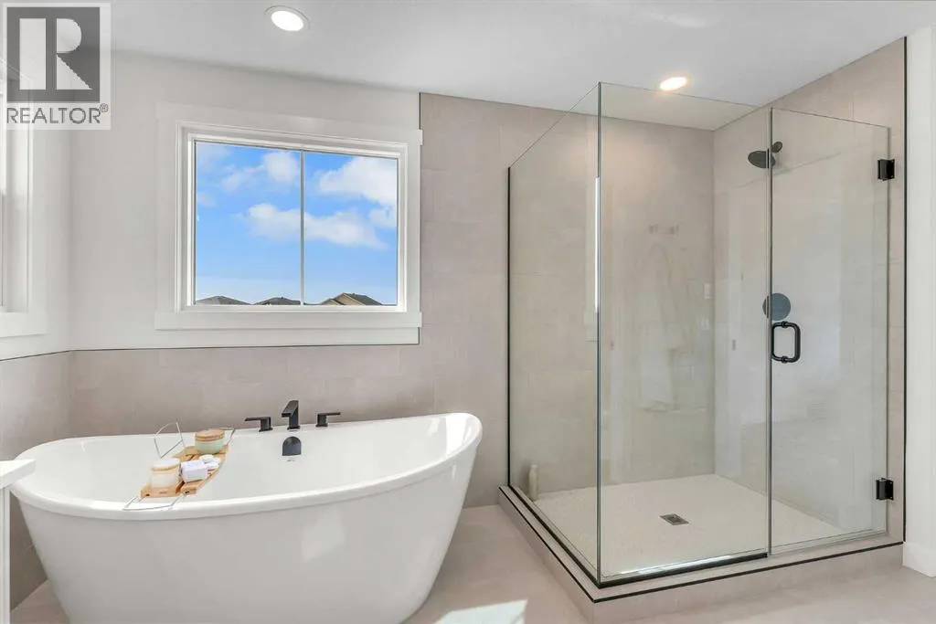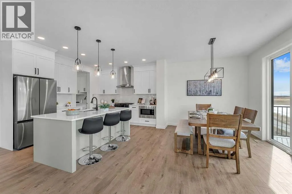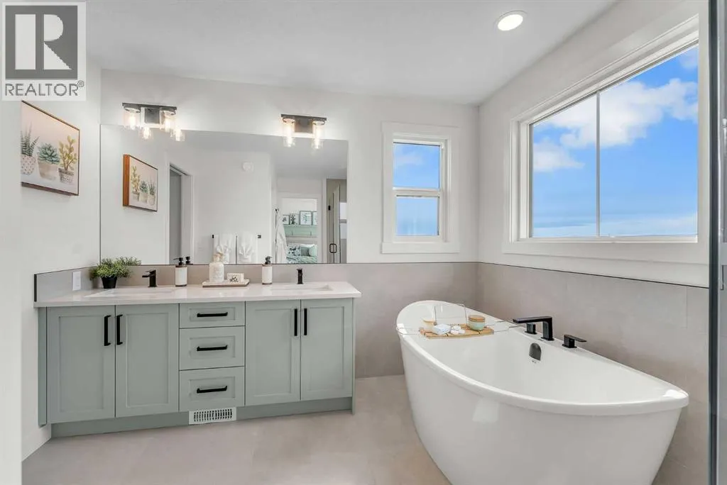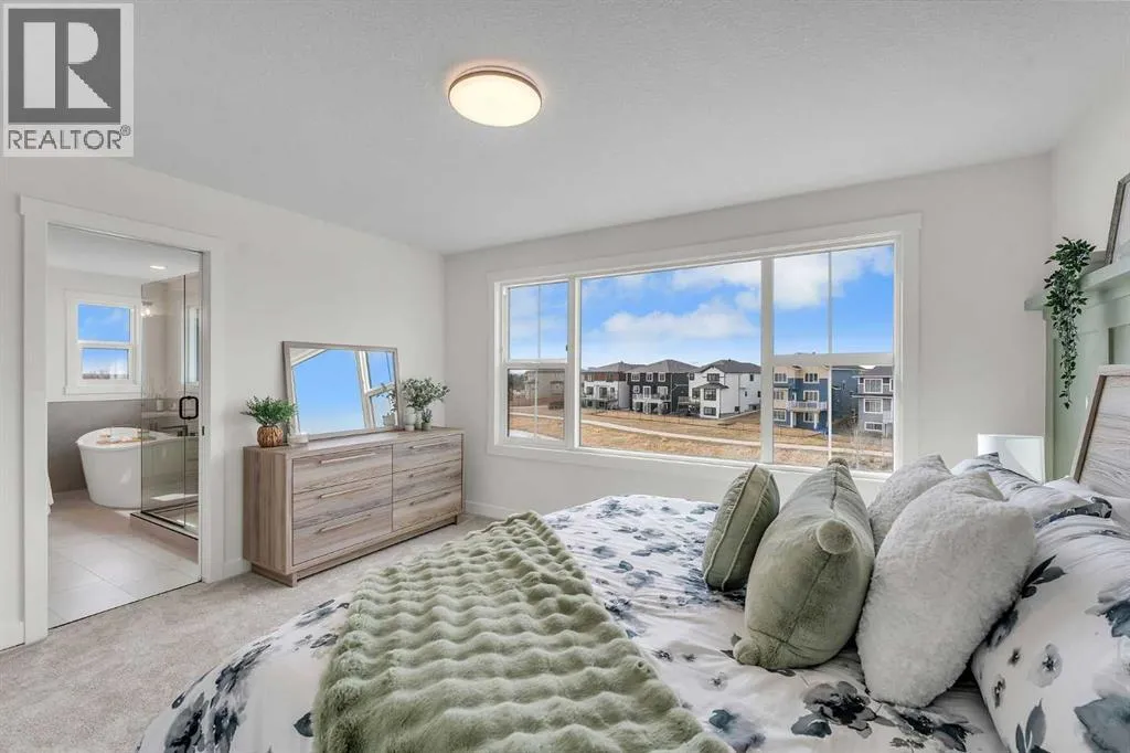 Welcome to 267 Kinniburgh Loop, a truly exceptional luxury home offering 3,294 sq. ft. of living space, 6 bedrooms, 4 full bathrooms, and a fully finished basement and Spice Kitchen. This home has been thoughtfully designed for both everyday living and entertaining. From the moment you arrive, youâre welcomed by an impressive oversized front door and a spacious, open entry that immediately sets the tone for the quality found throughout the home. Just off the foyer is a large main-floor bedroom or office, conveniently connected to a full bathroom with a standing showerâideal for guests or multigenerational living. Pictures of similar model home spec subject to change.As you move further into the home, youâll be captivated by the stunning chefâs kitchen featuring a nearly 9-foot island, quartz countertops, stainless steel appliances, full-height cabinetry, and high-end luxury finishes. The main floor is completed by a spacious living room with an electric fireplace, dining area, spice kitchen, and a walk-through mudroom with direct access to the garage. Everyday convenience is elevated with three main-floor closets, including two in the kitchen and one in the mudroom.Upstairs, a generous bonus room and sitting area create the perfect secondary living space. The expansive primary bedroom offers breathtaking pond views and connects to a spa-inspired 5-piece ensuite featuring dual vanities, a large glass shower with mosaic tile base, a freestanding tub, and a private toilet room. The ensuite flows seamlessly into the laundry room, which also offers access back to the bonus room for added functionality. The upper level is completed by two additional large bedrooms and another beautifully finished 5-piece bathroom, with no dropped beams on the main or upper floors for a clean, open feel.The fully finished basement extends the homeâs versatility with two more spacious bedrooms, a large wet bar with fridge, and an additional washer and dryer hookupâideal for extended f amily or entertaining. This home includes all of the renowned Golden Homes standards, such as true 9-foot ceilings on both the main floor and basement, triple-pane windows, side entry, matte black iron spindle railings, matte black hardware and fixtures, built-in shelving in the pantry and primary walk-in closet, upgraded carpet underlay, a tankless hot water heater, smart home features, gas lines to both the deck and garage, and a solar panel rough-in. The exterior is fully landscaped with the lot graded and loamed, sod installed to the side entry, and a front yard tree. (id:27476)