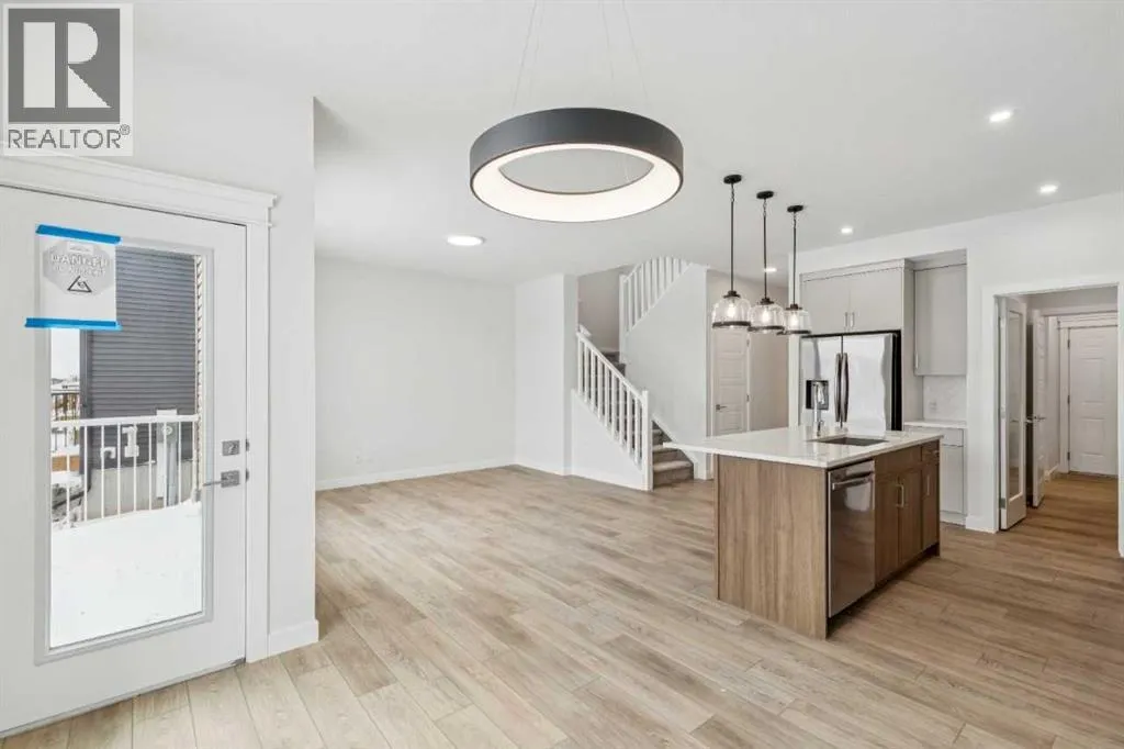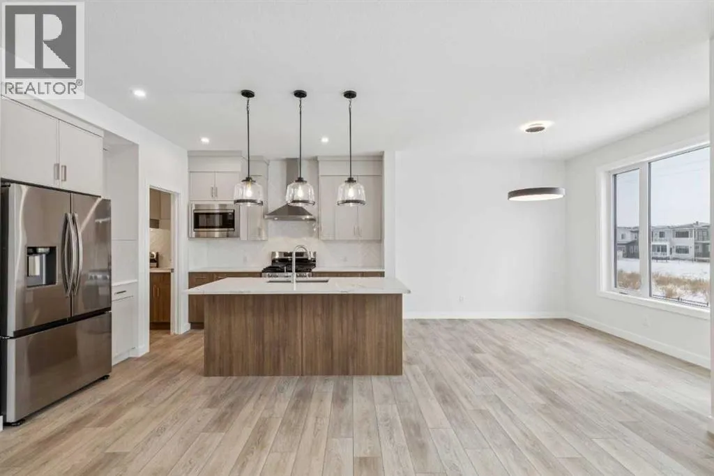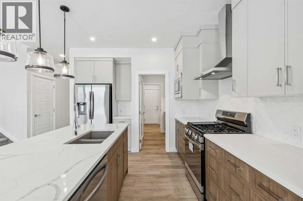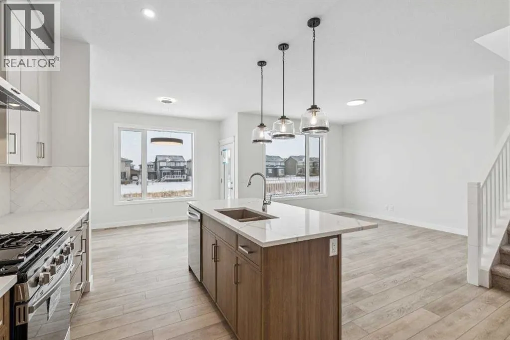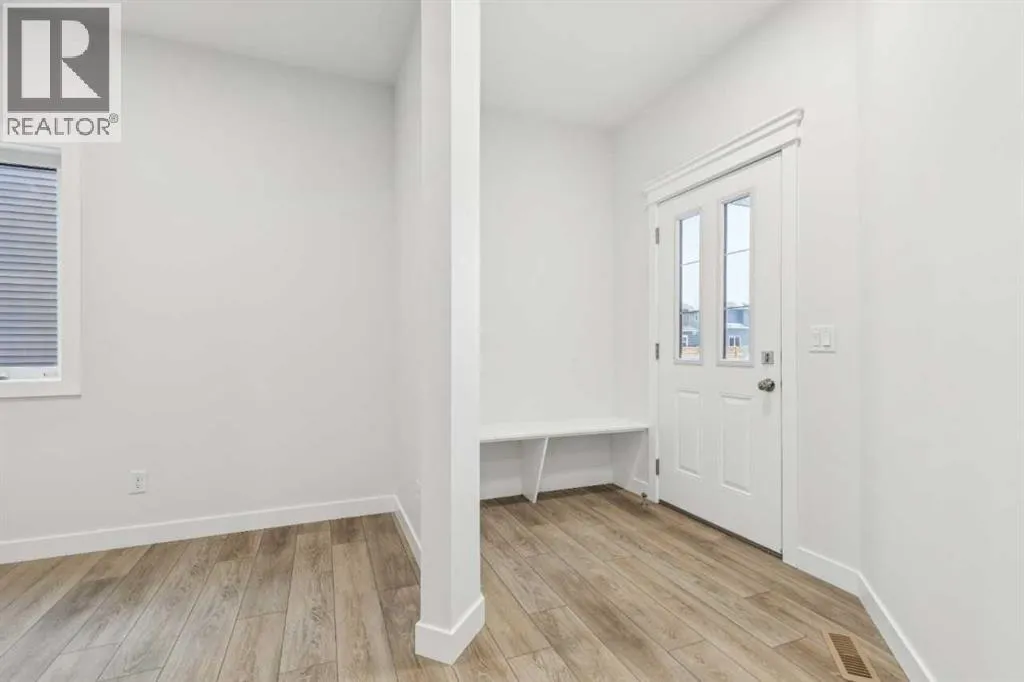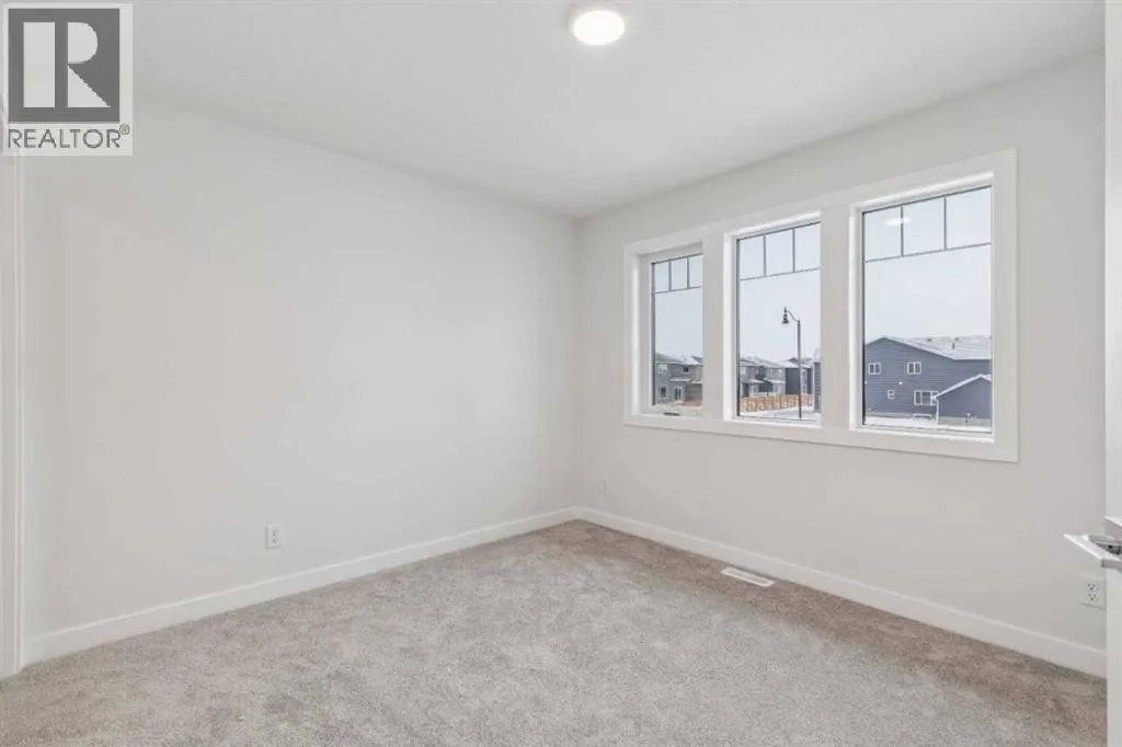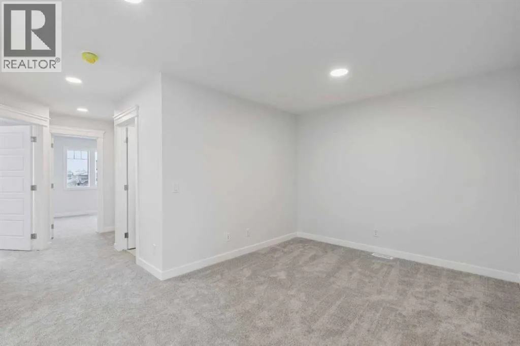Welcome to The Mitchell by NuVista Homes, located at 257 Dawson Wharf Road in the desirable community of Dawsonâs Landing, Chestermere. This thoughtfully designed 1,874 sq ft home offers 3 bedrooms and 2.5 bathrooms with a functional layout ideal for modern family living. The main floor features 9â foundation and ceiling heights, luxury vinyl plank flooring, a flex room, and a bright great room that flows into a well-appointed kitchen with quartz countertops, taller upper cabinets, and a dedicated spice kitchen. Both the mudroom and front foyer include built-in benches for added everyday convenience. Upstairs, the primary bedroom includes a walk-in closet and private ensuite, complemented by two additional bedrooms, a full bathroom, a media room, and upper-floor laundry. A side entrance provides excellent future basement development potential, while the 12â x 10â rear deck is perfect for summer enjoyment. (id:27476)